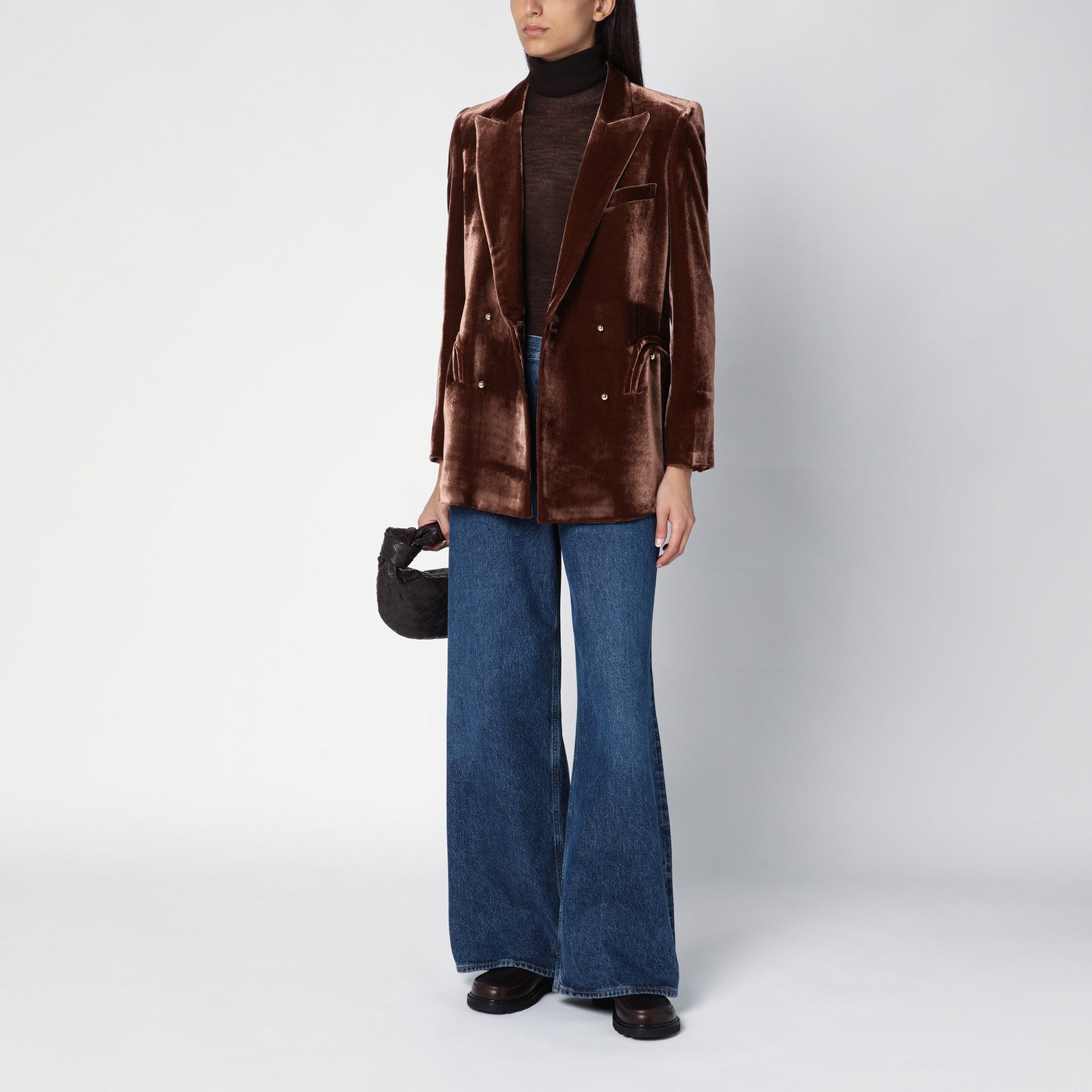 Giacca in velluto a miscela di lino in bronzo di Blazè Milano. Design a doppio petto, con un fissaggio a bottone anteriore, maniche lunghe, polsini abbottonati, risvolti a picco, una sfiato posteriore e tre tasche a forcella sul davanti.