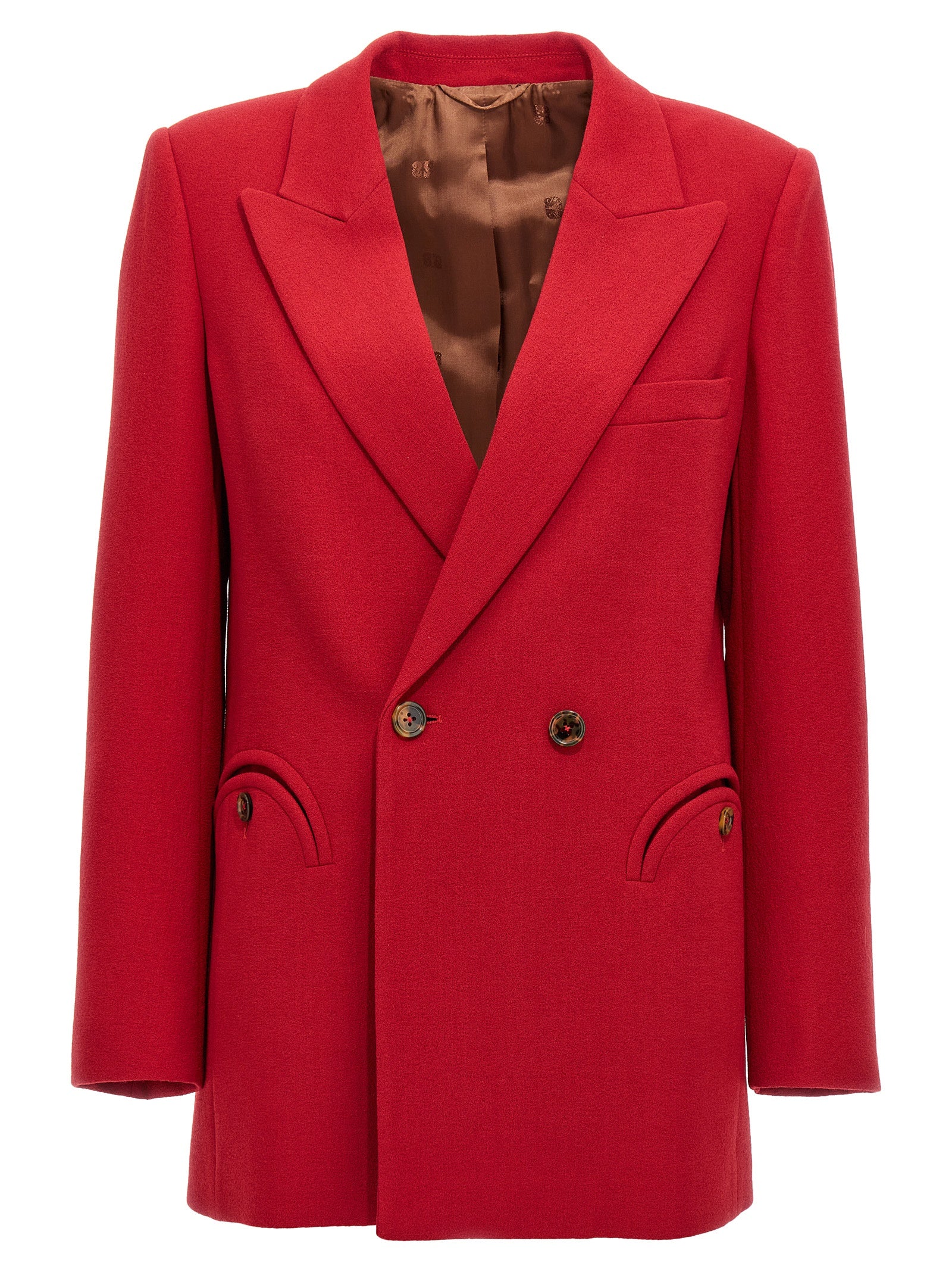 Blazer di lana a doppio petto "cool e facile quotidiano" con chiusura a bottone, tasche, spalle leggermente imbottite, maniche lunghe, sfiato posteriore.