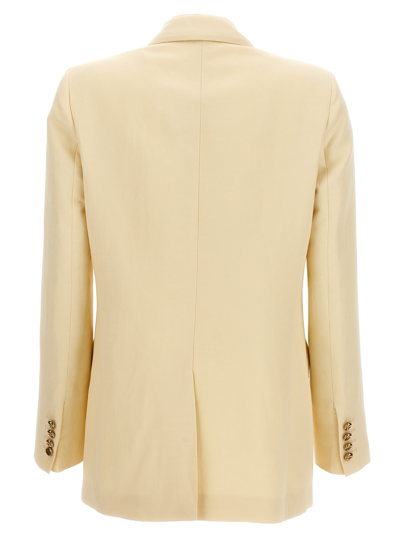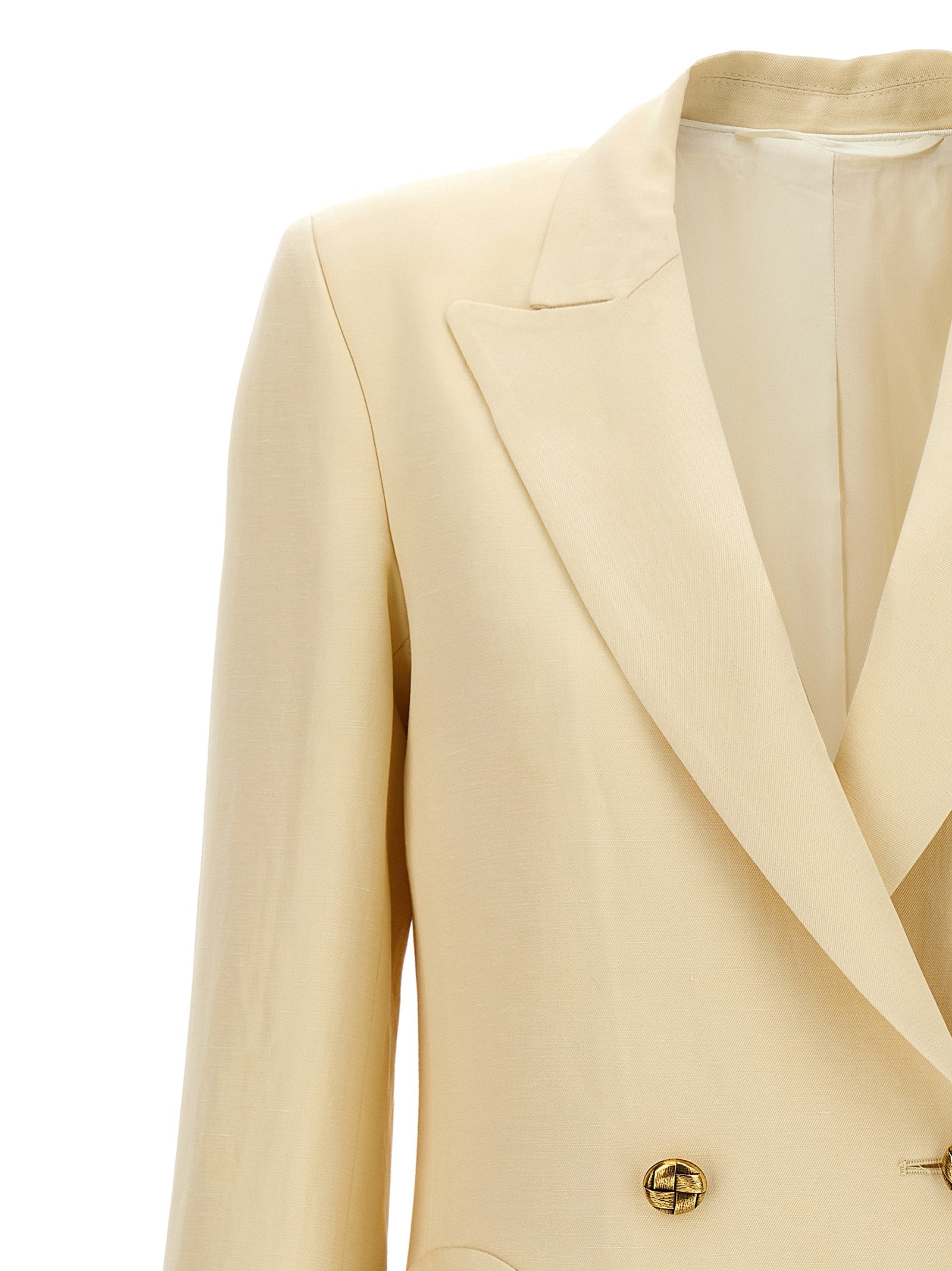 Lana a doppio petto e blazer di seta a doppio petto di "Savannah Butter" con chiusura a bottoni, tasche, maniche lunghe e spalle posteriore.