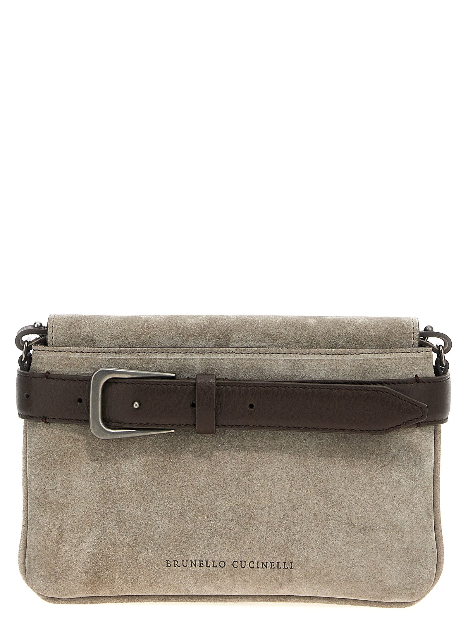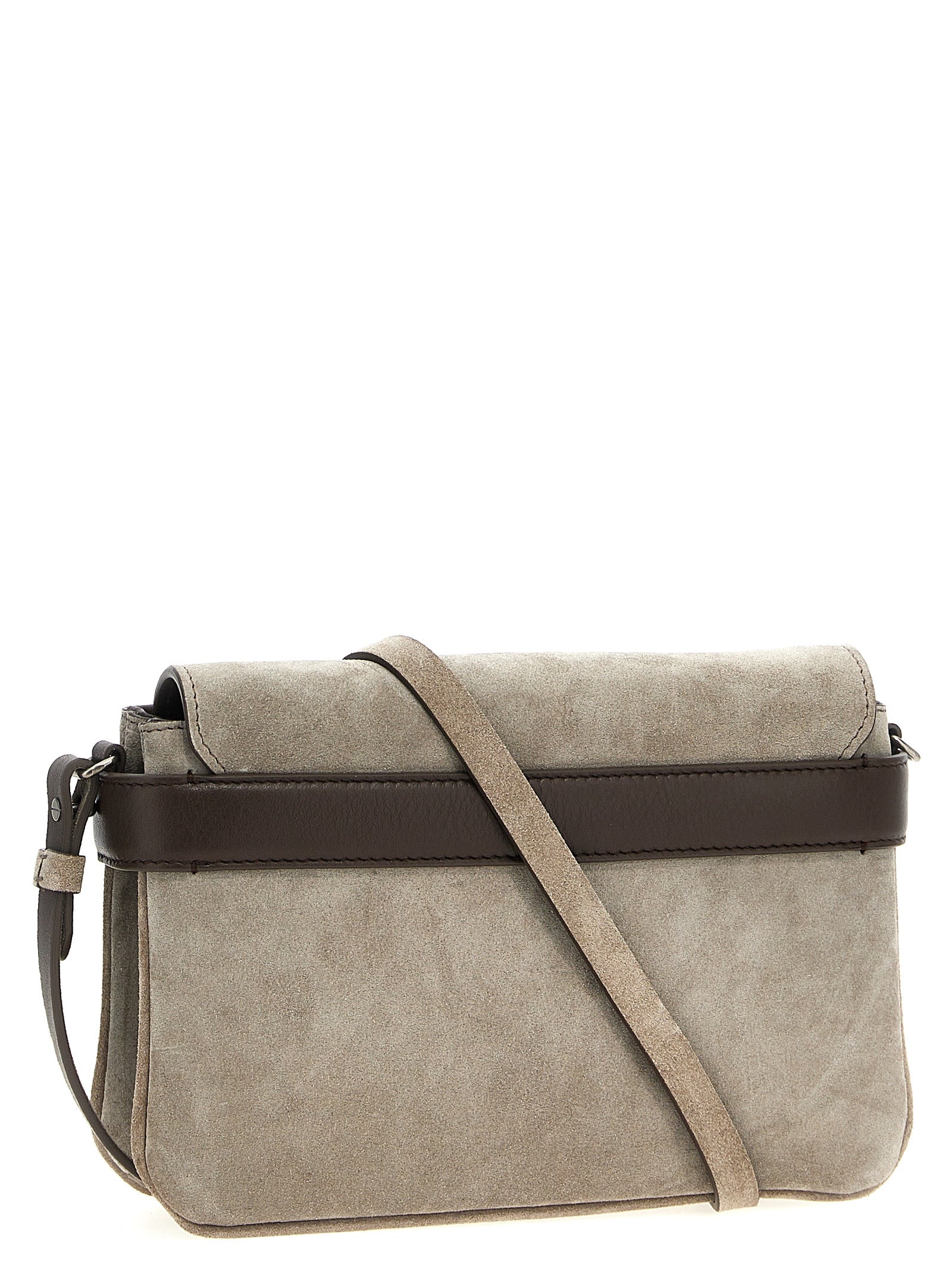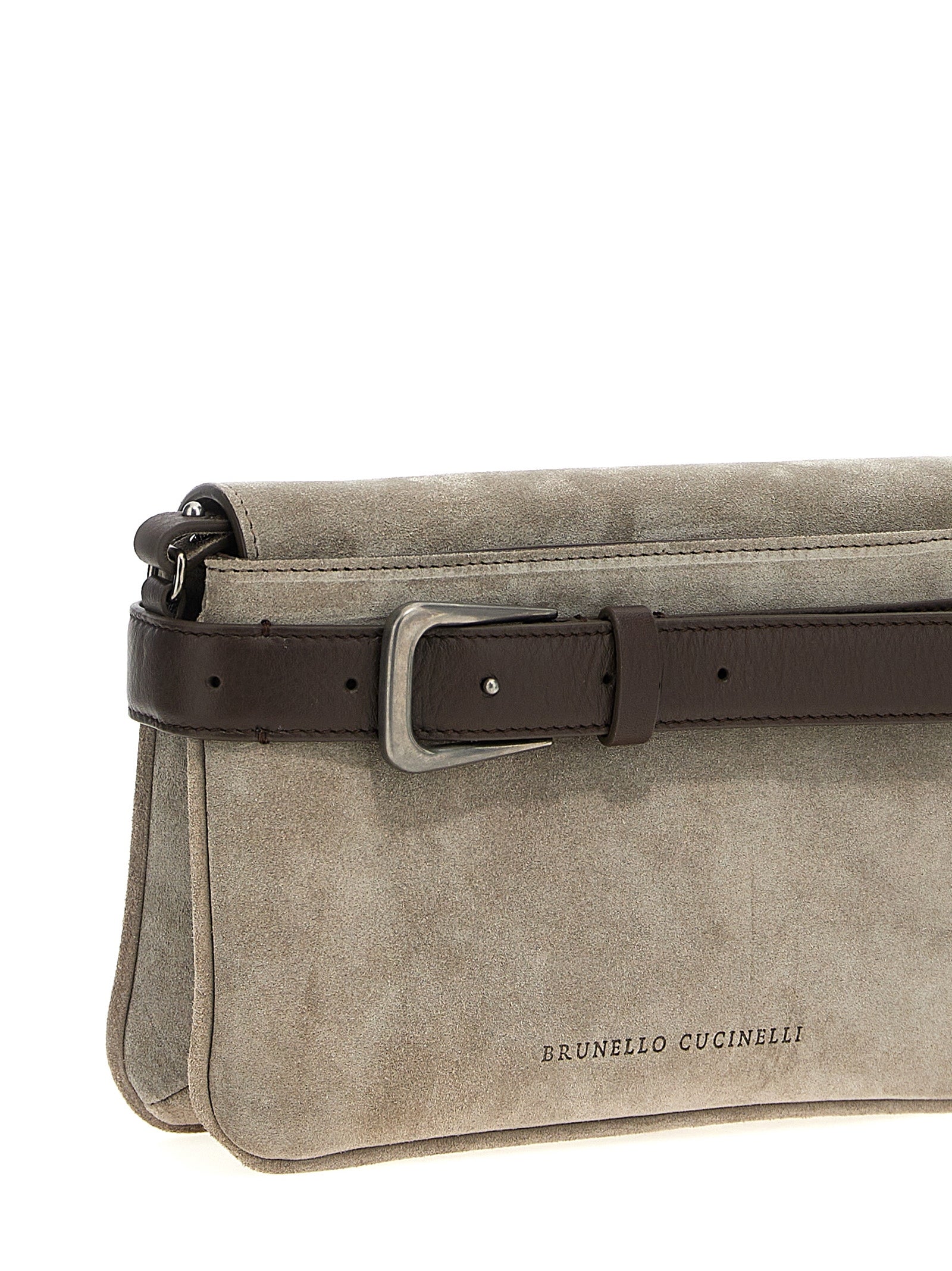 Borsa a tracolla in pelle scamosciata con "dettaglio della cinghia" in pelle e fibbia di metallo, chiusura magnetica, tracolla regolabile e rimovibile.