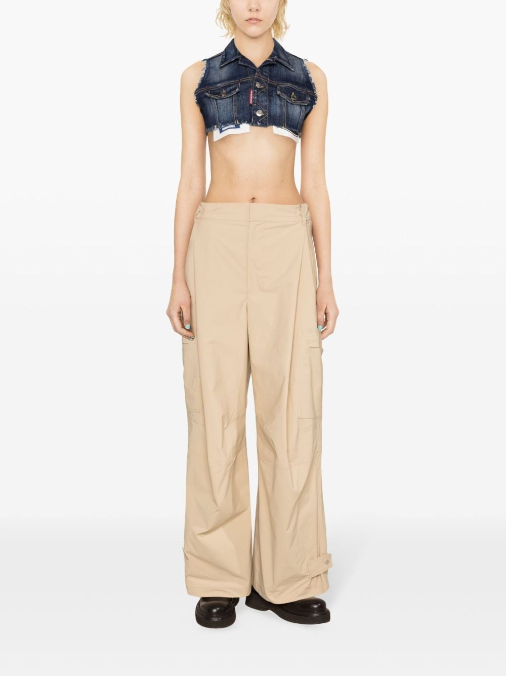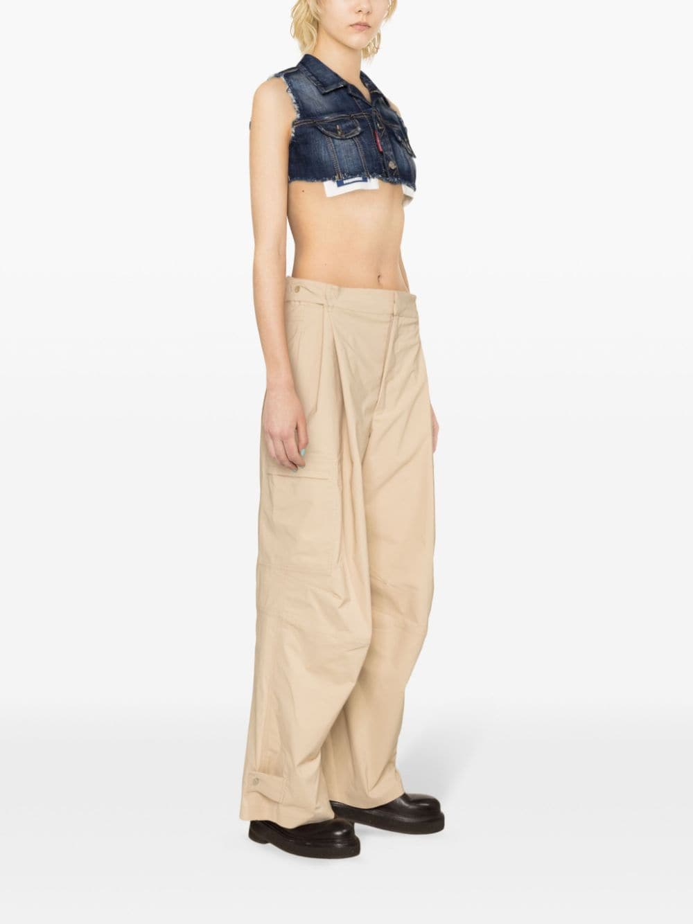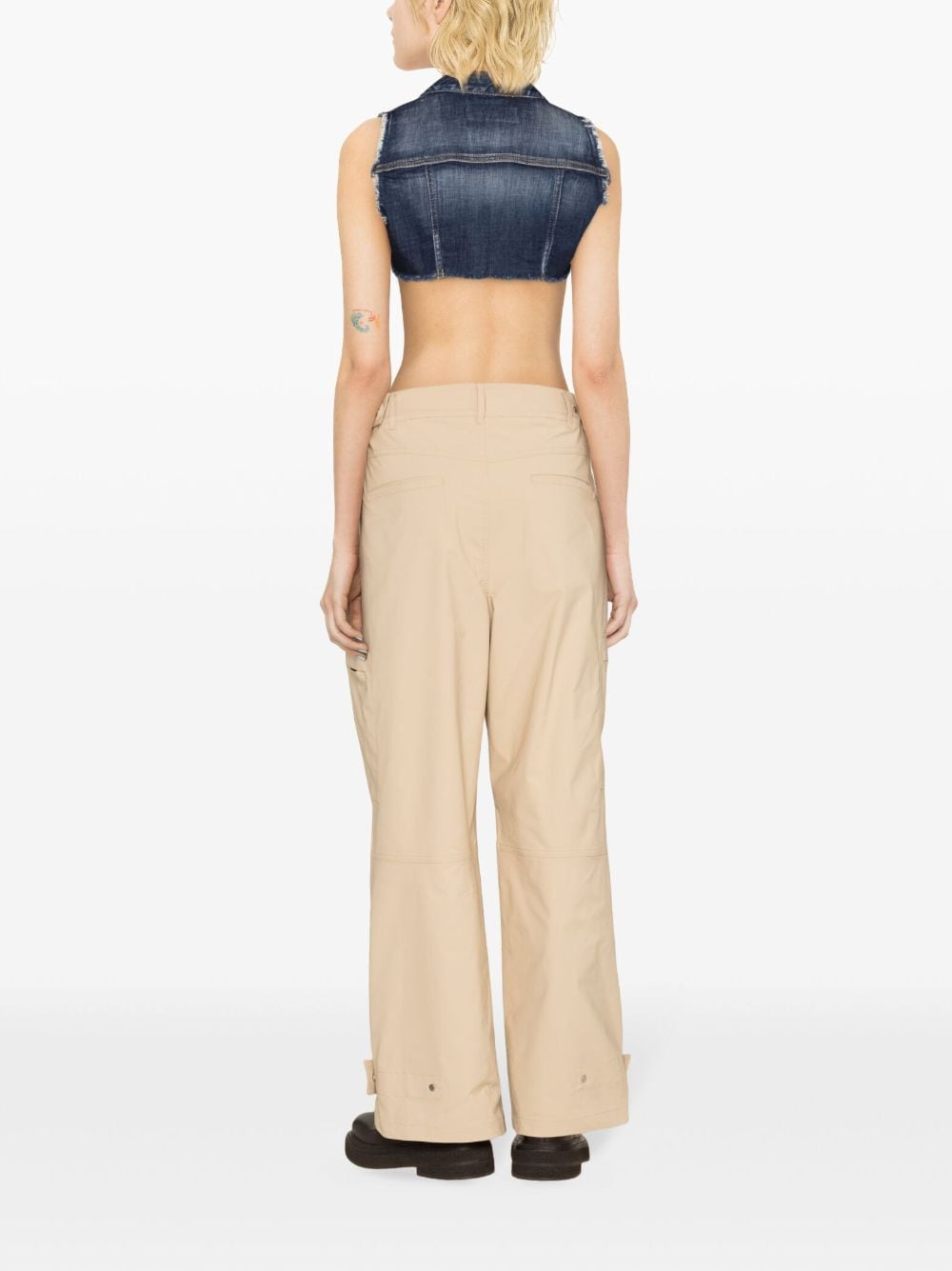 cotone blu indaco denim tacino crudo allaccia al collo anteriore fissaggio senza manica due tasche a lempe toraciche ritagliate
