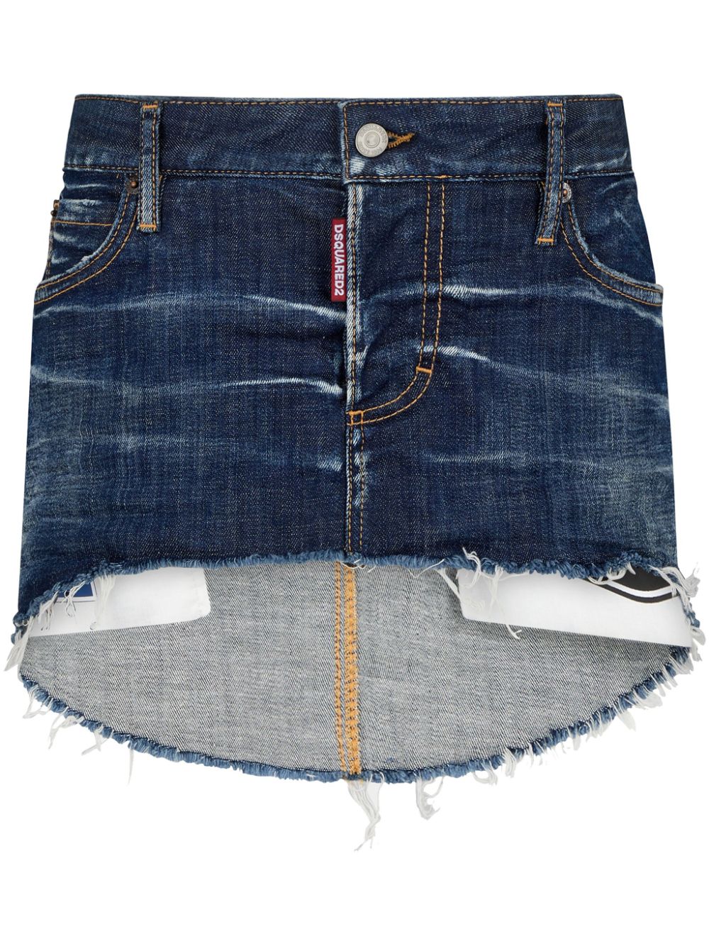 Gonna in denim logo-tag di Dsquared2 con Blue indaco, miscela di cotone, denim lavato, tag mini logo, patch di logo sul retro, bassi, anelli della cinghia, pulsante frontale e fissaggio con zip, classiche tasche a cinque e orlo sfilacciato.