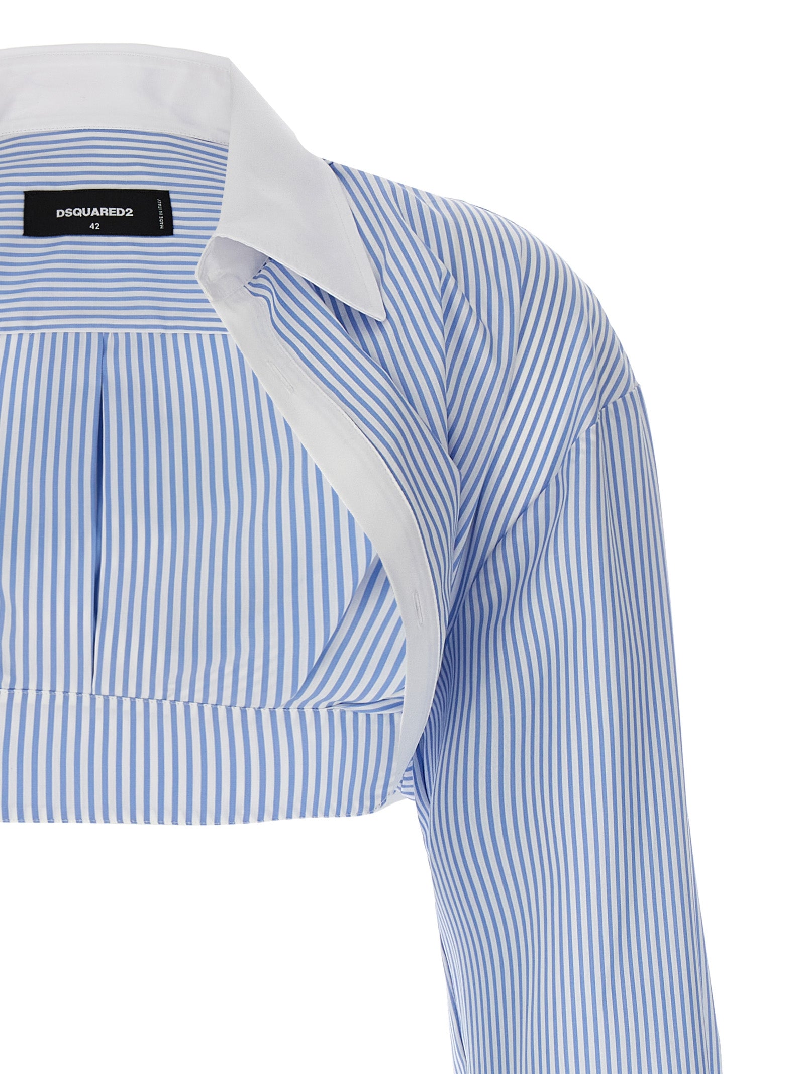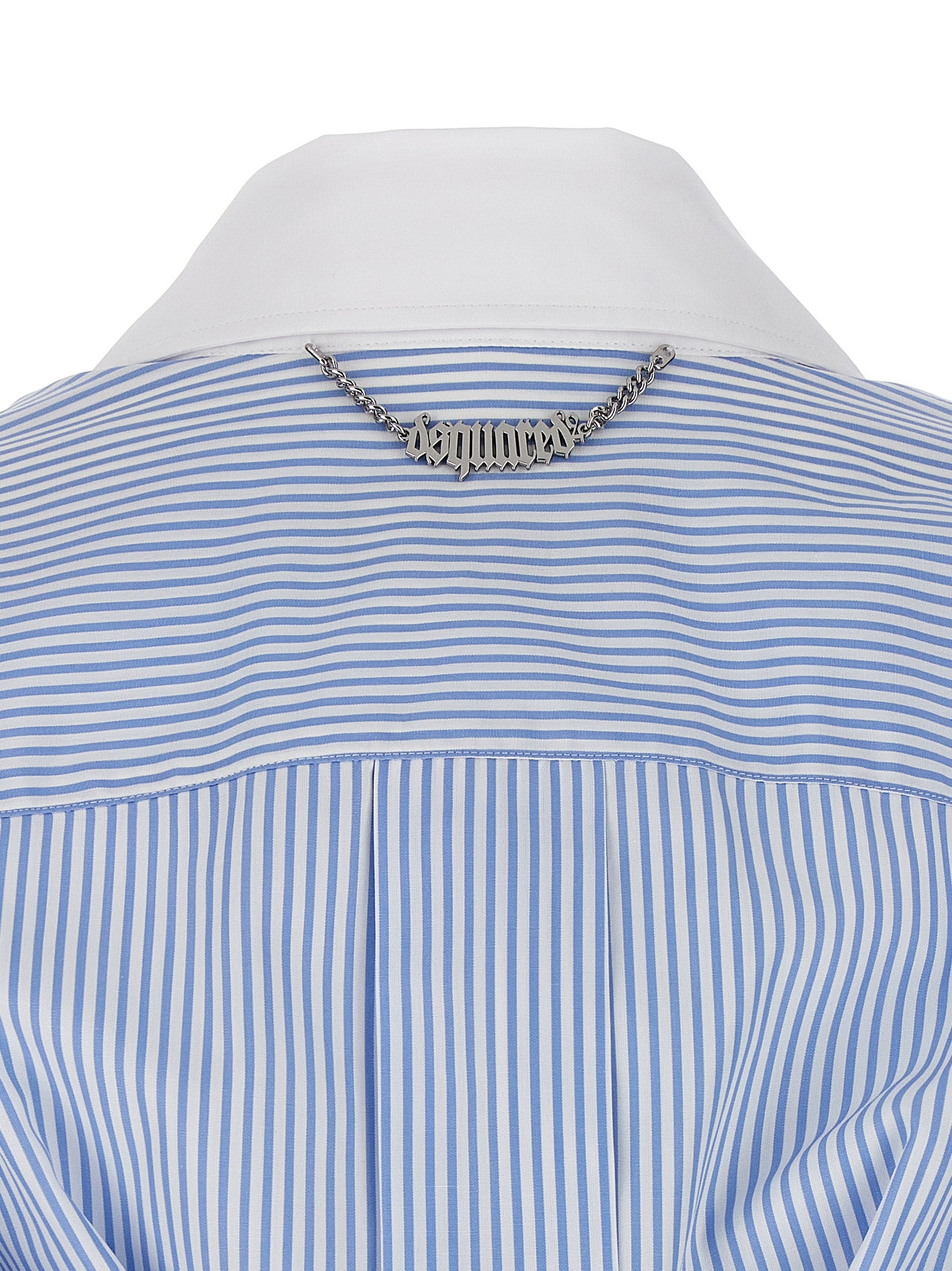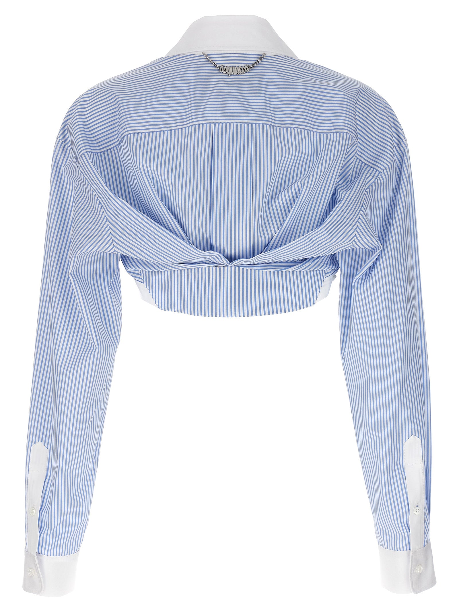 Camicia poplin di cotone a strisce "Shrug", stile di raccolto con drappeggio sul retro, chiusura a forma di frontale a forma di anteriore.