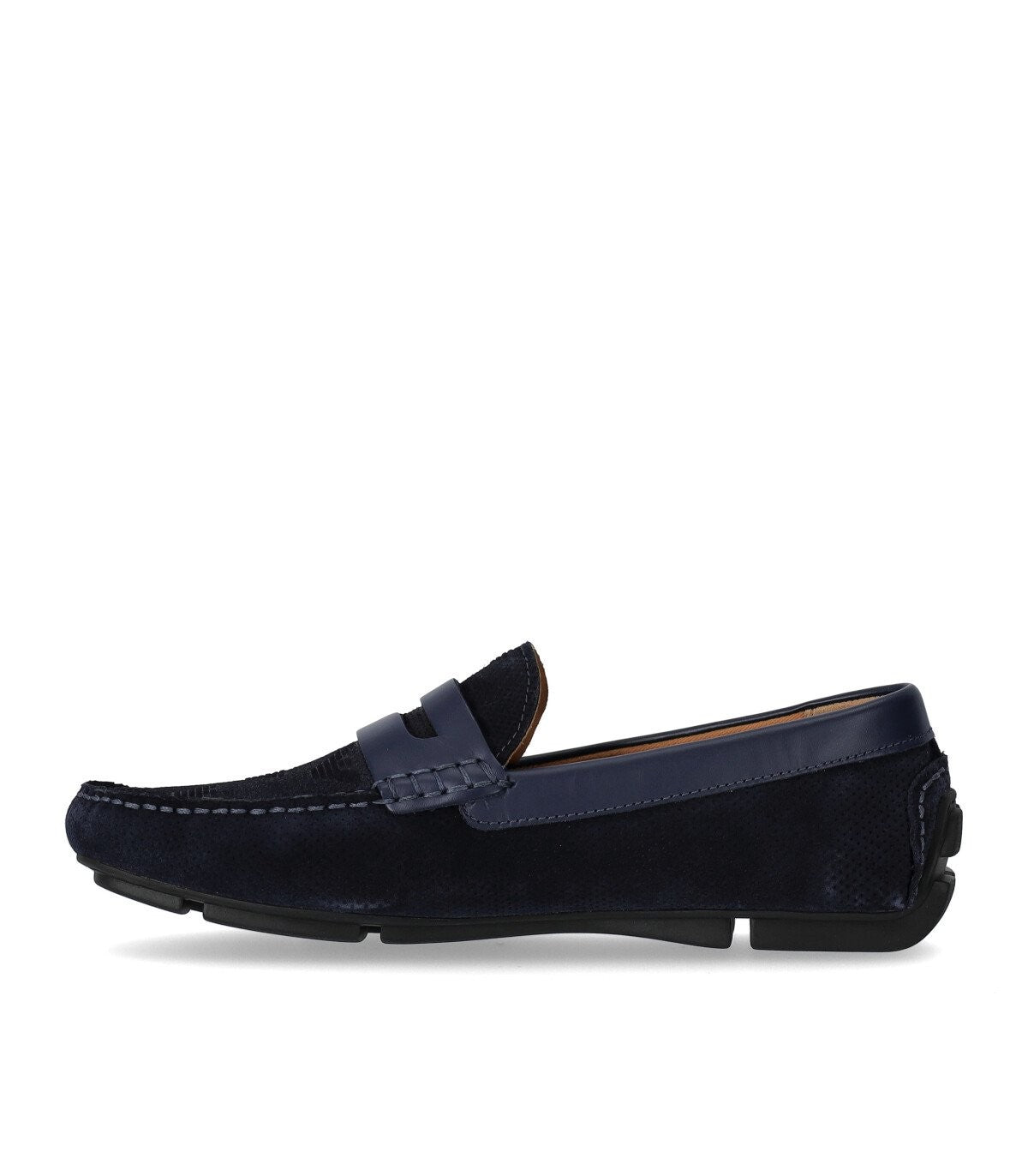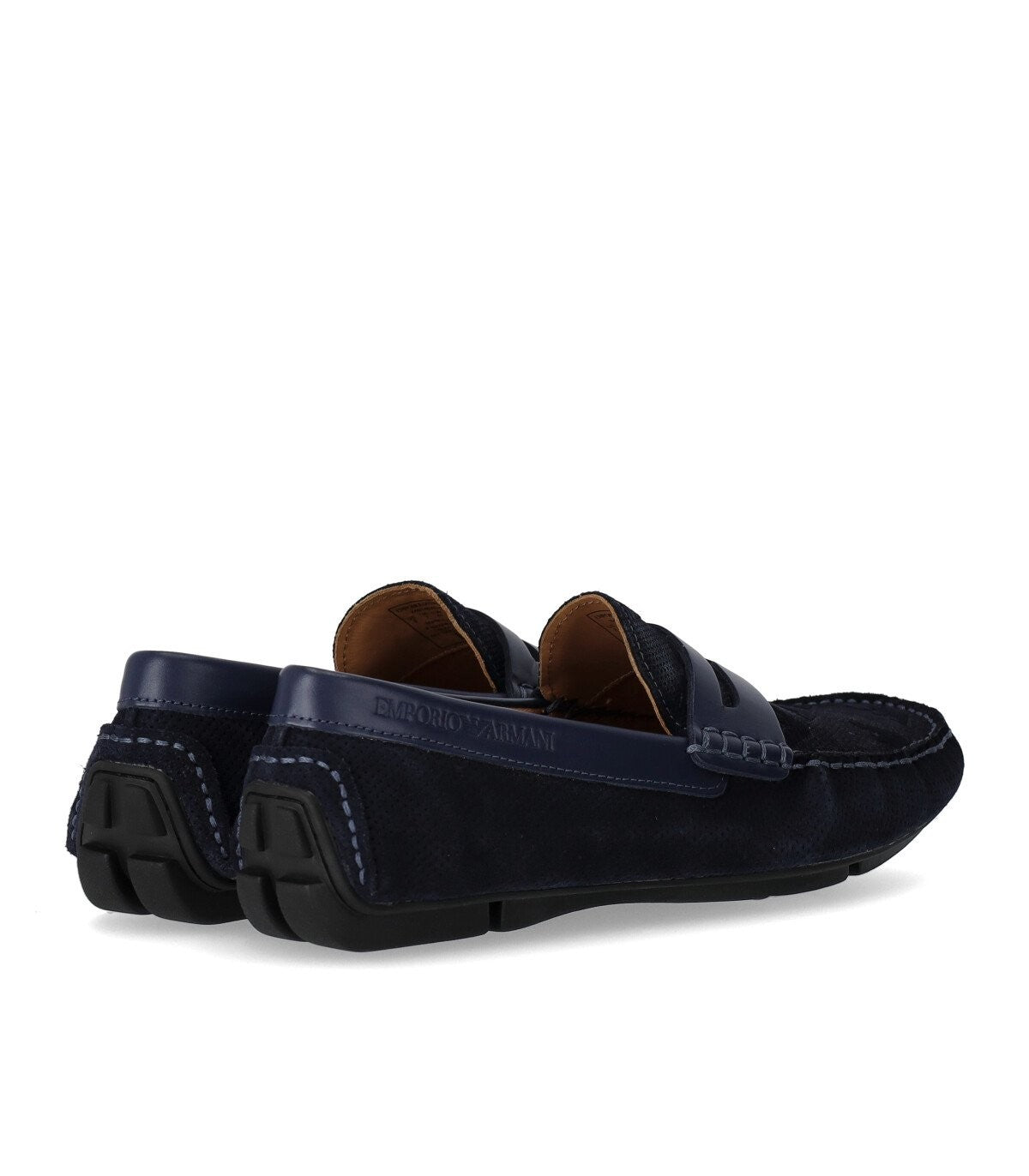 Emporio Armani Loafer realizzato in pelle scamosciata e pelle in sfumature di blu. TOE quadrato decorato con motivo monogramma, logo in rilievo sul lato, fodera in tessuto e sole in pelle. Suola di gomma nera, altezza 2 cm. Composizione superiore: pelle di mucca al 100%. Rivestimento: cotone 100%. Suola in gomma al 100%.