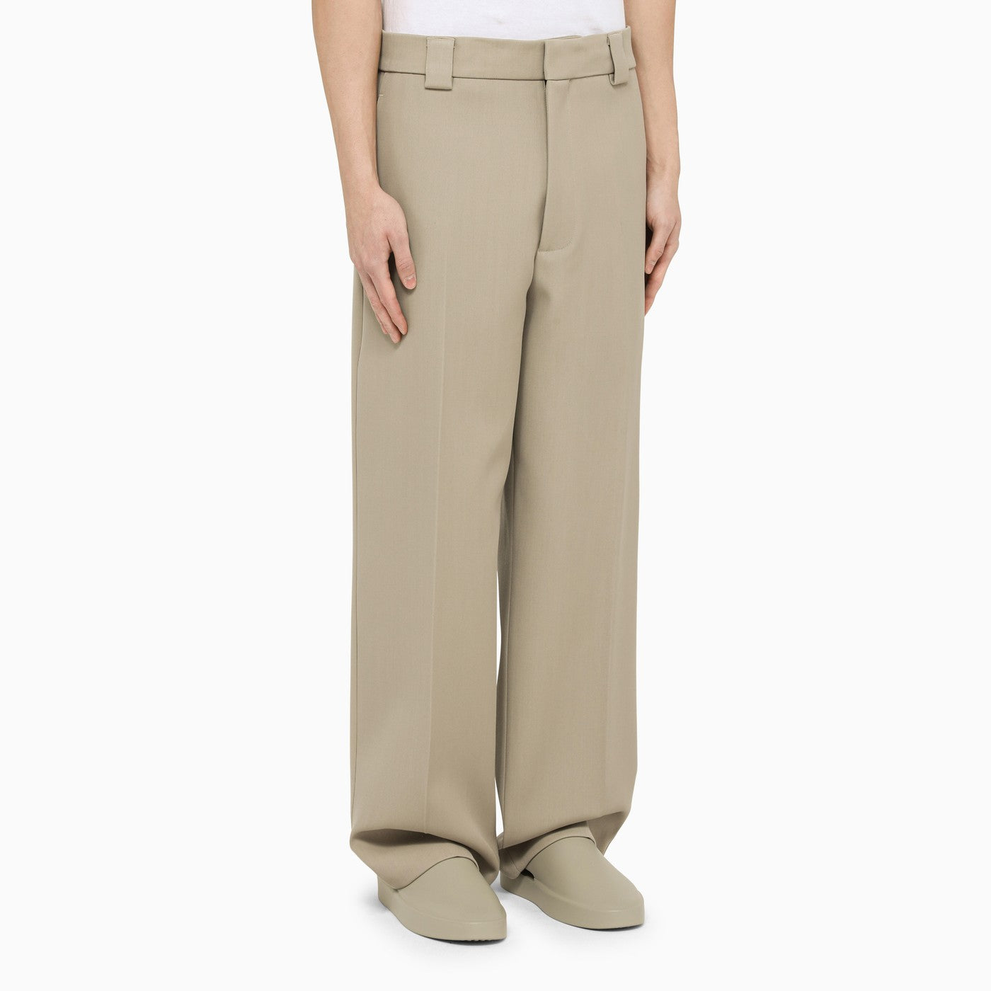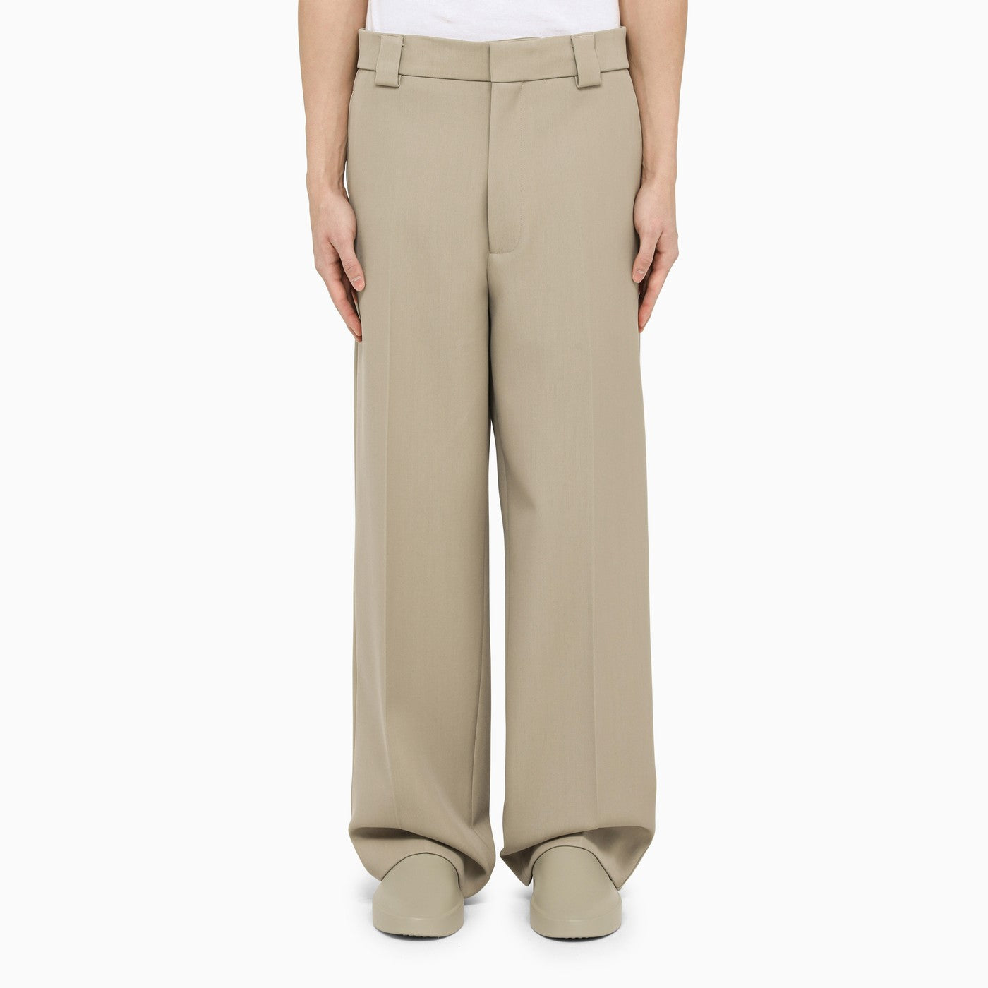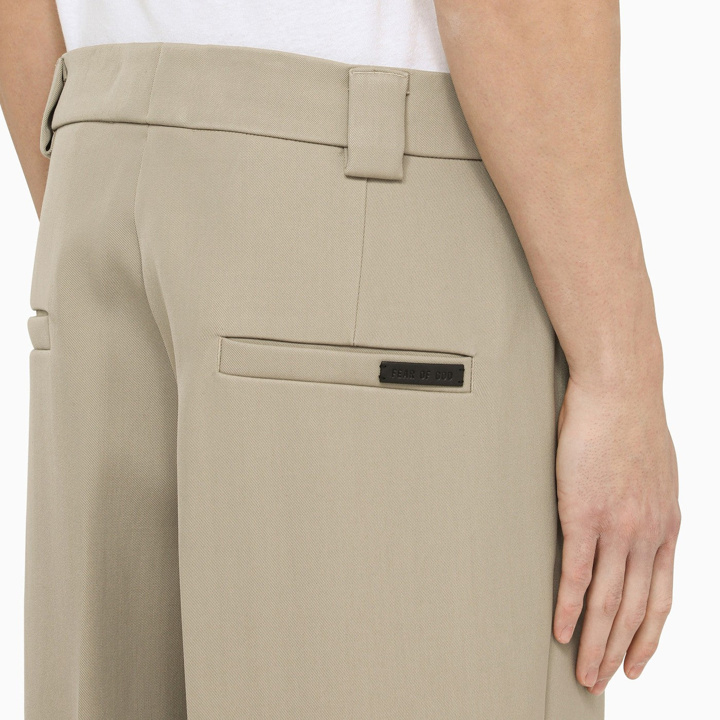 Pantaloni larghi di Fear of God Eternal Collection, realizzati con una miscela polverosa di lana beige, con due tasche a soffietto sui lati, due tasche a marcia sul retro con dettagli logo, fissaggio nascosto e anelli della cintura in vita.
