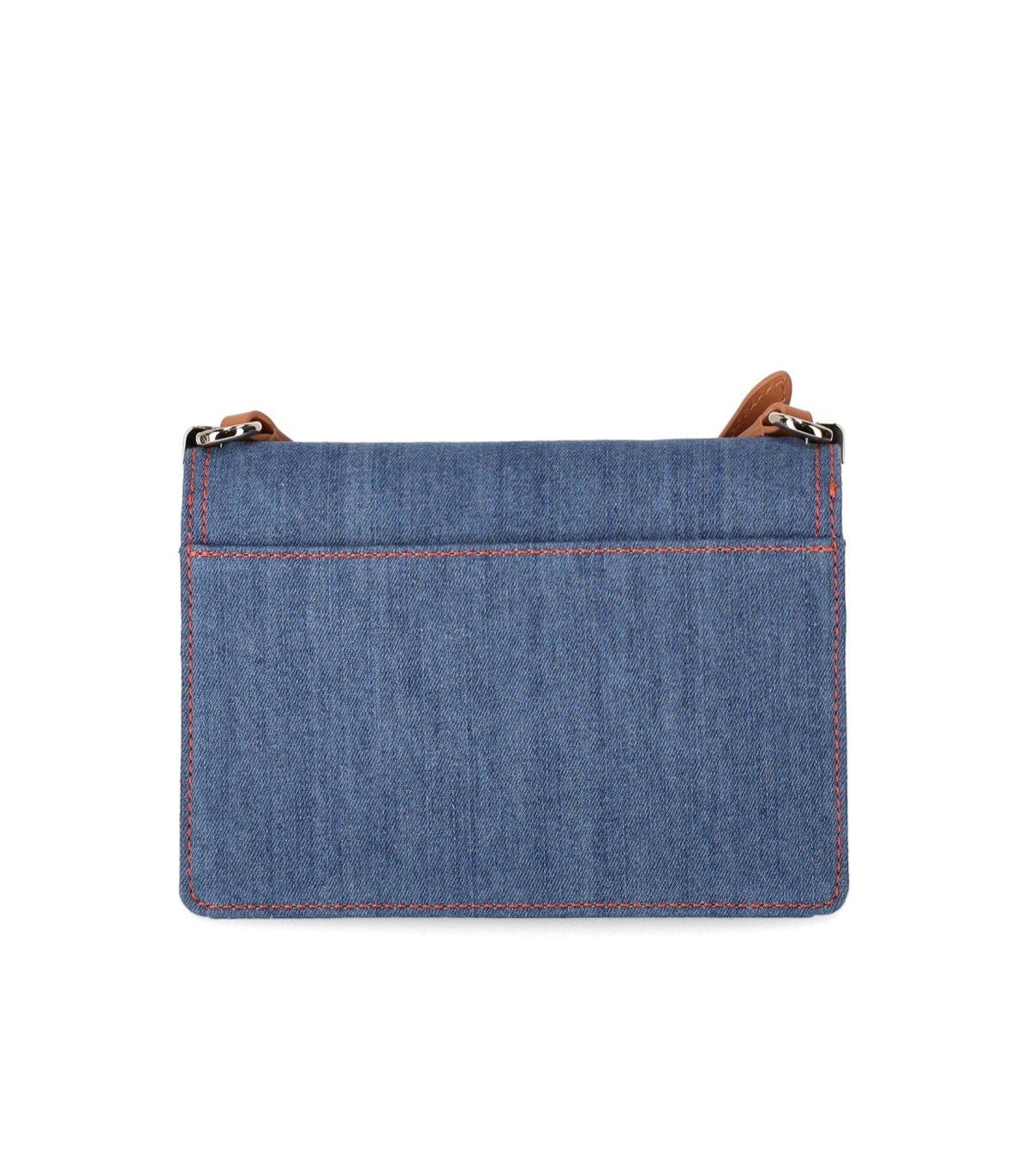 1927 Mini borsa trasversale di Furla fatta di cotone effetto in denim blu, rifinita con cuciture contrastanti e inserti in pelle in colore marrone chiaro. Dettagli in metallo oro, spalla regolabile e chiusura girevole con logo. Interni foderati, dotato di un compartimento di buste. Misurazioni 20.5x13x8 cm. Composizione: 80% di cotone, 20% in pelle.