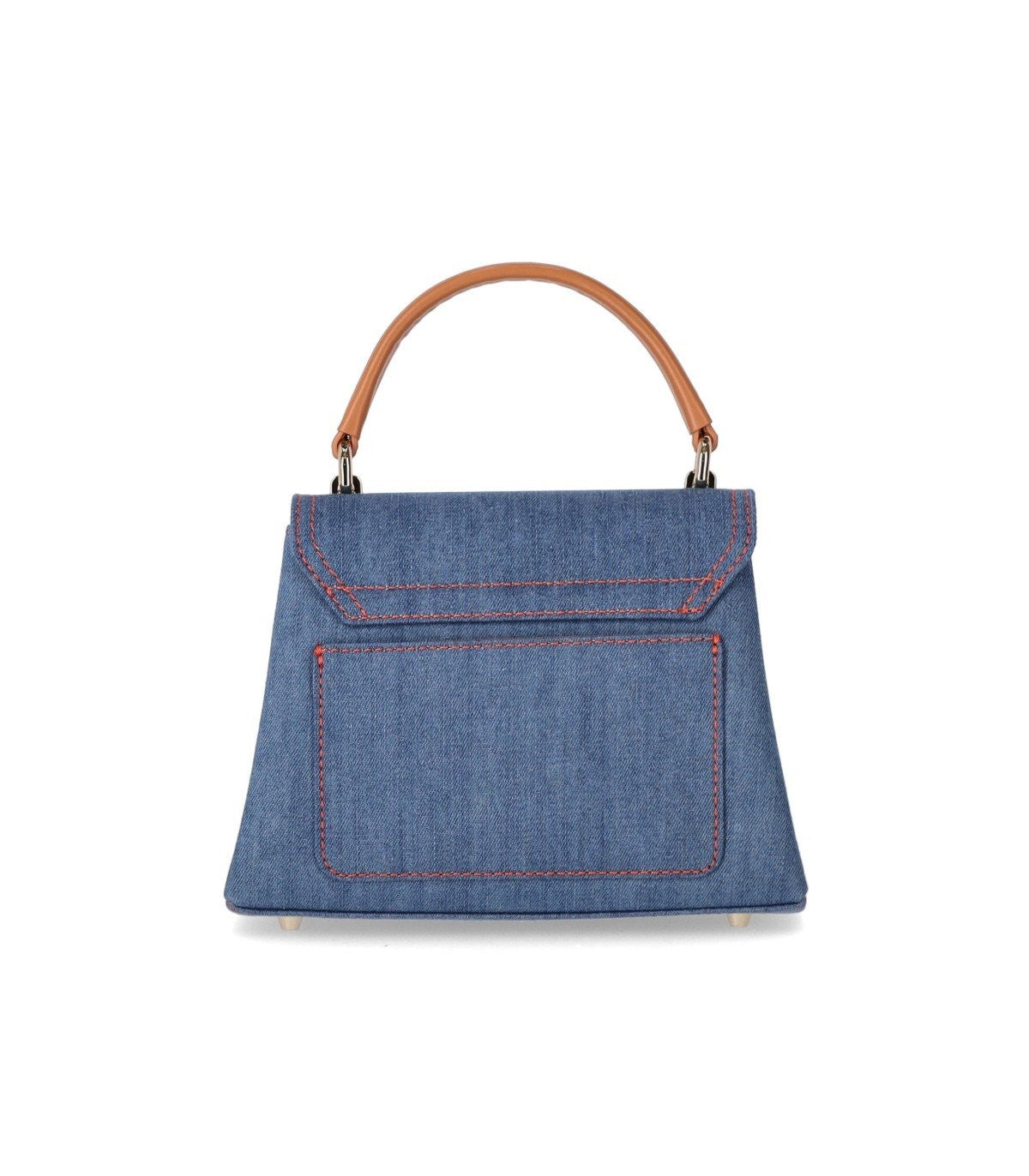 1927 Mini borsetta di Furla realizzata in cotone effetto denim con cuciture contrastanti e inserti in pelle marrone chiaro. Dettagli in metallo oro, interni foderati, dotati di tasche patch. Trovalo regolabile e rimovibile, piedi in metallo sul fondo. Chiusura girevole, misura 21x16x8,5 cm. Composizione: 80% di cotone, 20% in pelle.