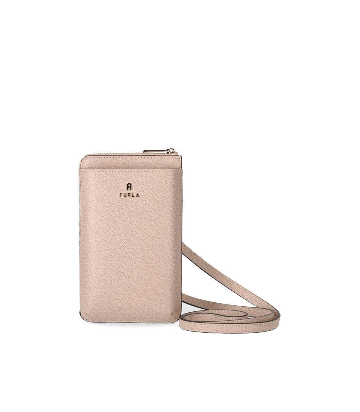 Camelia Vertical Crossbody Bag di Furla realizzata in pelle martellata rosa chiaro, con logo frontale e dettagli in metallo dorato. Compartimento anteriore per smartphone e compartimenti con cerniera con slot per carte, banconote e una tasca della moneta. Rivestimento in poliestere. Spazio per le carte anche sul retro. Dimensioni 19.5x11x3 cm.