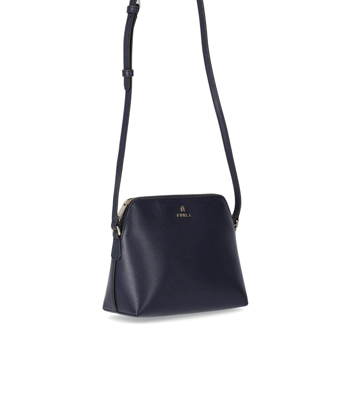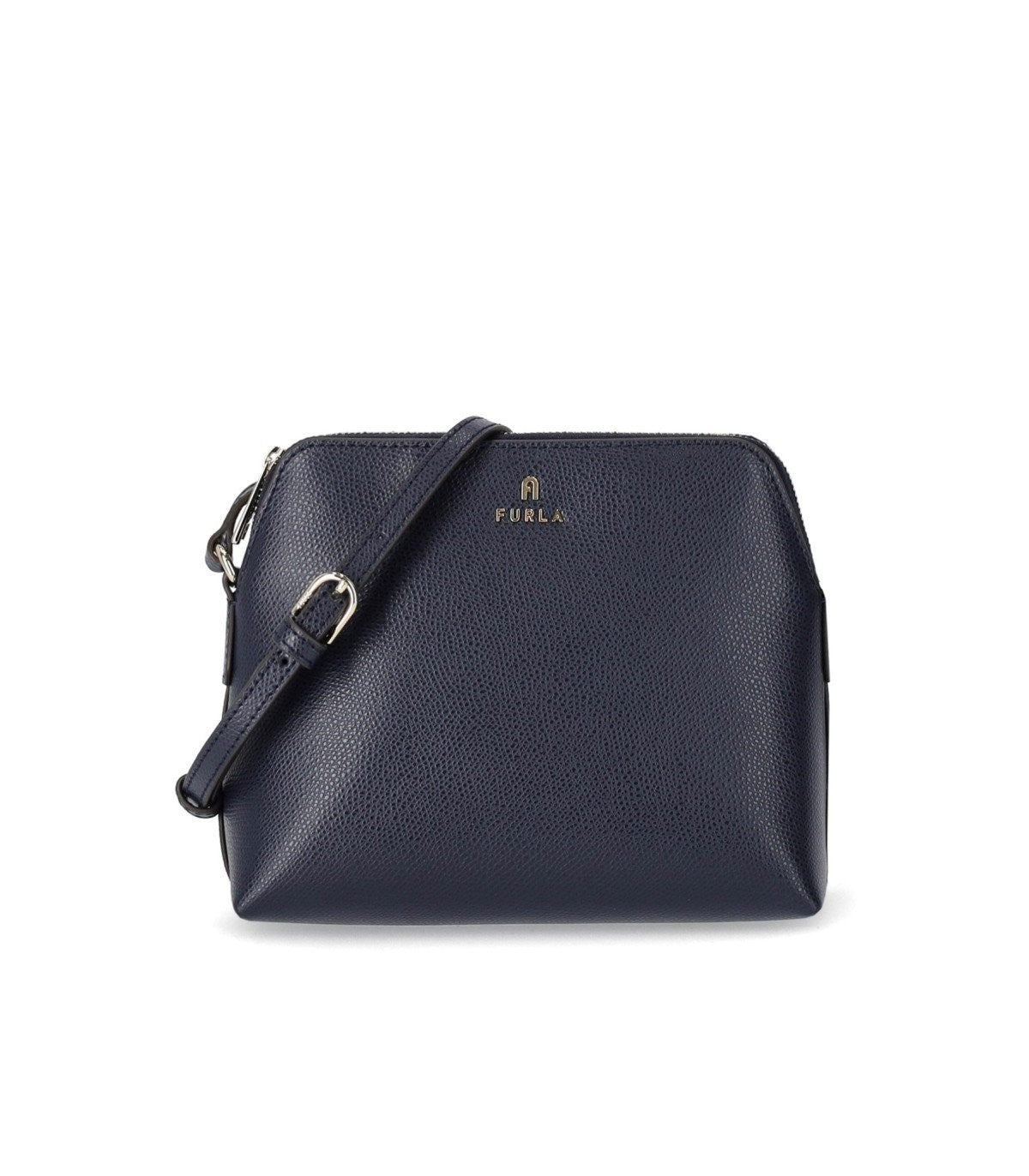 Camelia Mini Crossbody Borsa di Furla realizzata in pelle blu martellata. It Ha una custodia interna in pelle rosa chiaro, hardware dorato e un logo frontale. Interni foderati, con una tasca piatta. Trovalo regolabile. Misure di sacchetti 18.5x15.5x8 cm; Misurazioni della busta 14x12x4,5 cm.