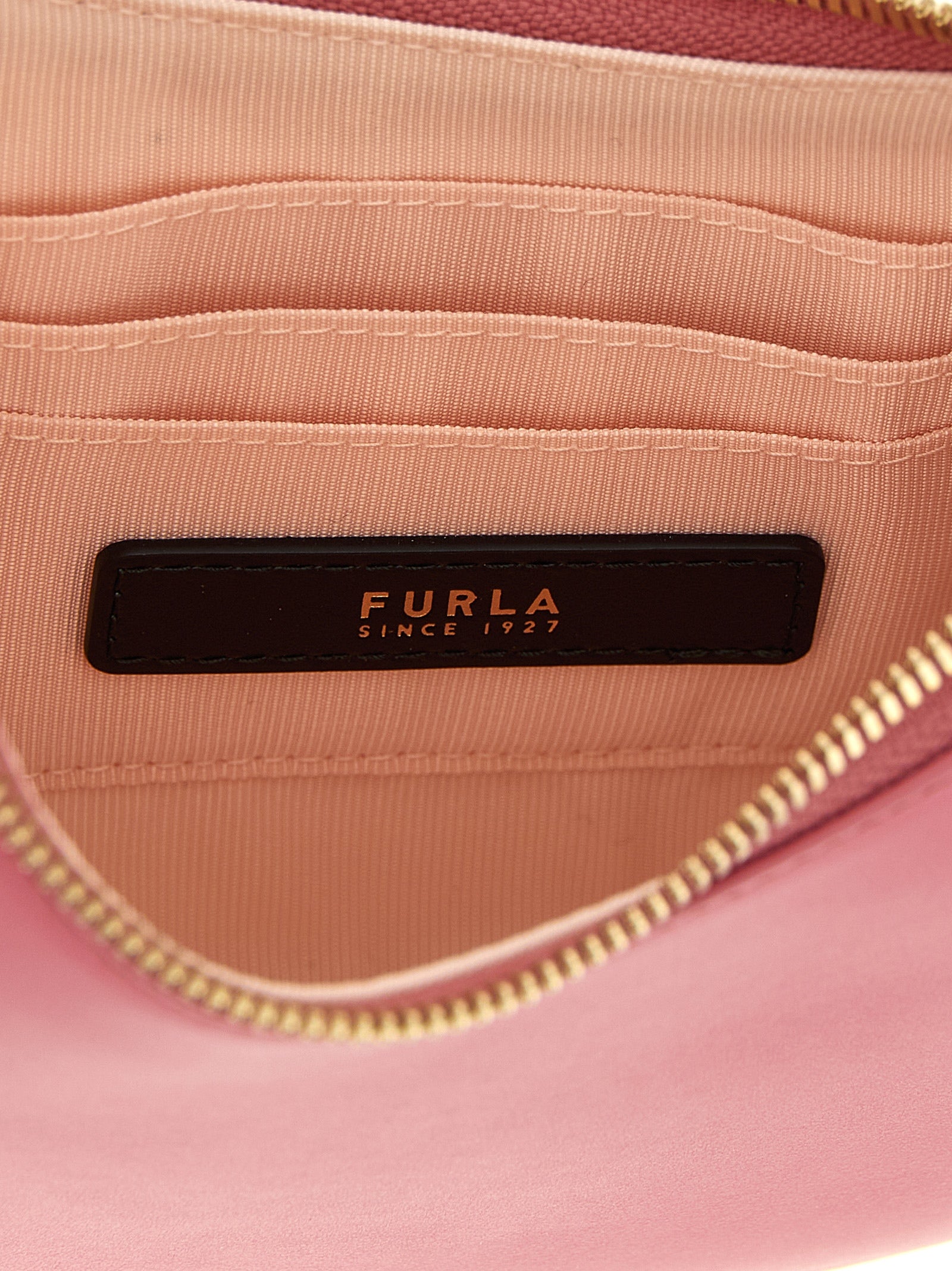 Mini spalla in pelle "Furla Delizia" con un tocco setoso e liscio, struttura a mezzaluna rigida, logo in rilievo anteriore, chiusura a zip superiore, maniglia regolabile con meccanismo girevole in metallo.