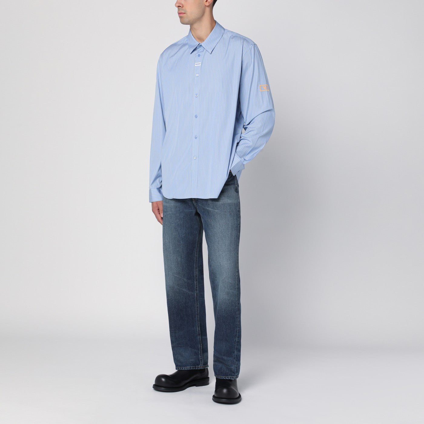 Camicia di cotone a strisce azzurra di Martine Rose, dispone di un classico colletto, maniche lunghe con polsini a bottoni e ricami logo di lettere contrastanti, placca a bottone anteriore con patch logo e orlo dritto.