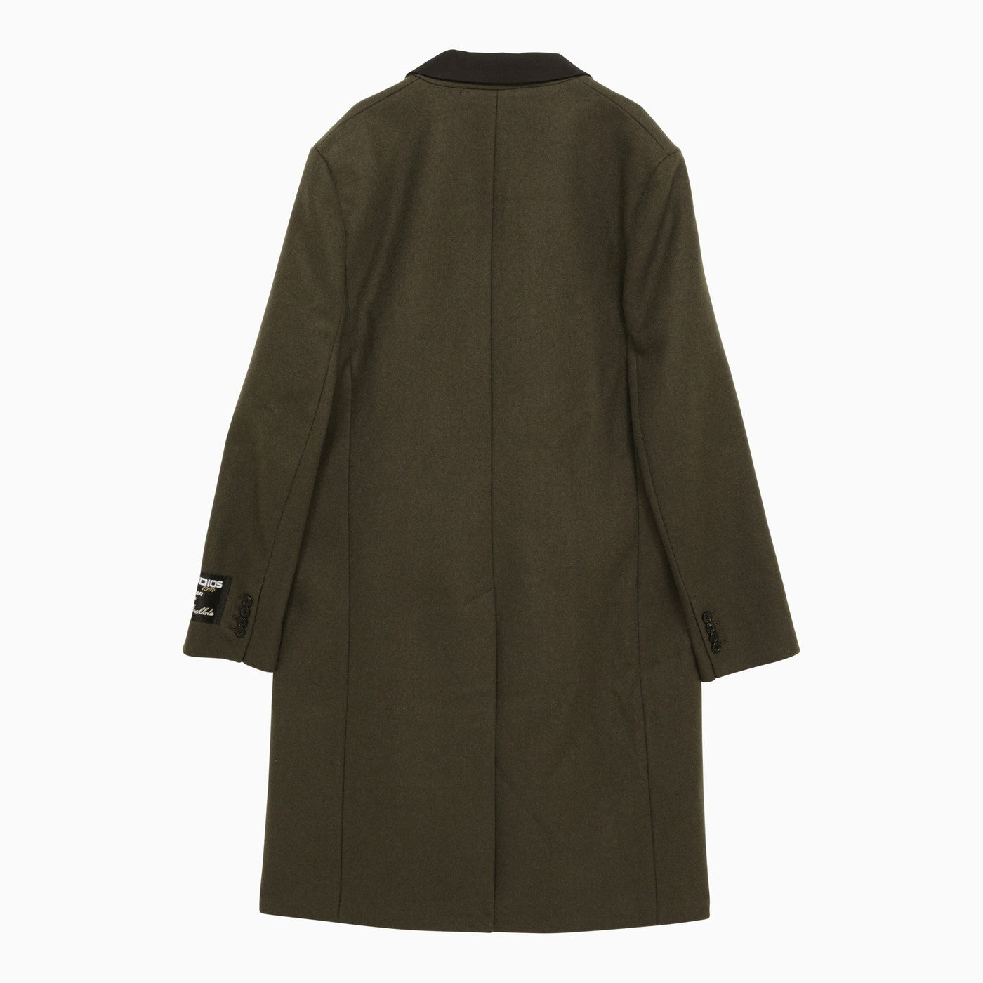 Cappotto in lana verde militare di Acne Studios con due tasche con patta e patch logo sulla manica.