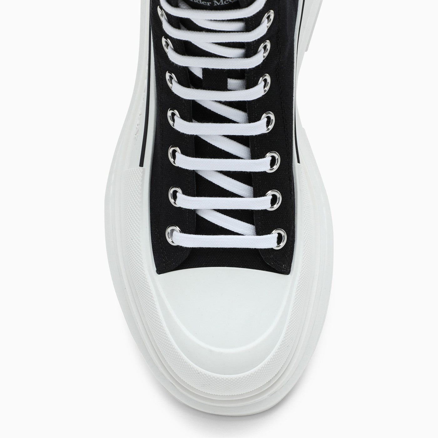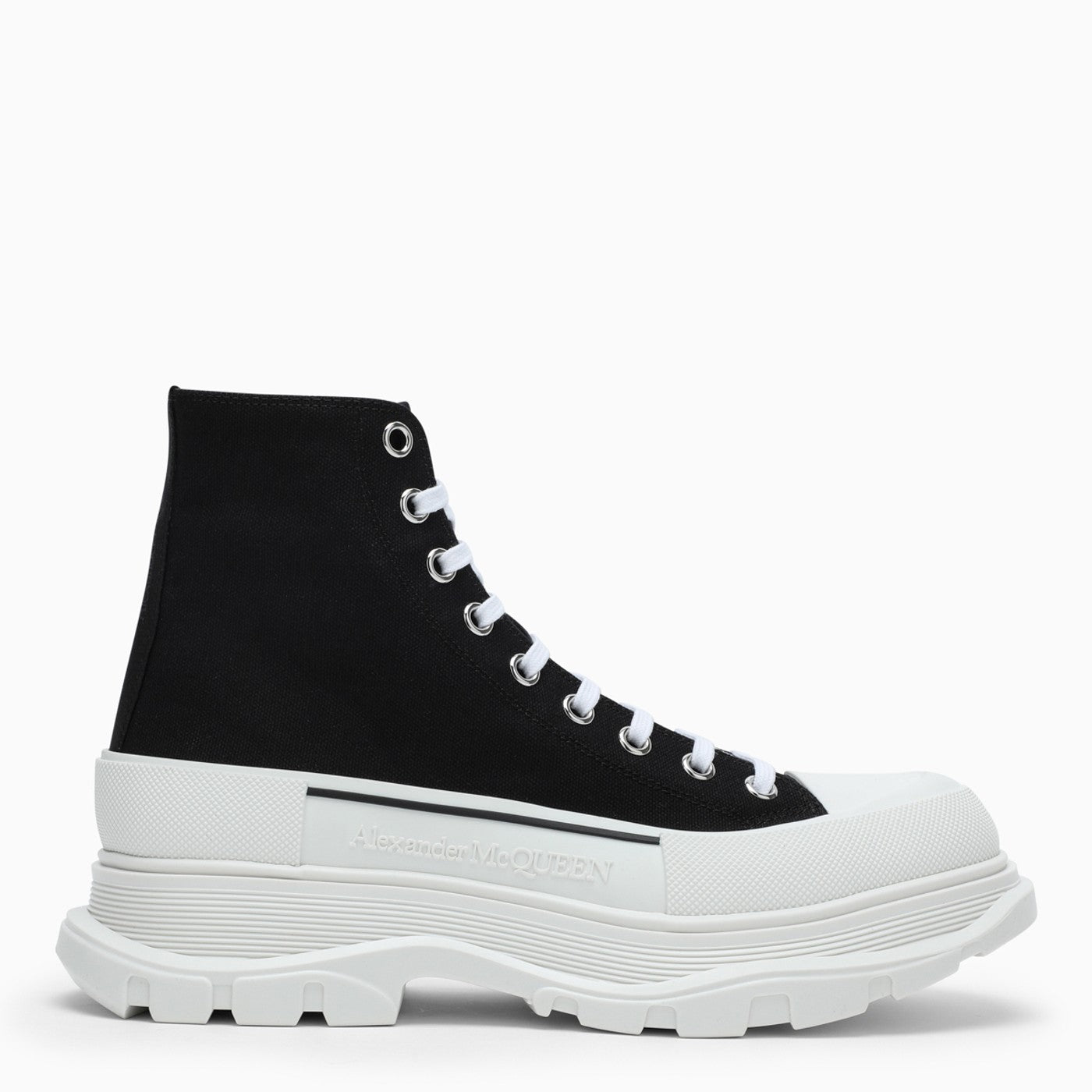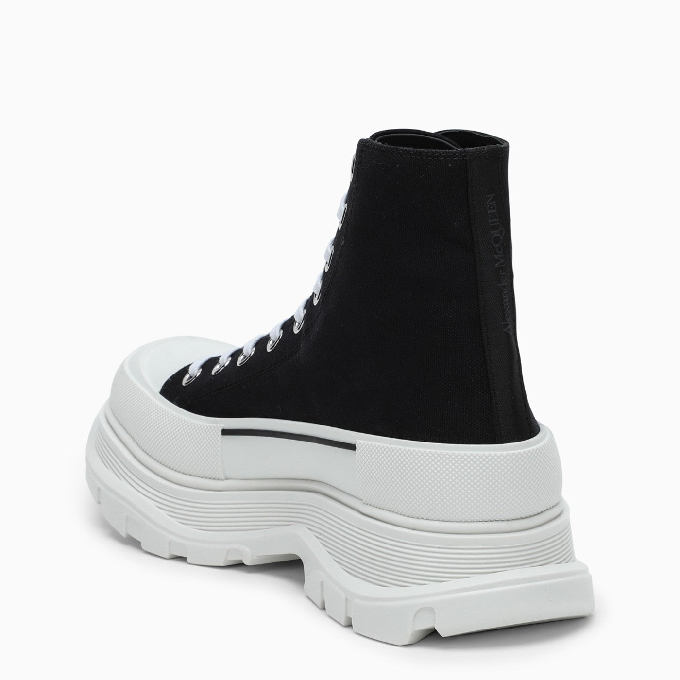 Stivali di Alexander McQueen in tela nera con una punta rotonda, un fissaggio anteriore allacciato, una lingua in rilievo in rilievo, una linguetta a trazione nella parte posteriore, una suola in gomma bianca increspata e una lunghezza della caviglia.