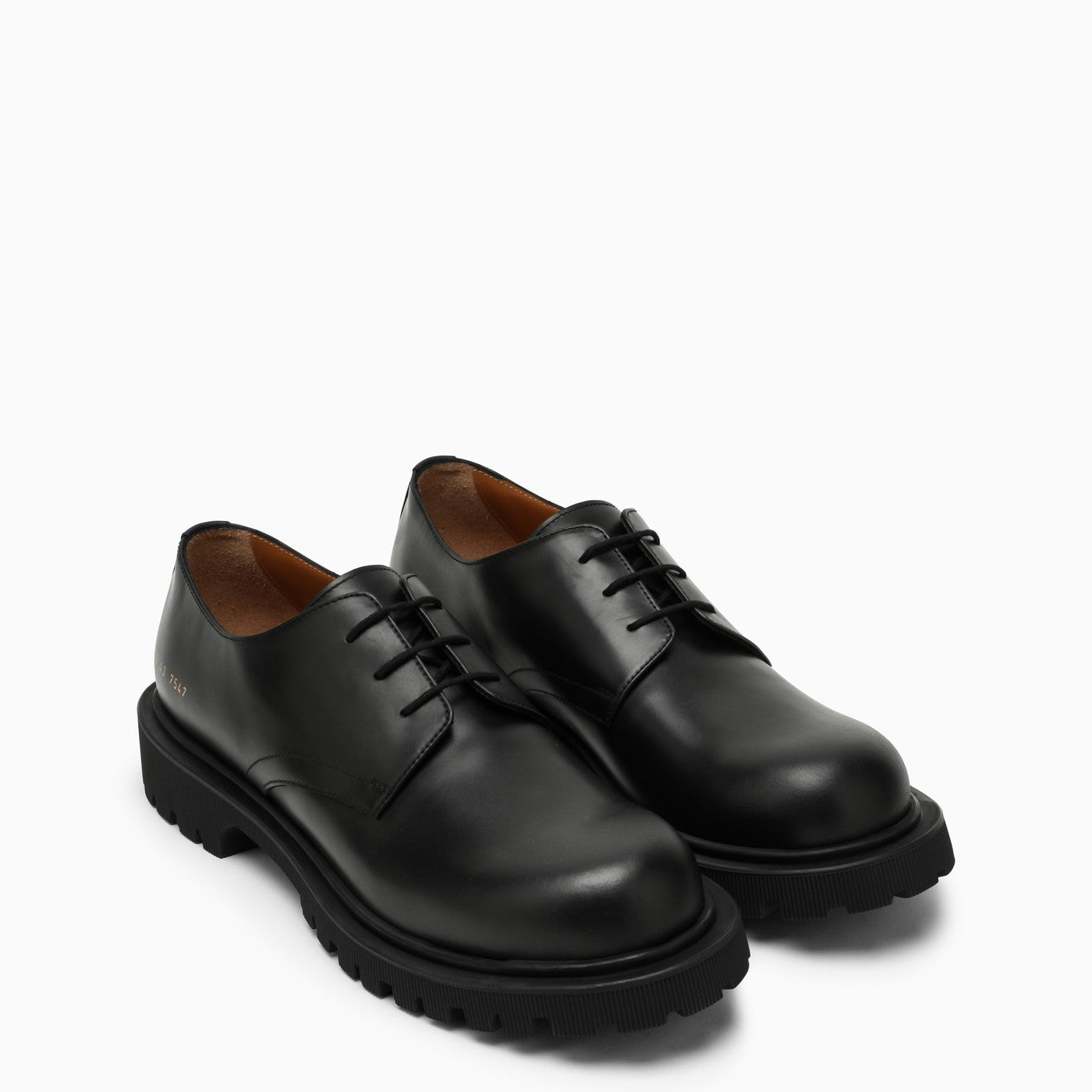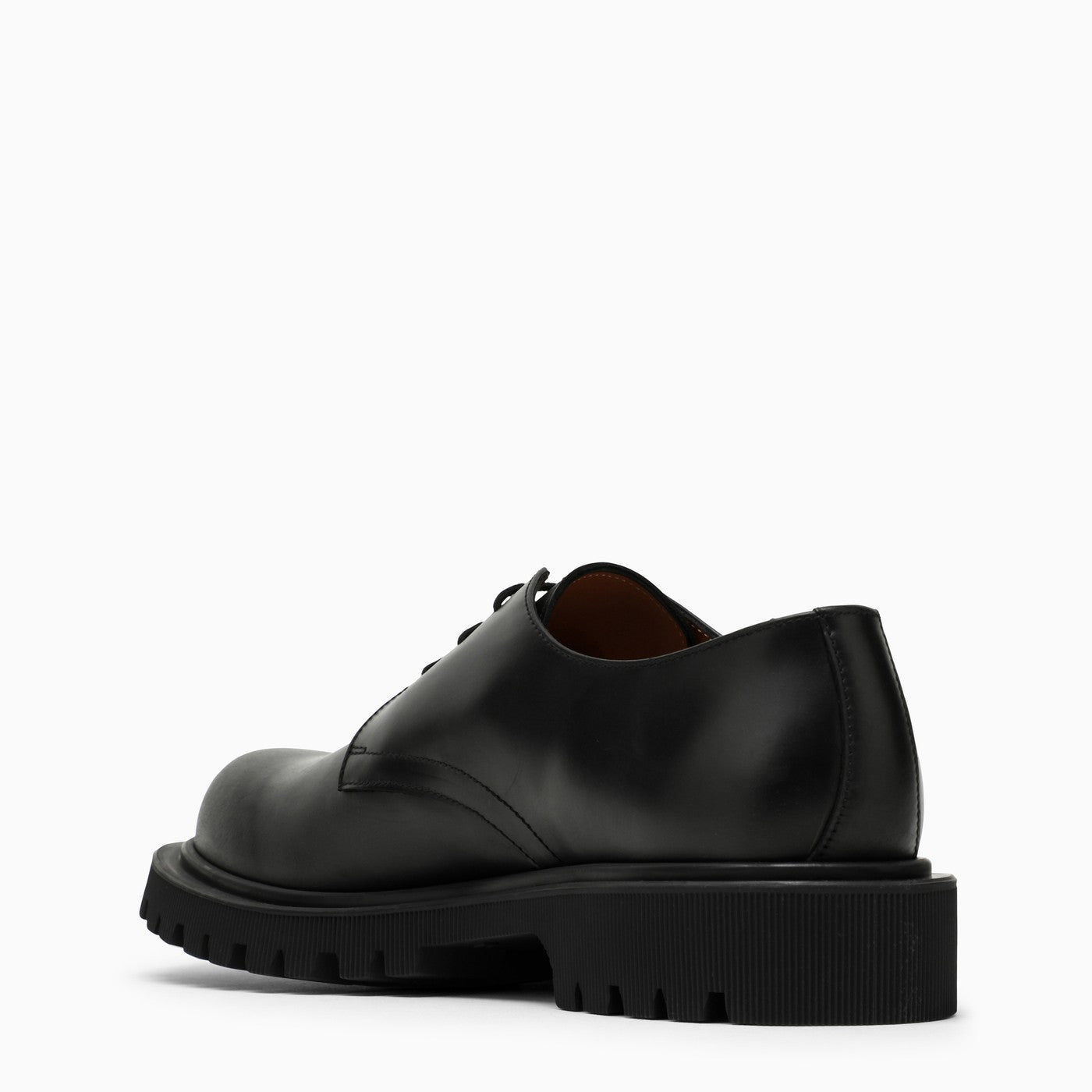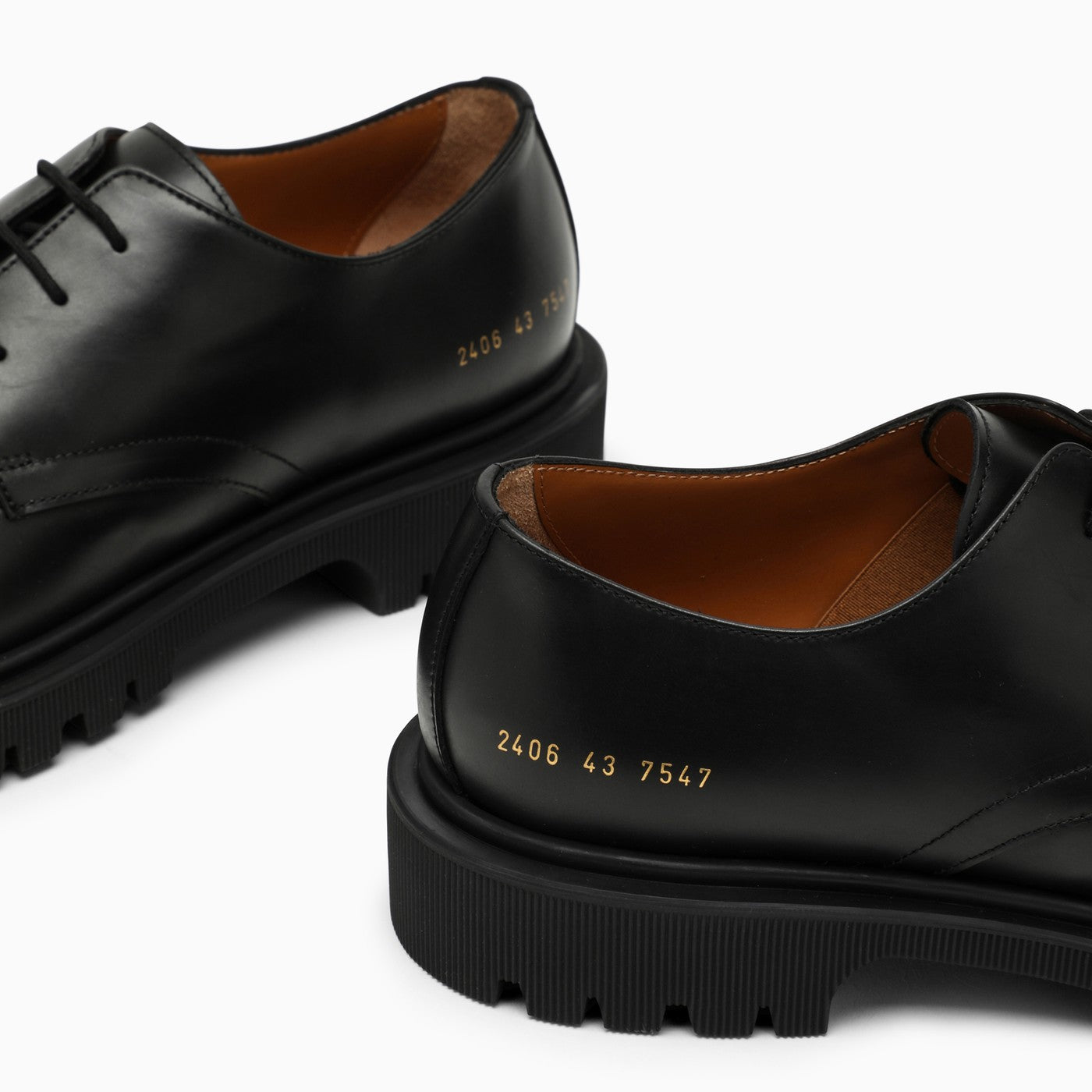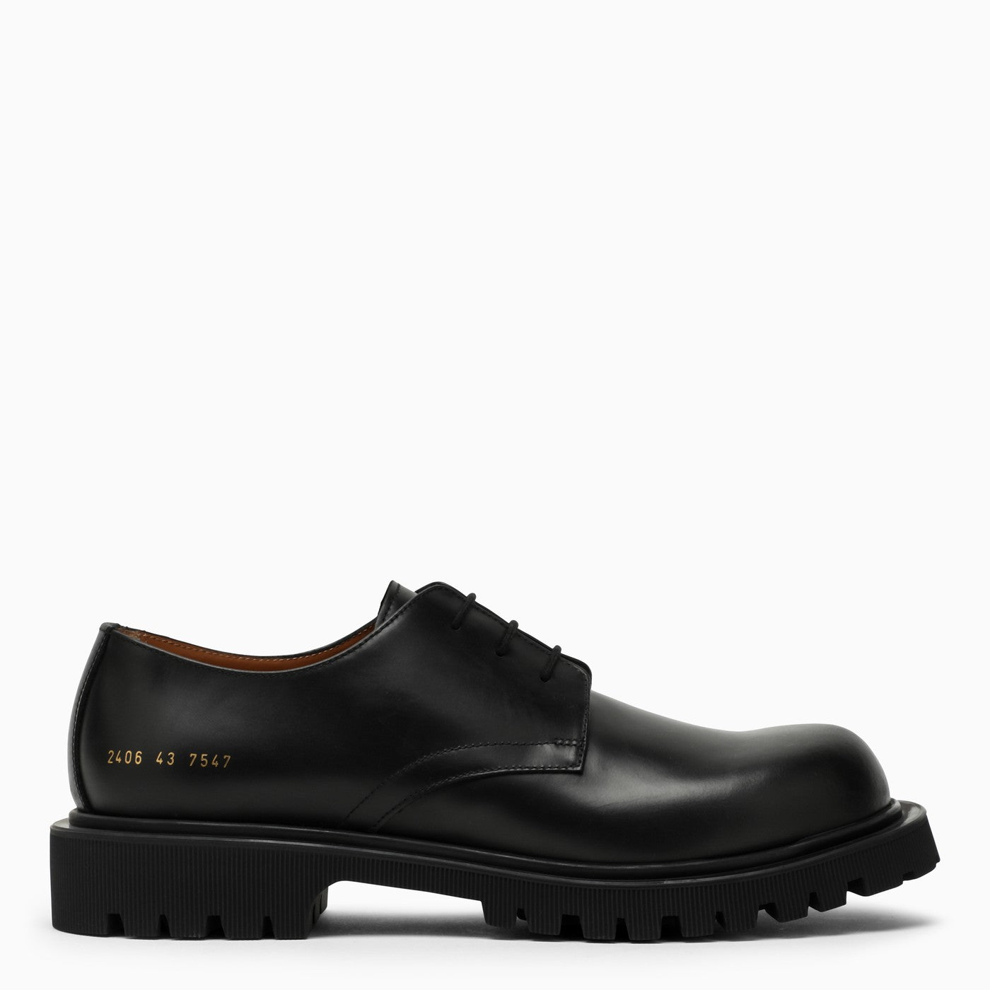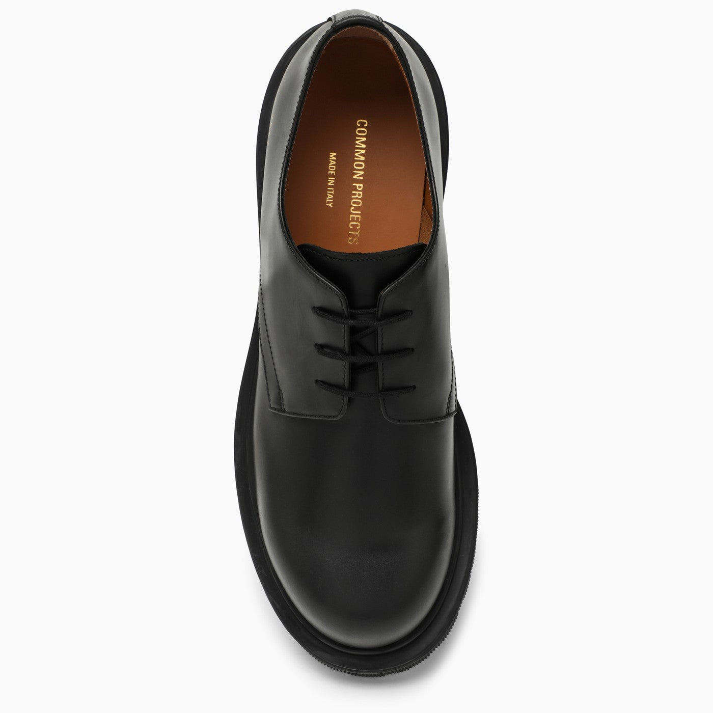 Smooth Black Leathe-up in pelle nera da progetti comuni, con una punta arrotondata, un classico fissaggio di lacci, stampa d'oro sul lato e suola in gomma.