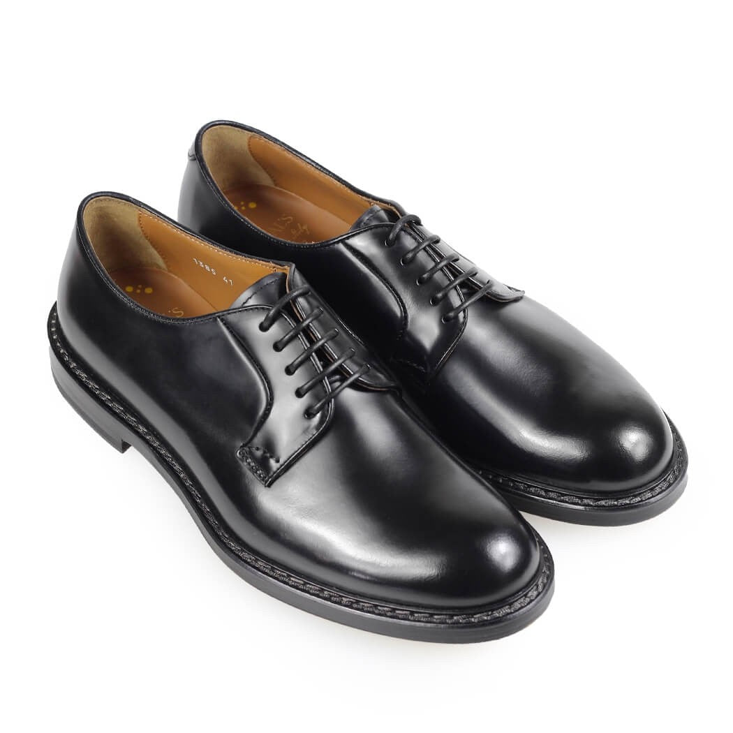 Doucal 's Derby Lace-up in pelle nera liscia in età manuale. Lavanitura a cinque buche, piede arrotondata e suola in pelle. Altezza 2,5 cm.
