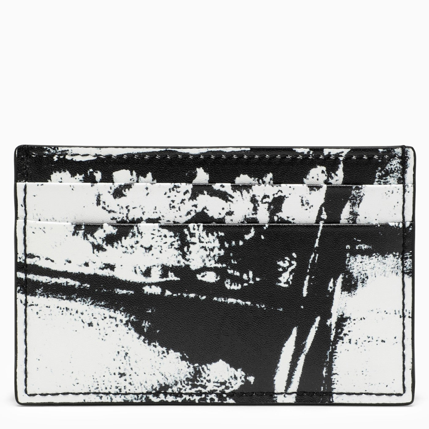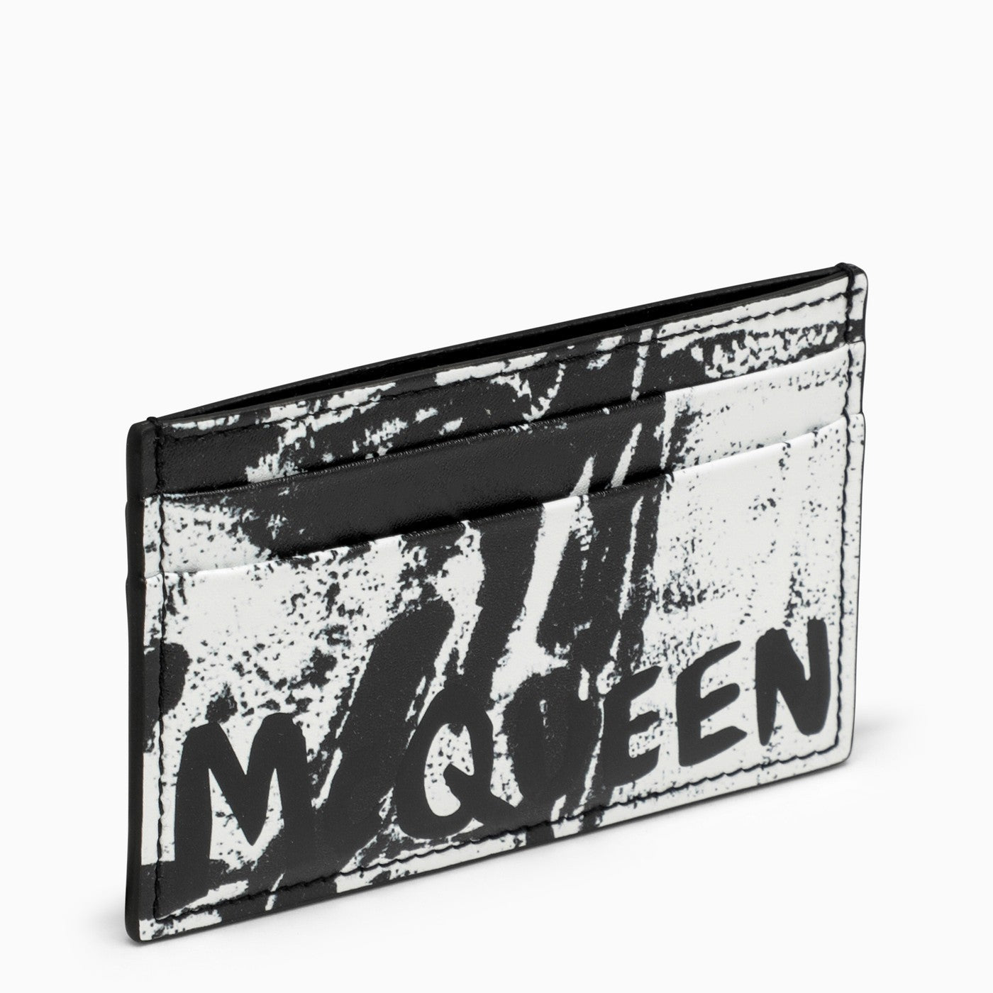 Porta della carta in pelle in bianco e nero di Alexander McQueen, con diversi slot di carte, tasca centrale aperta, design maculato e logo di lettere anteriori.