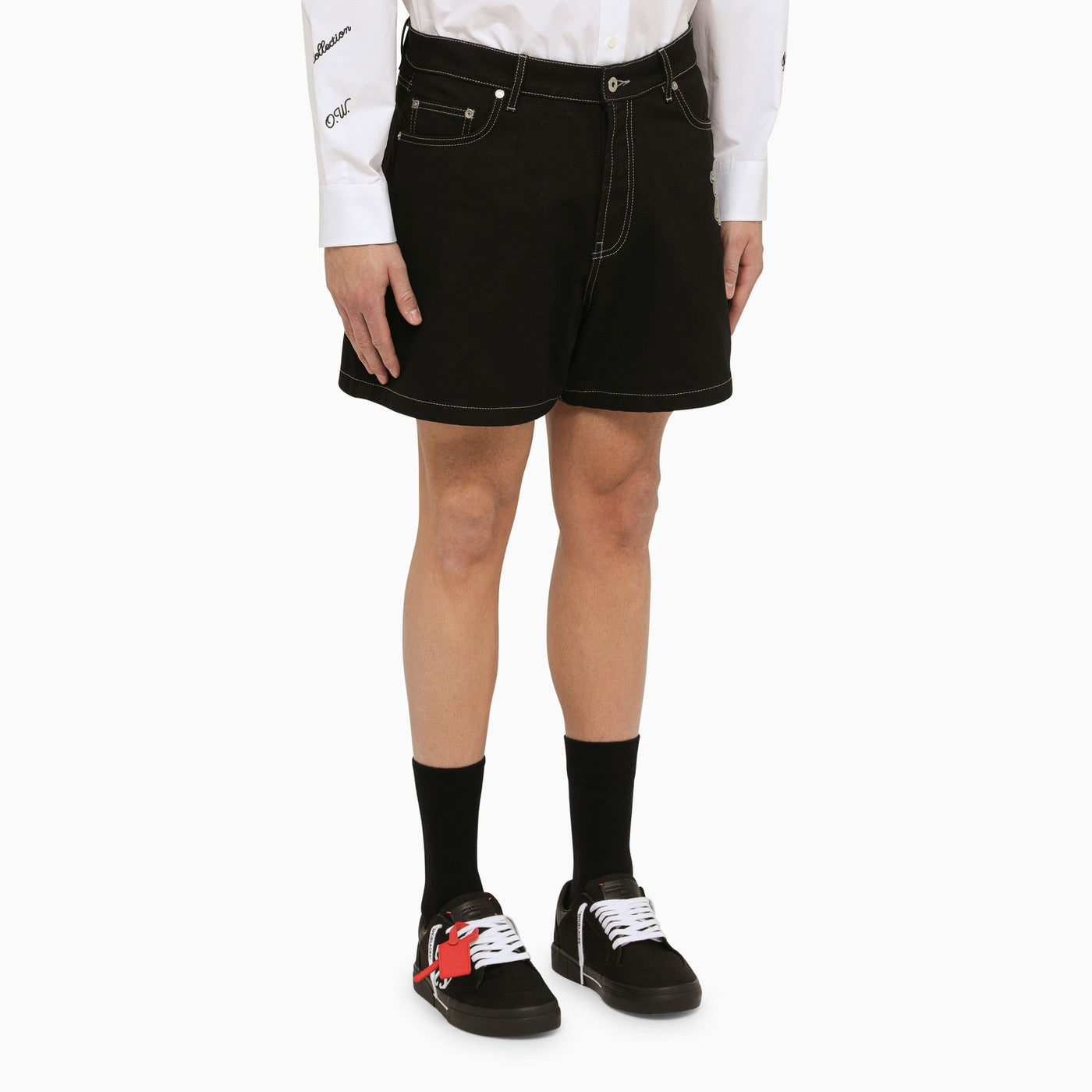Shorts di denim in cotone nero da Off White con un fissaggio con zip e pulsanti, anelli della cintura, cinque tasche classiche, logo di lettere ricamato sulla parte anteriore e patch logo sul retro.
