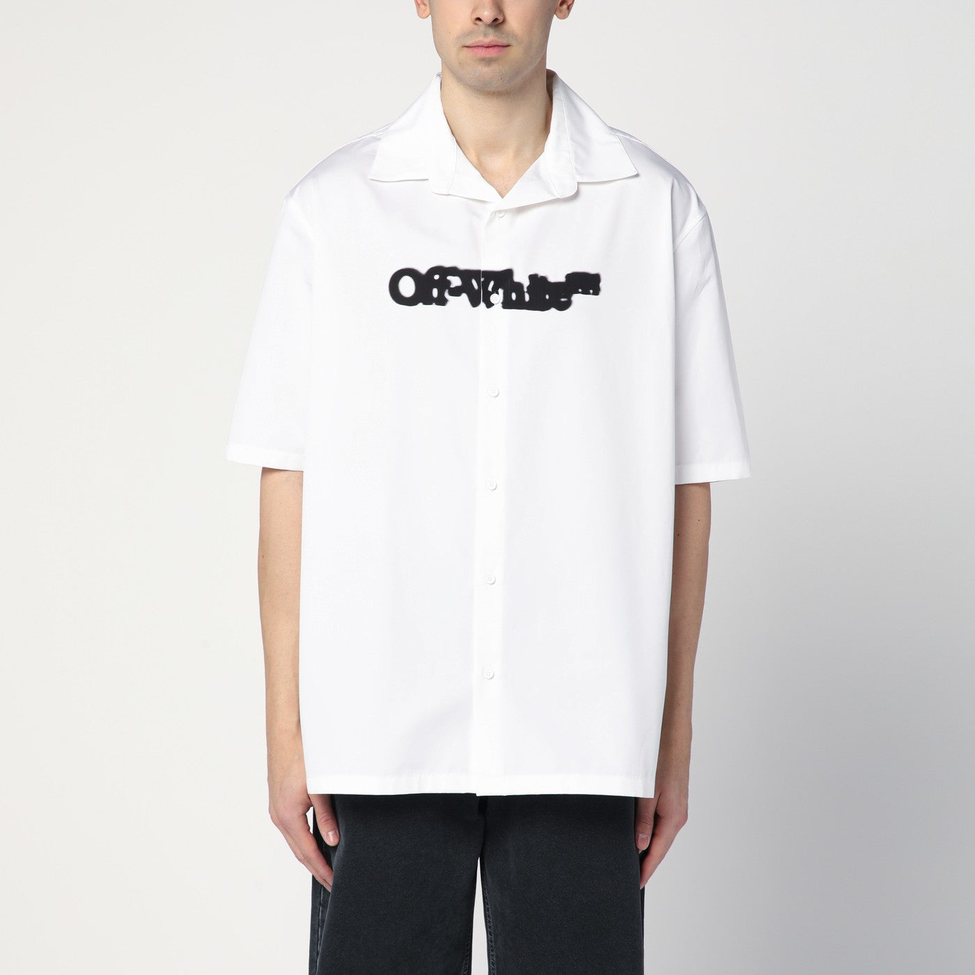 Camicia di cotone bianco sciolto di bianco sporco, con maniche corte, un colletto di bowling, abbottonatura frontale, lettere di logo contrastante stampata sul petto, motivazione freccia contrastante sul retro e un orlo dritto.
