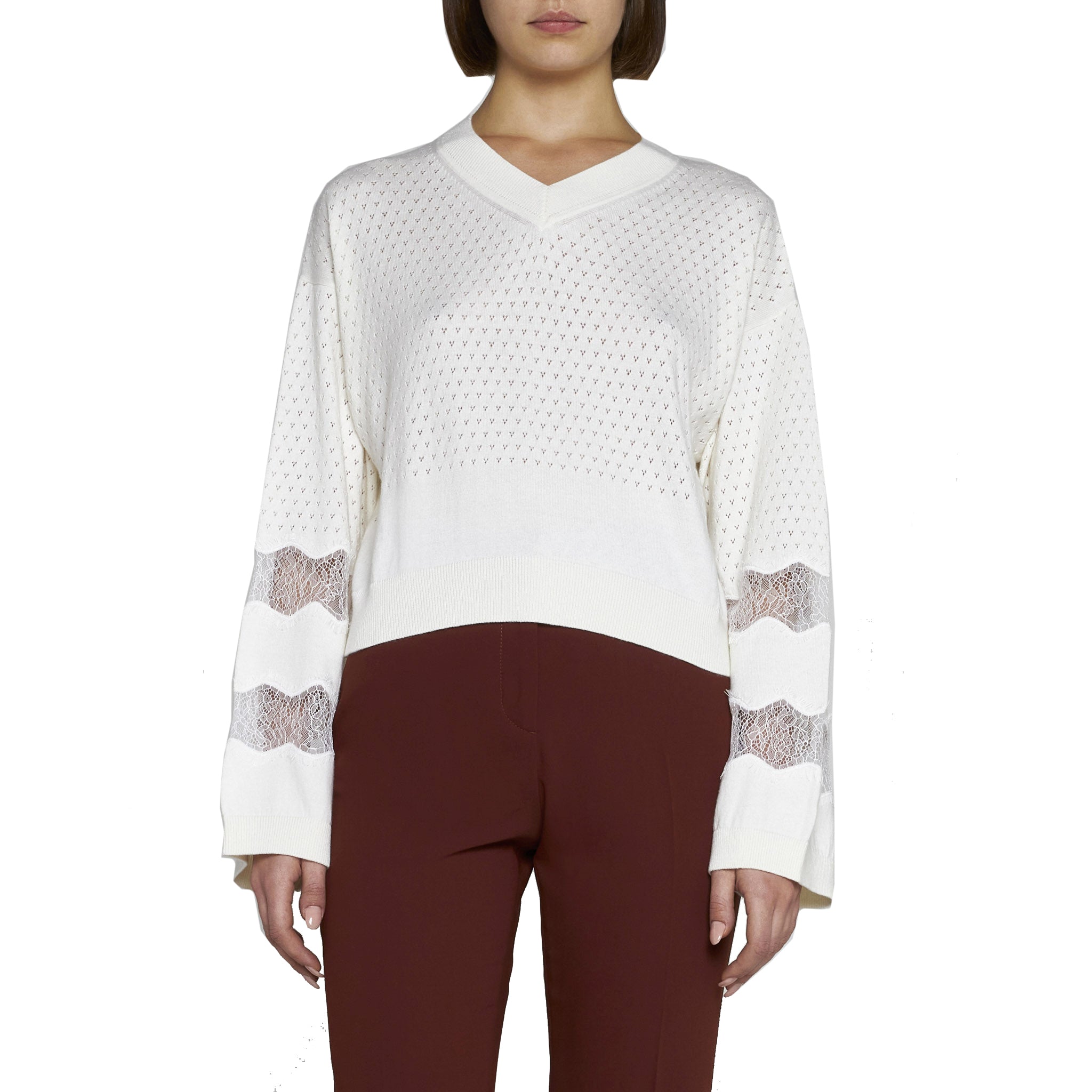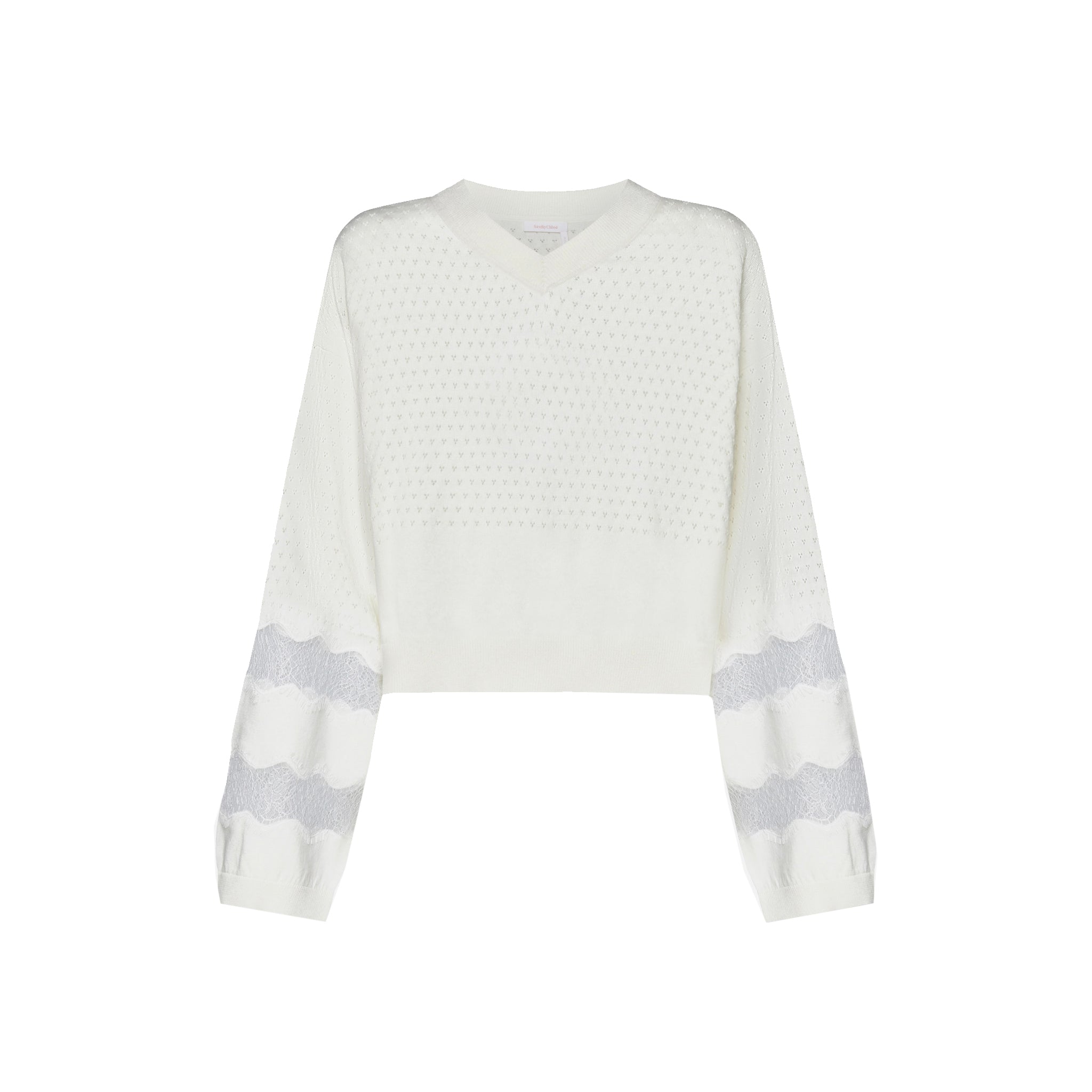 - Composizione: 92% Cotton 8% Cashmere - Ribalghi a coste - Neck rotondo - Dettagli perforati - Inserti di pizzo - SOLO PULITÀ DRY - Made in Cina -