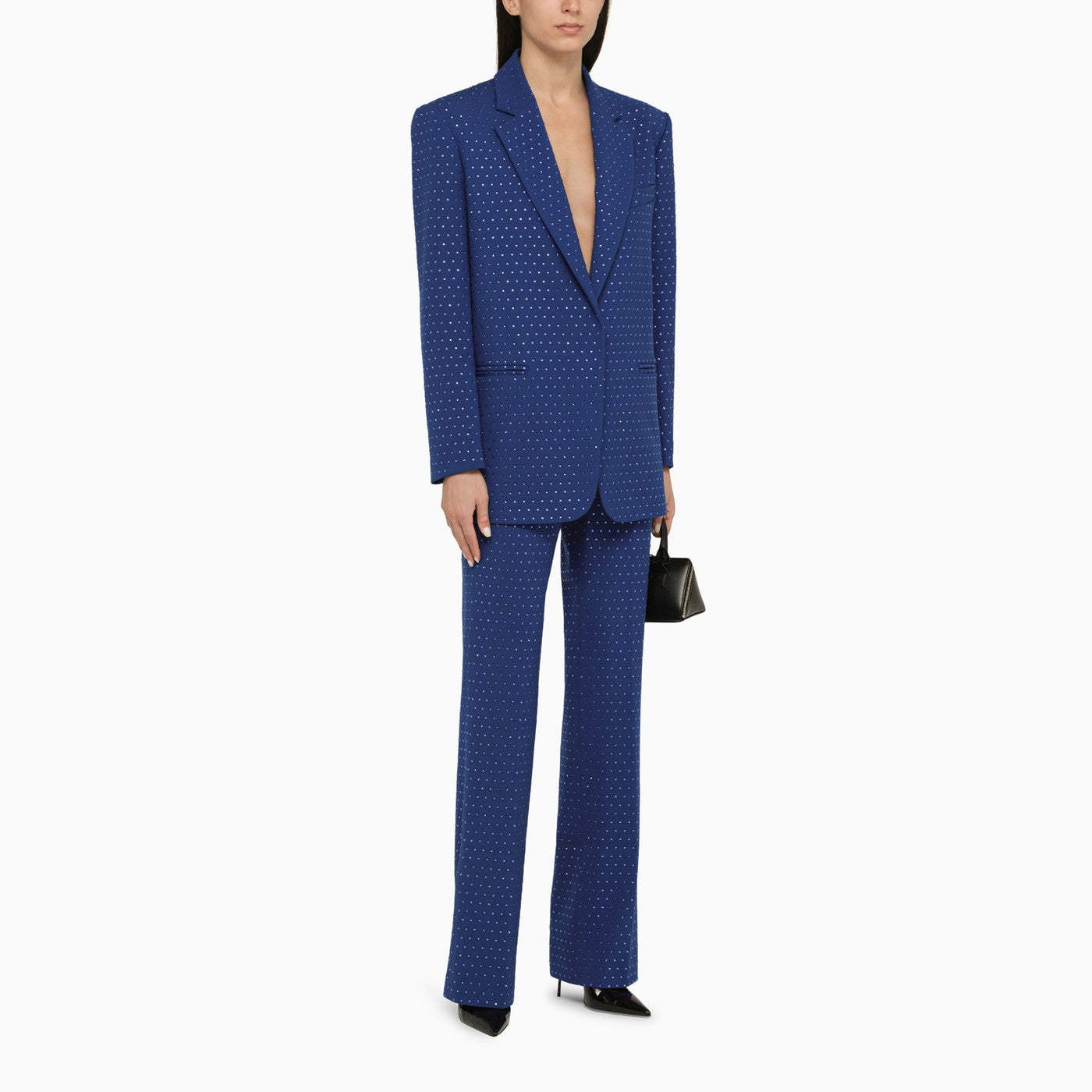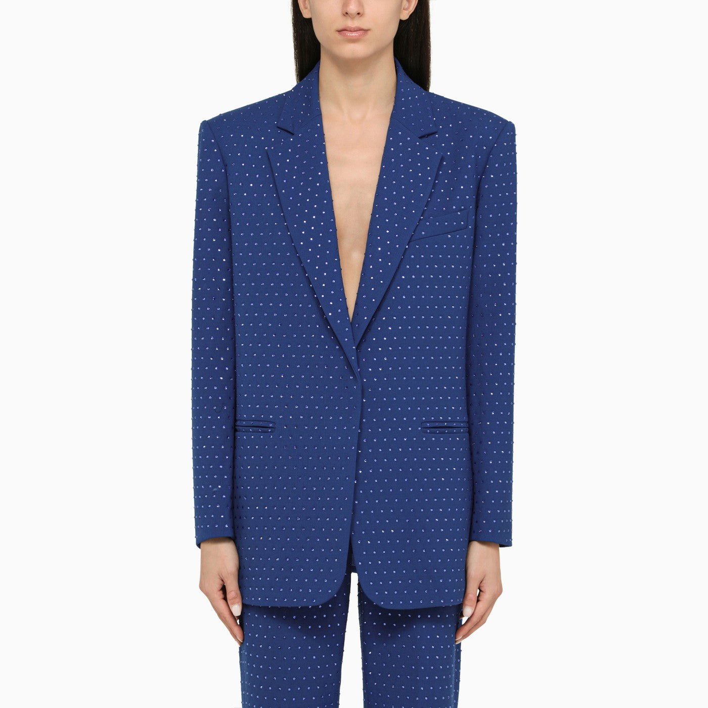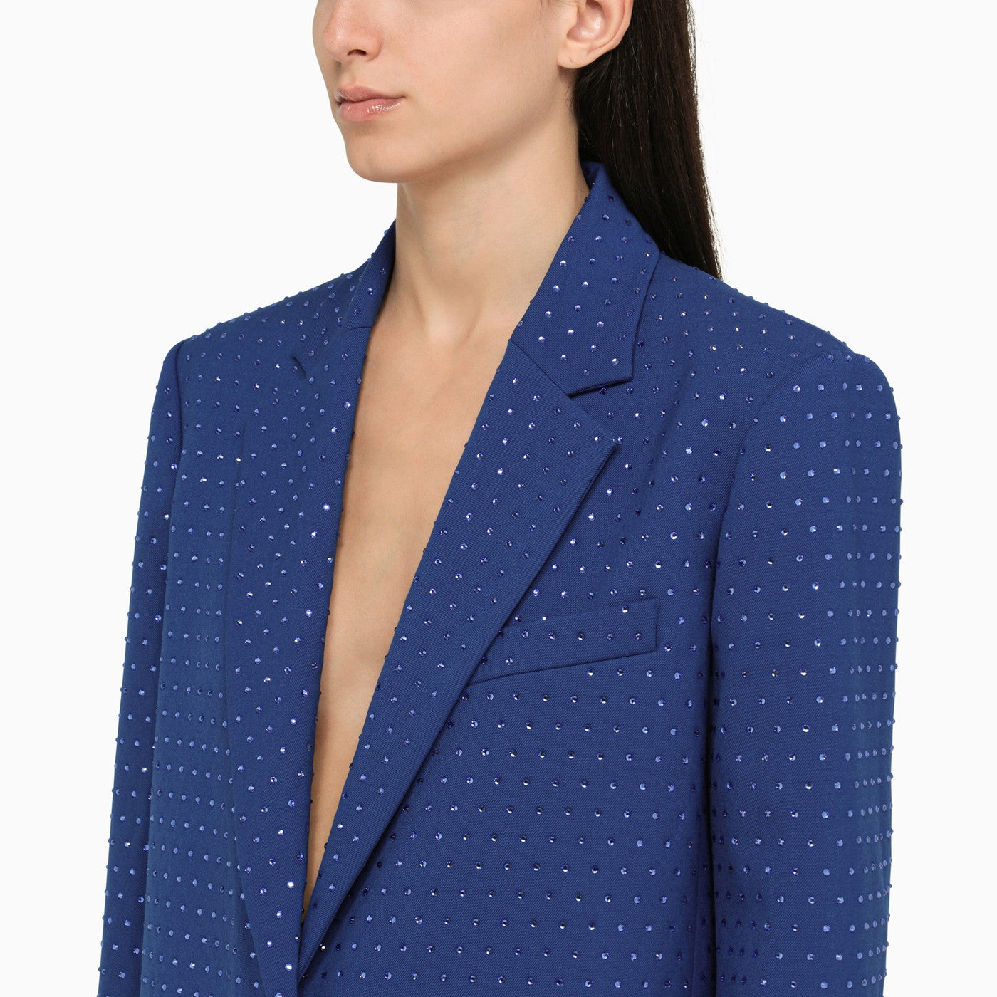 Giacca elettrica a petto singolo in nylon blu dall'Andamane con un fissaggio a bottone, maniche lunghe e tasche anteriori. Modello con micro cristalli all-over.