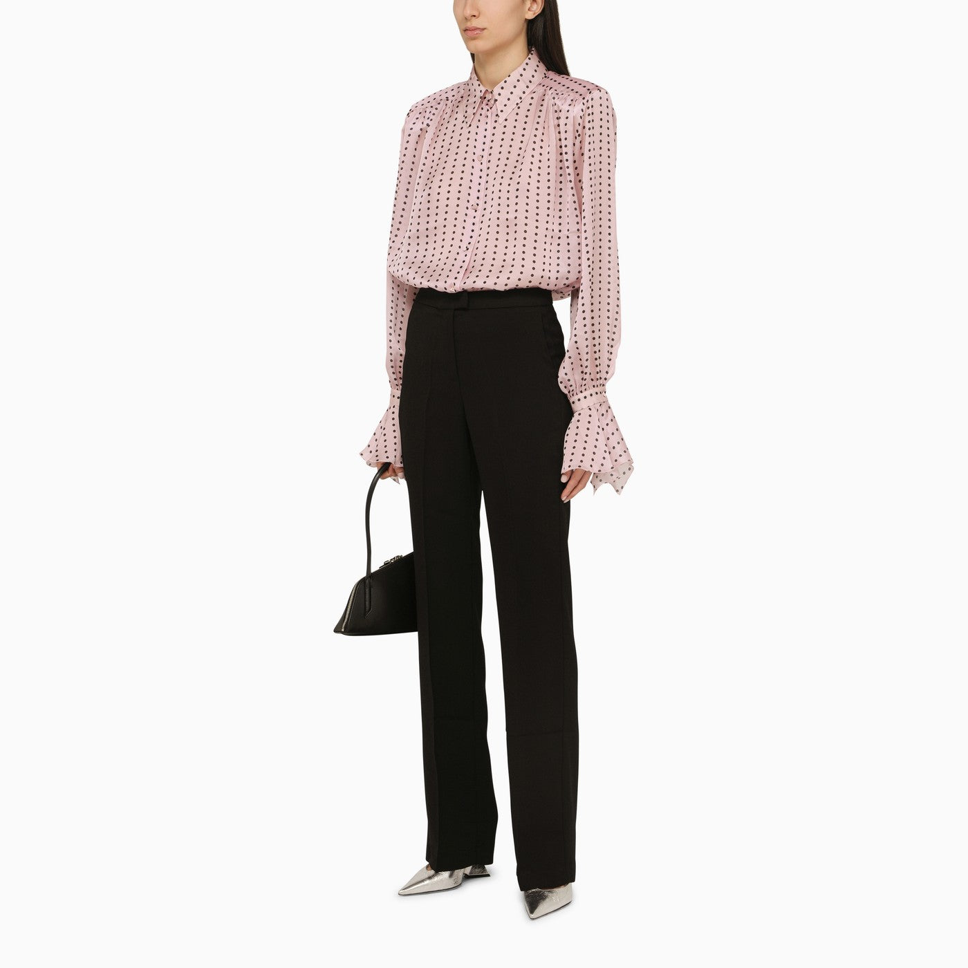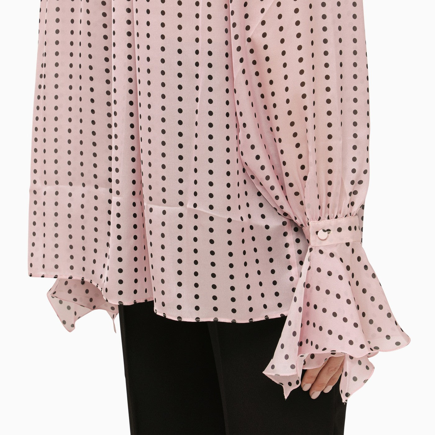 Camicia semi-trasparente in seta rosa dall'Andamano con pois neri, con un colletto appuntito, un fissaggio di un pulsante anteriore e maniche lunghe con dettagli increspati sul fondo.
