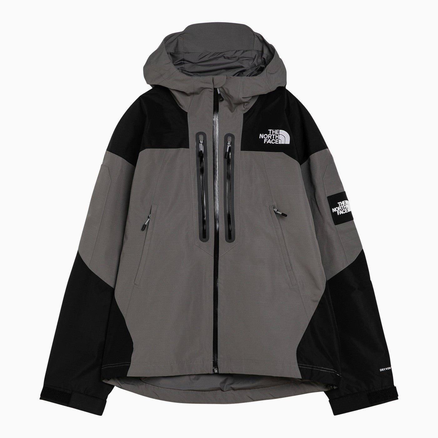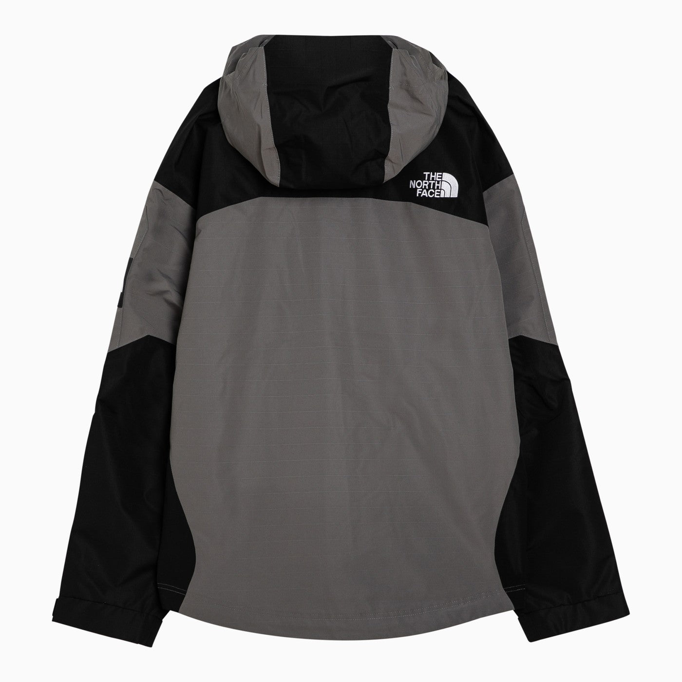 Giacca in tessuto tecnico impermeabile, traspirante e antivento grigio e nero della faccia nord, con fissaggio anteriore con zip, tasche a marmella anteriore con zip, maniche lunghe con polsini regolabili in velcro, colletto alto con cofano e logo di lettere ricamato anteriore e posteriore contrastante.