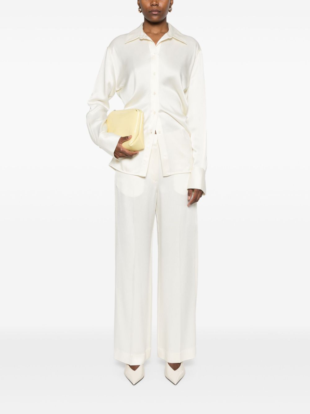 Ivory white, satin texture, soft waist, spread collar, long sleeves, buttoned cuffs, straight hem.