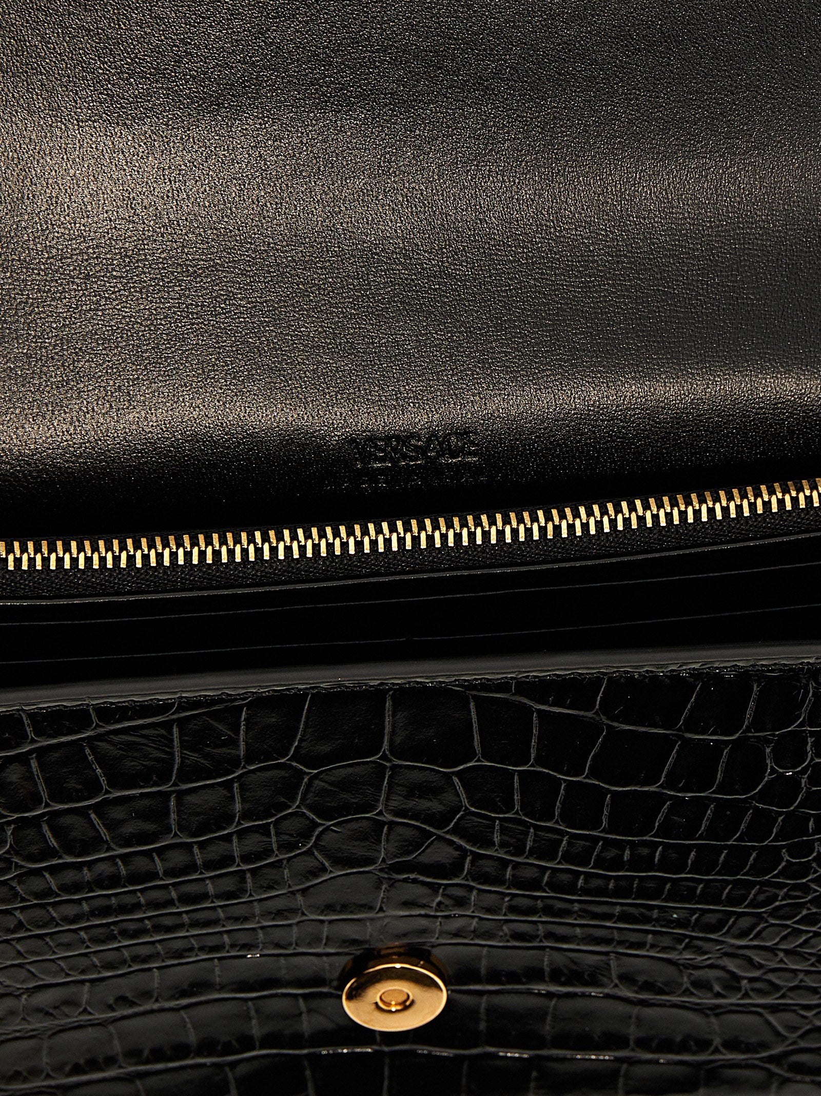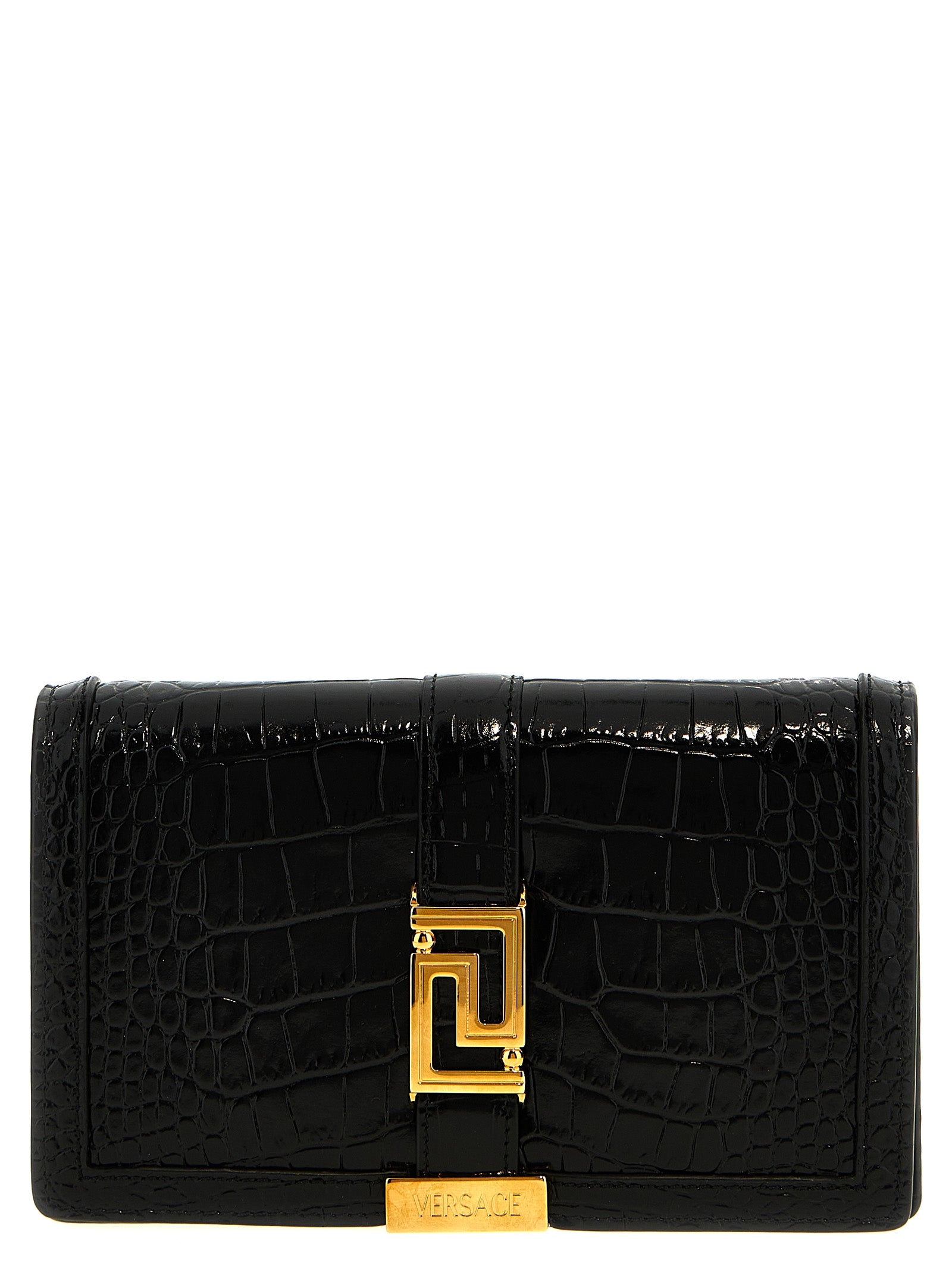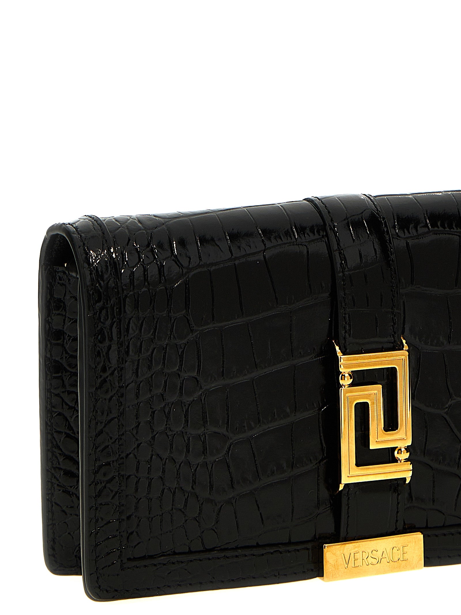 Portafoglio "Greca Goddess" in pelle con timbro di cocco dettaglio greco, chiusura del lembo, tracolla a catena rimovibile.