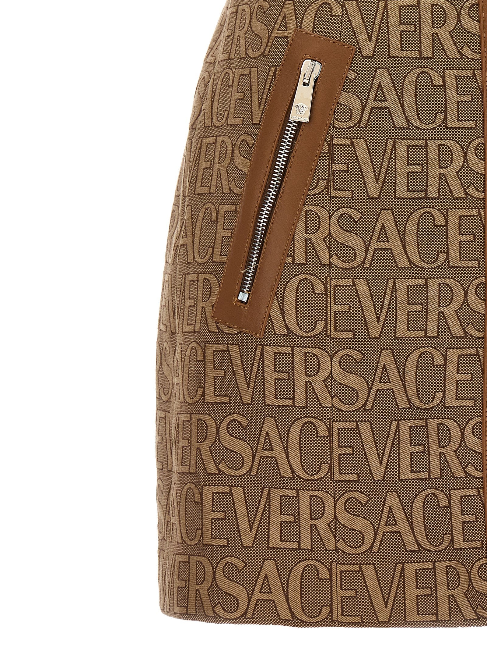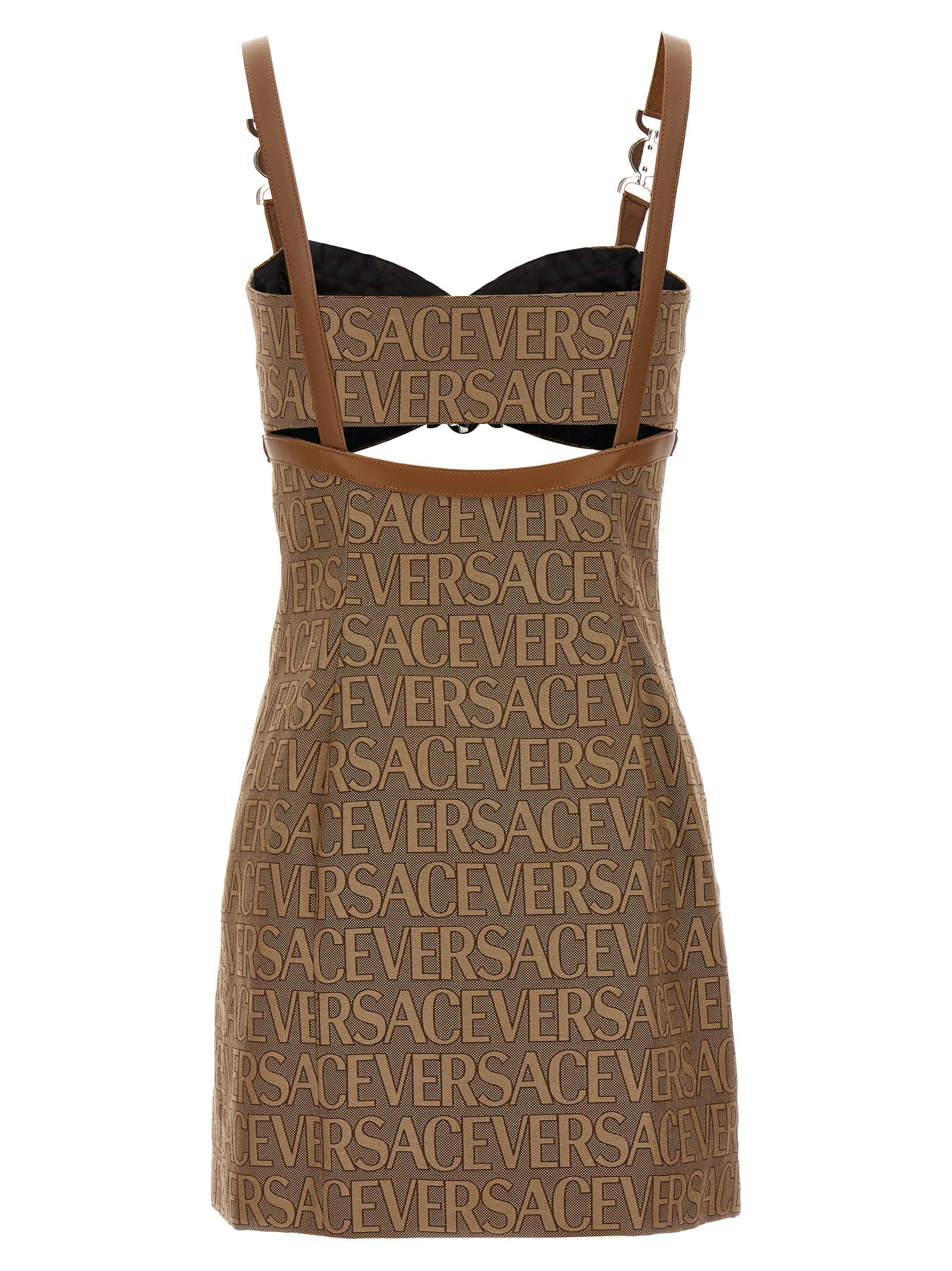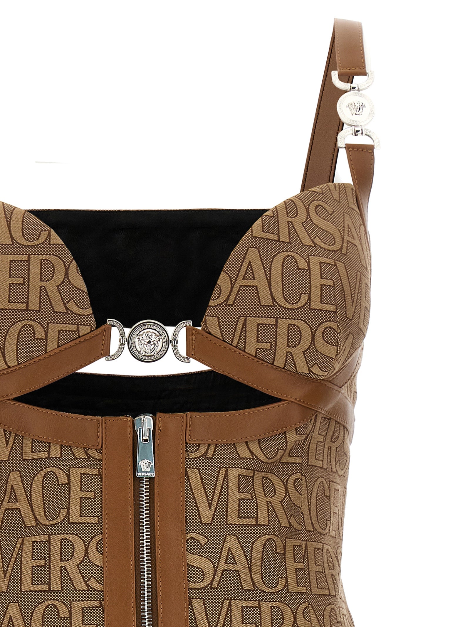 Abito capsule di miscela di cotone La Vacanza con pattern di Jacquard "Versace allover", dettagli in pelle, tazze imbottite, chiusura della cerniera anteriore e dettagli di metallo Medusa '95.