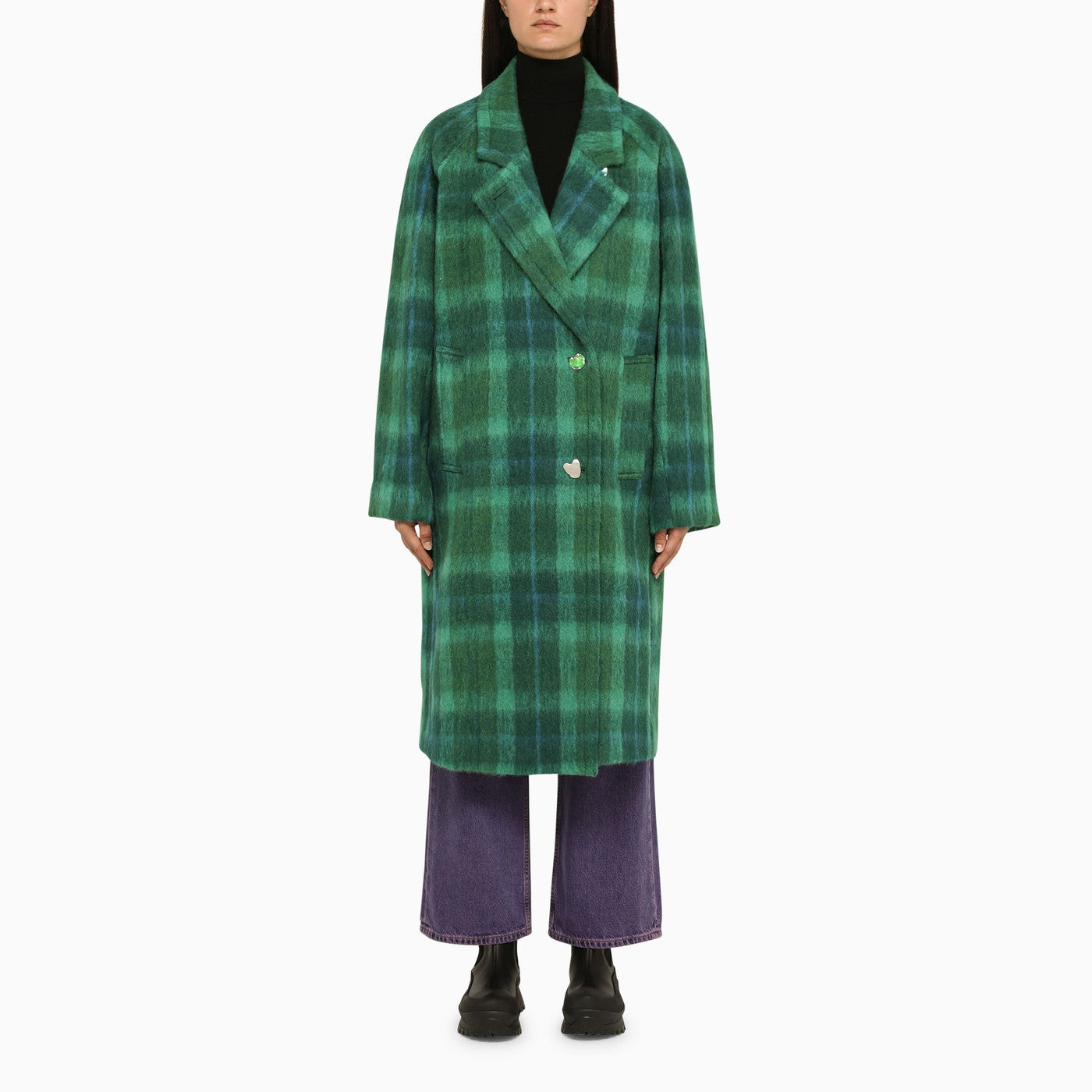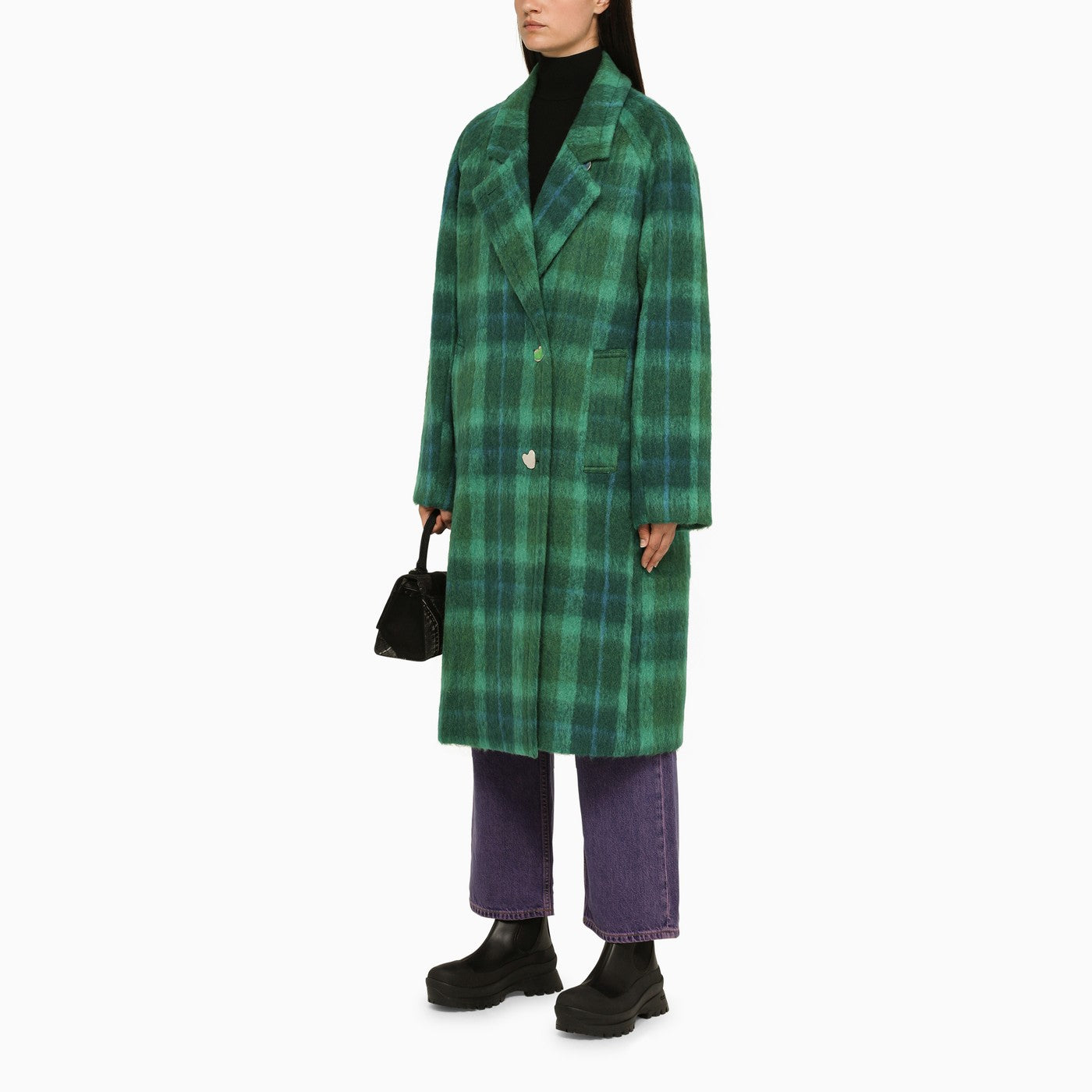 Miscela di lana di lana verde e blu che controlla il cappotto di Andersson Bell con una placca a bottone, due tasche anteriori, ampi risvolti e lunghezza del ginocchio.