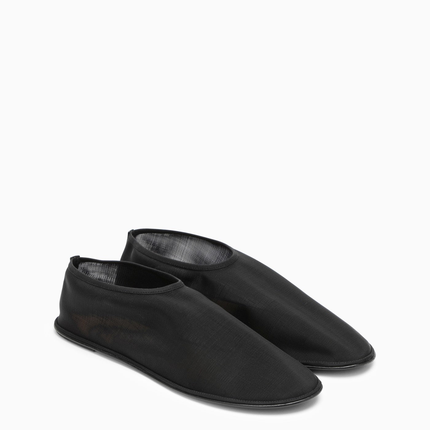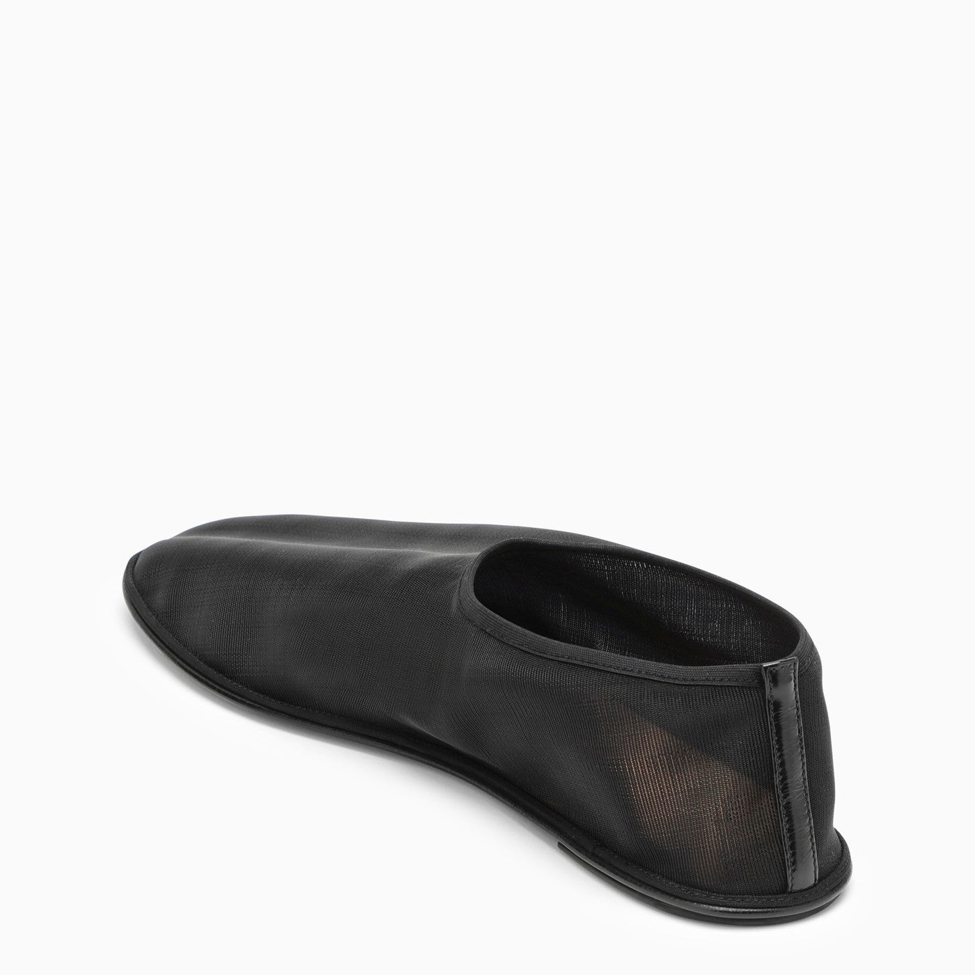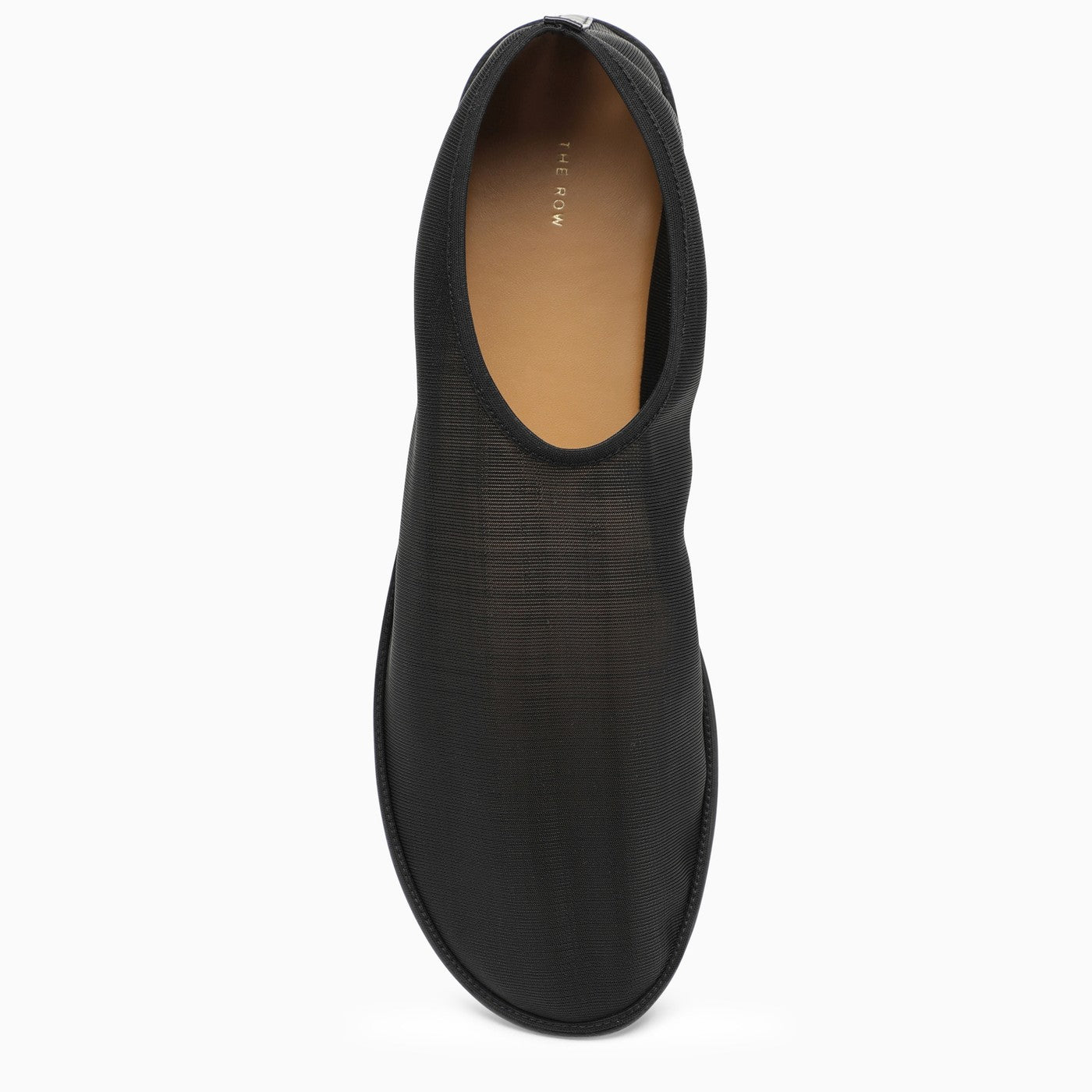 Slip-on dalla riga in mesh di nylon semi-trasparente nero, con una suola rotonda e una suola in pelle.