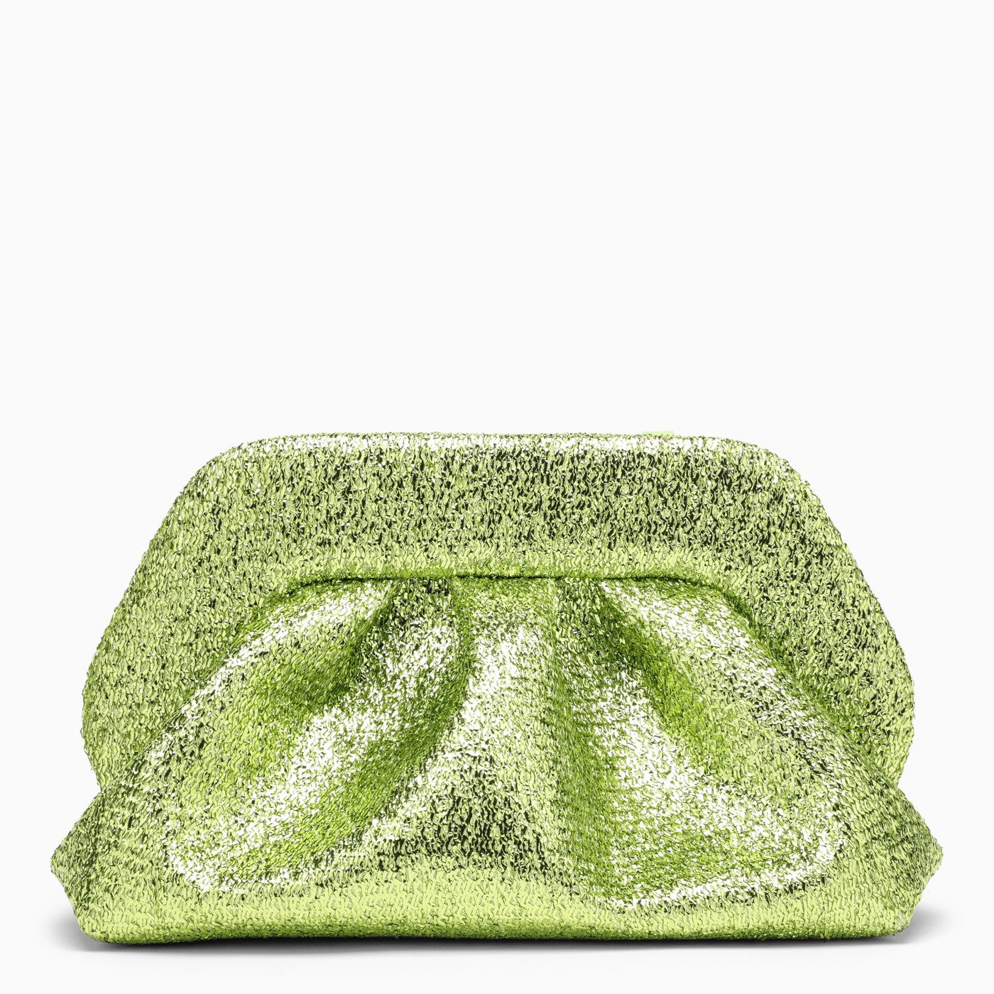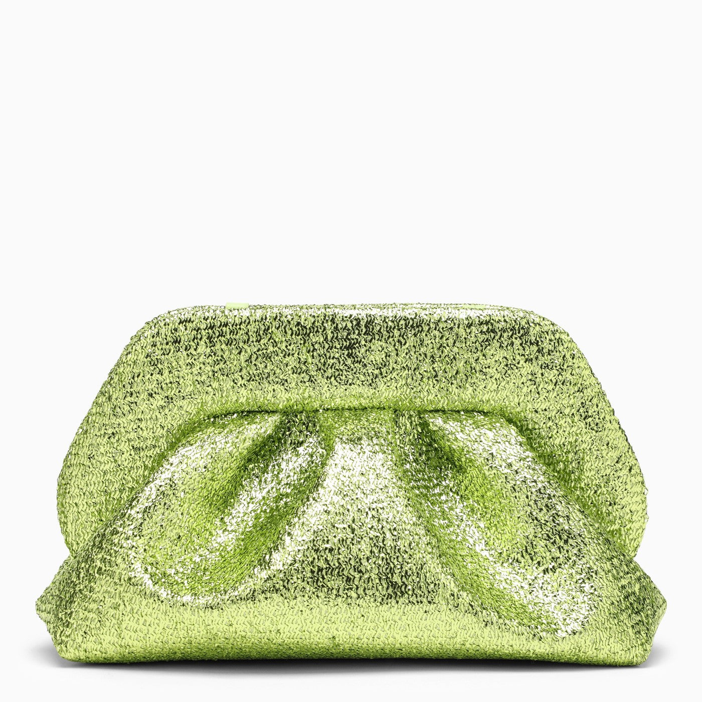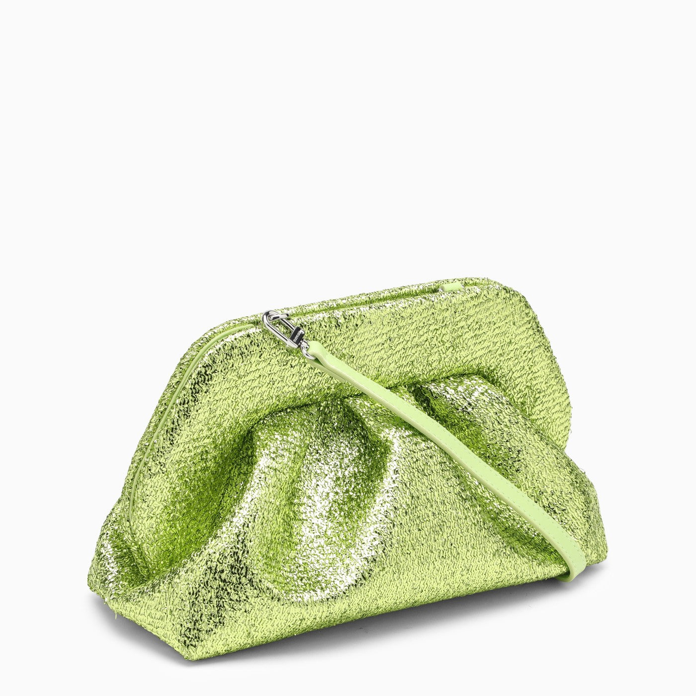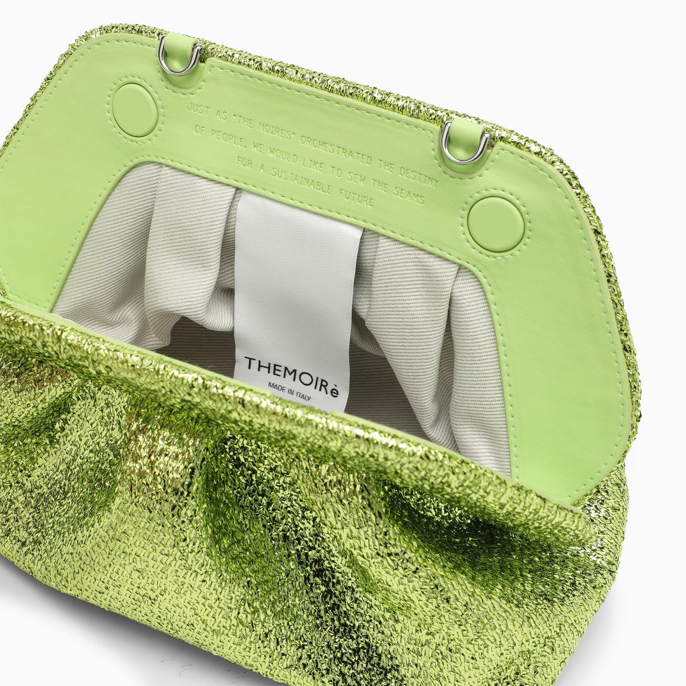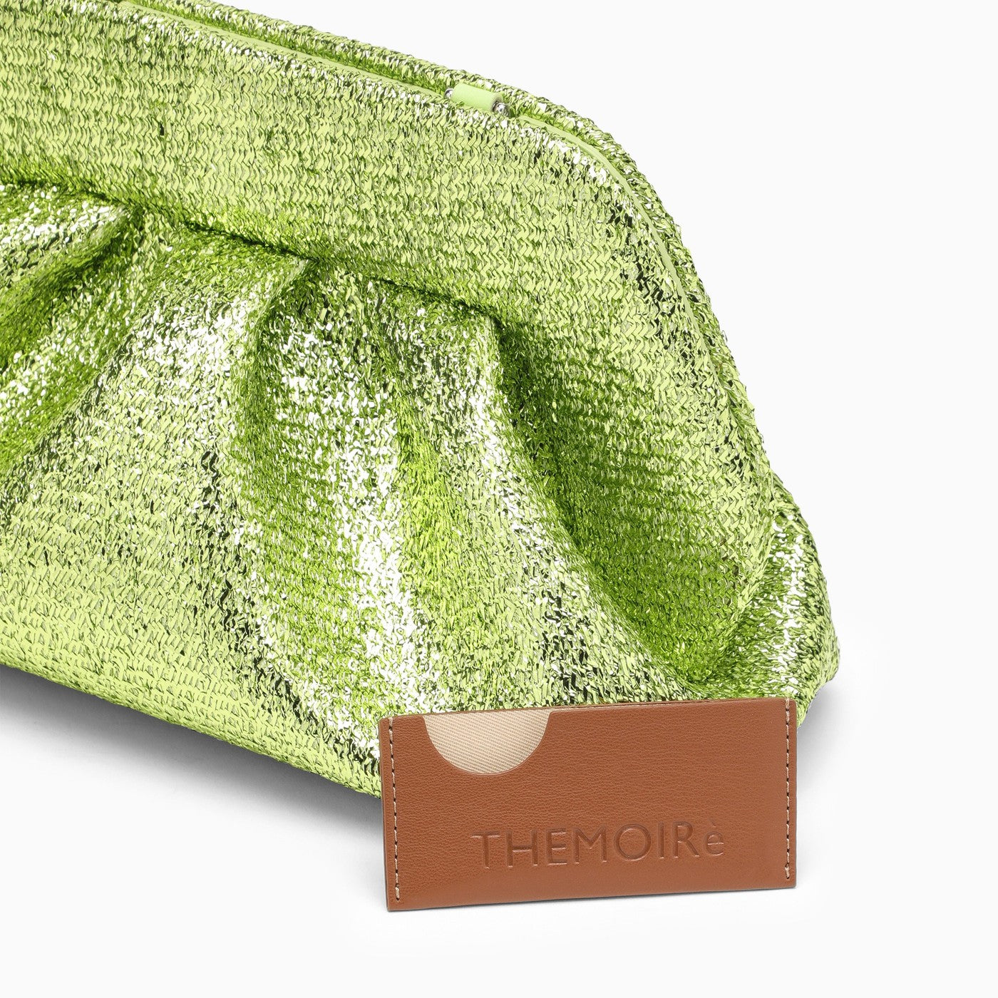 Frizione in pelle verde brillante da temiirè con una doppia chiusura magnetica, volant decorativi, una tracolla rimovibile, fodera in tessuto e hardware in metallo color oro.