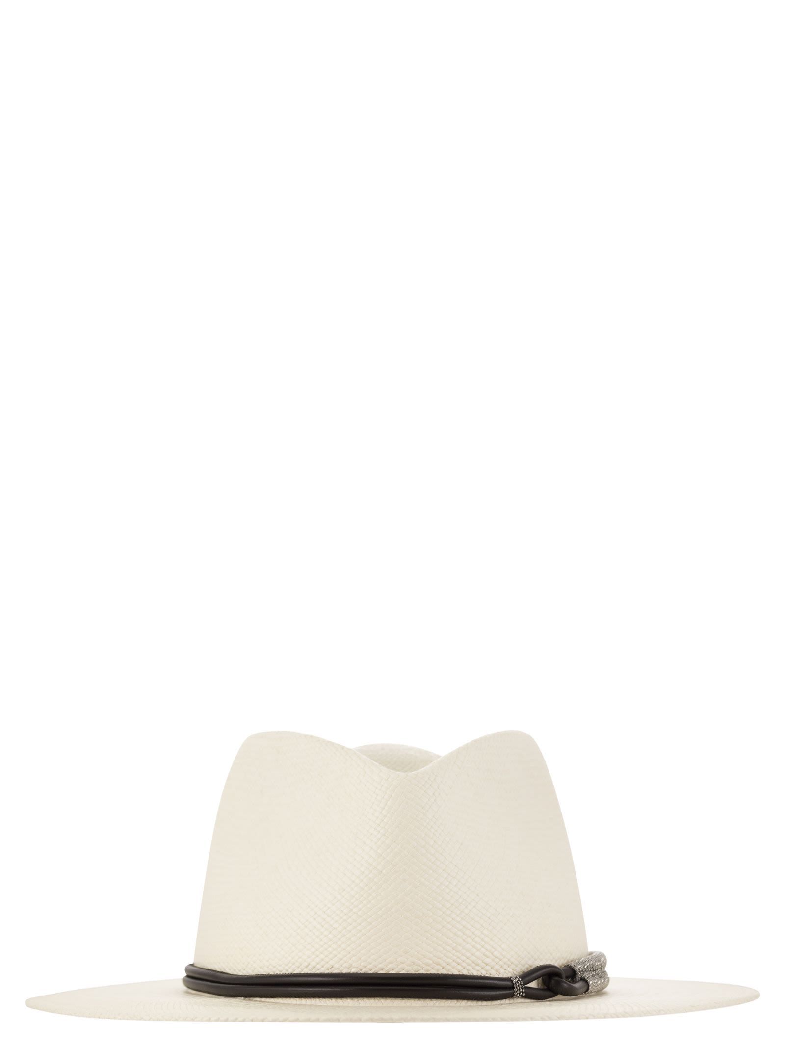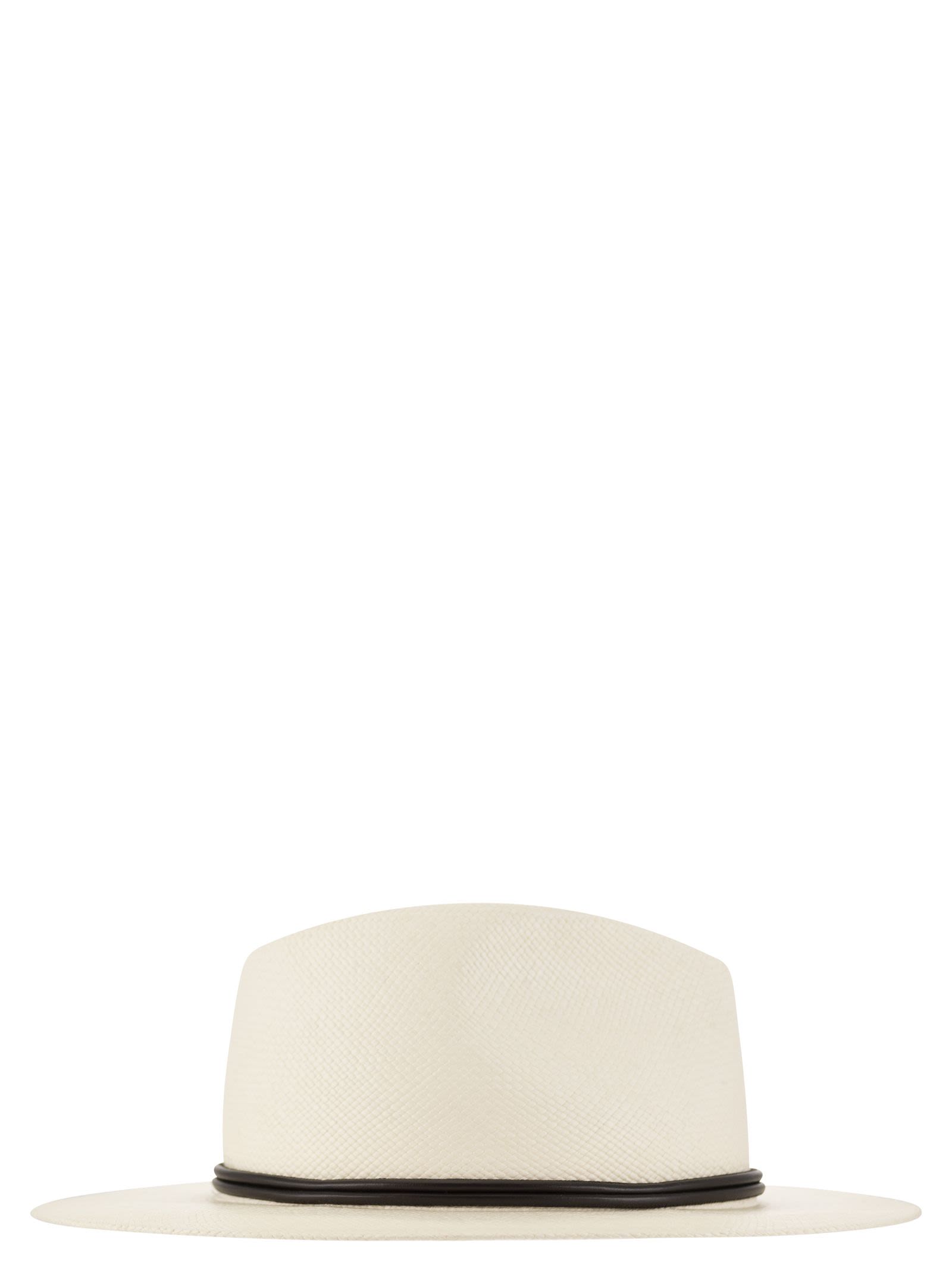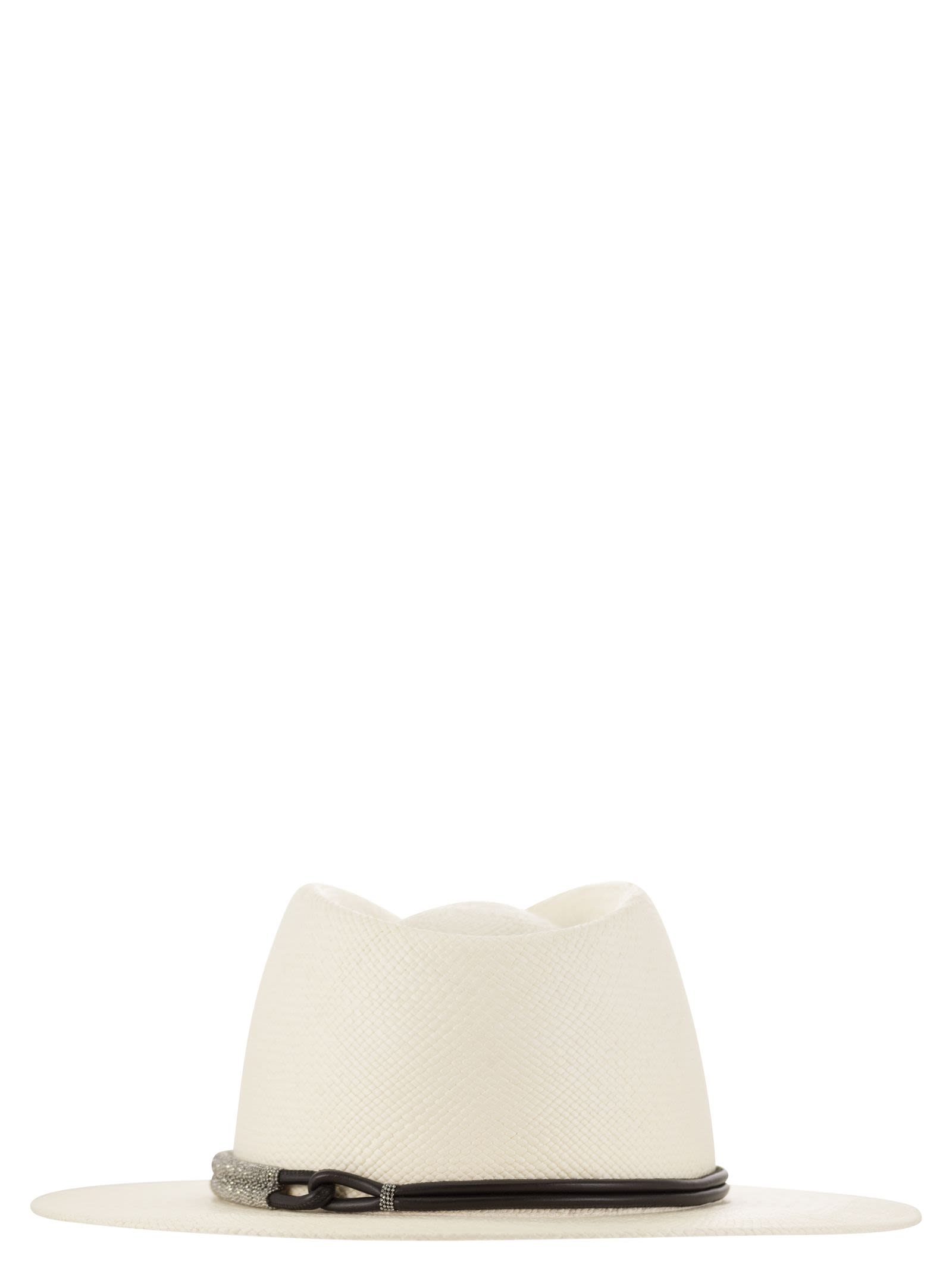 Fedora di paglia di Brunello Cucinelli con fascia e collana in pelle