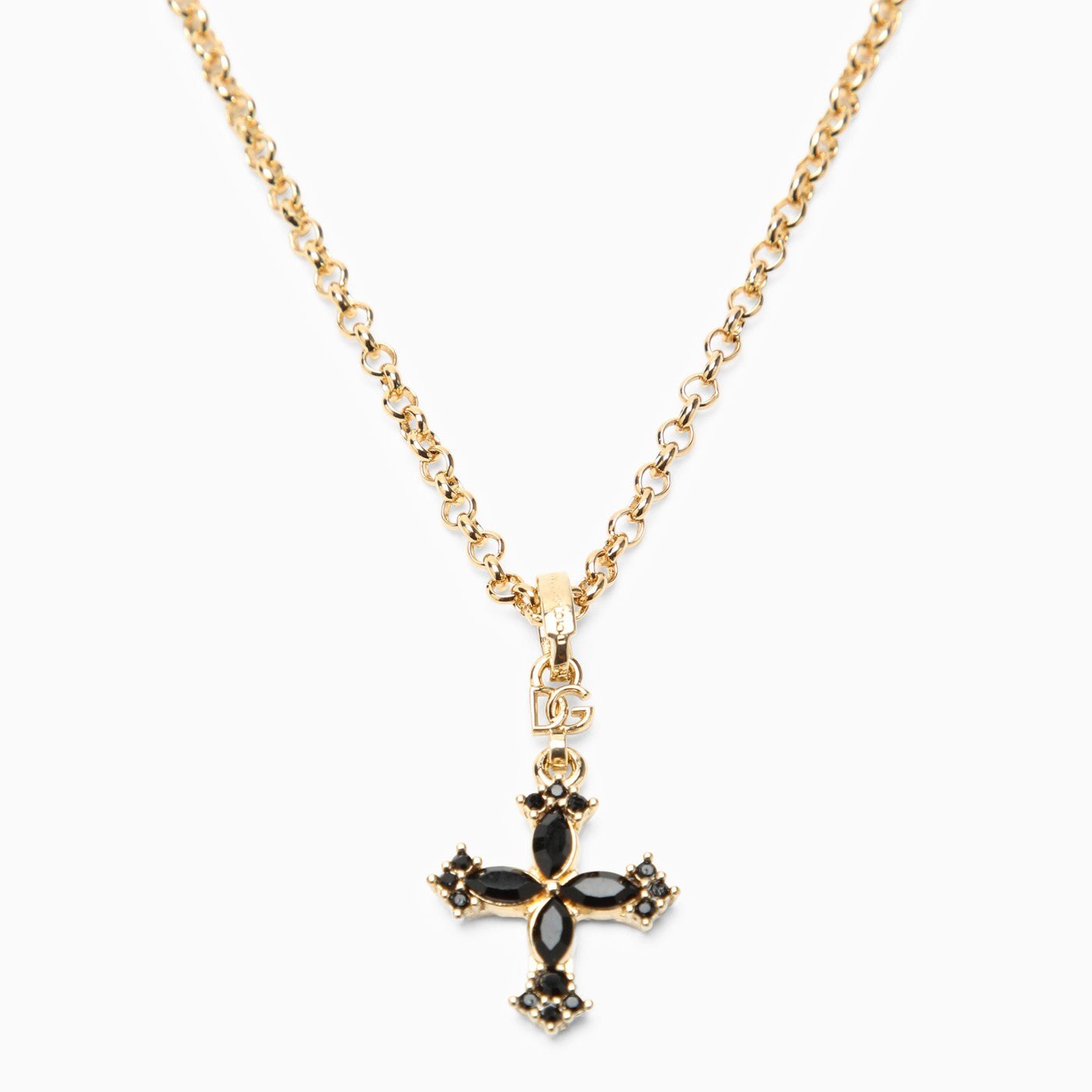 Collana in acciaio di Dolce & Gabbana con una sottile catena placcata in oro con una croce nera con strass, un piccolo logo e un fissaggio di stretta di aragosta.