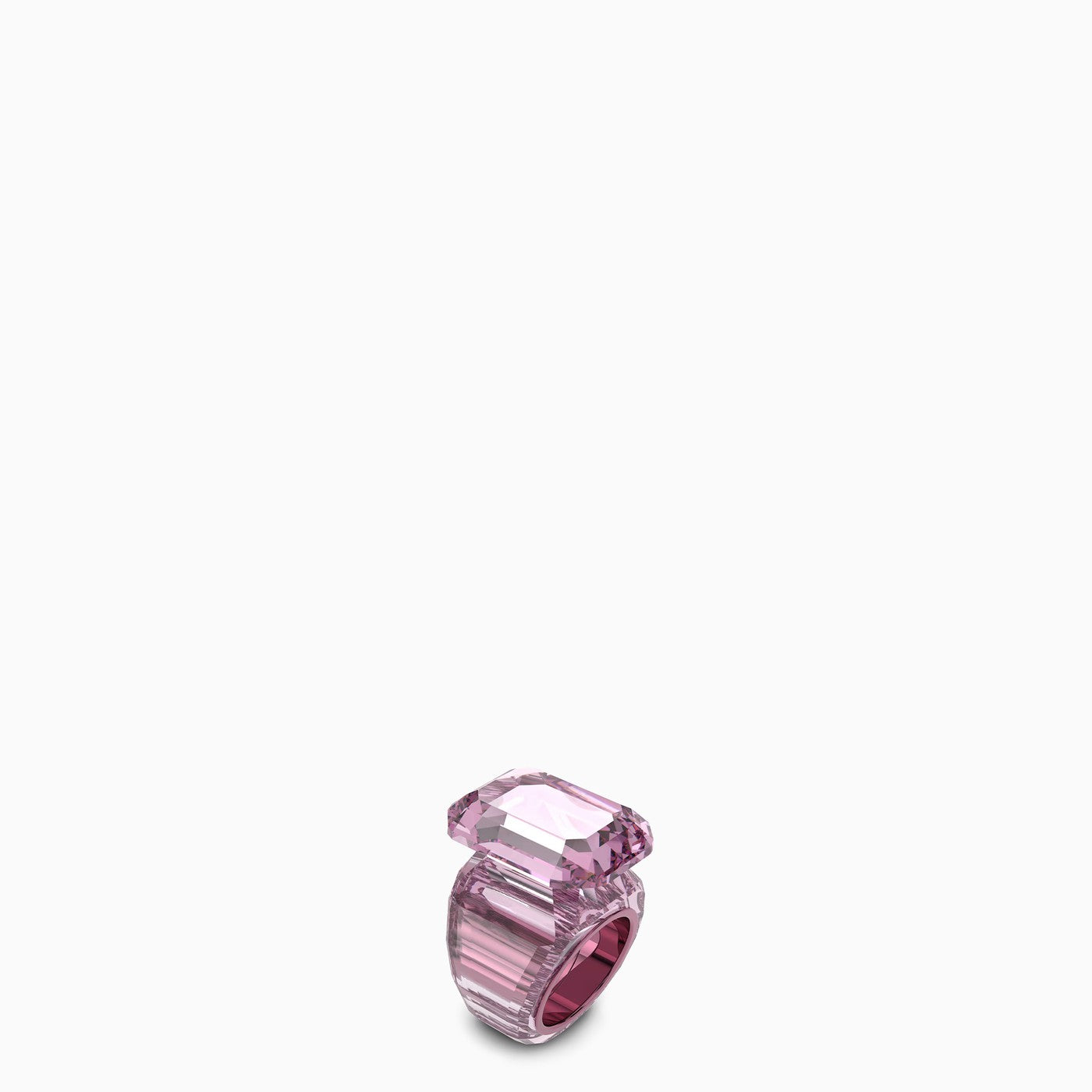 Anello di cristallo rosa di Swarovski, con una banda sormontata da un cristallo tagliato ottagono e un interno in metallo nella stessa tonalità.