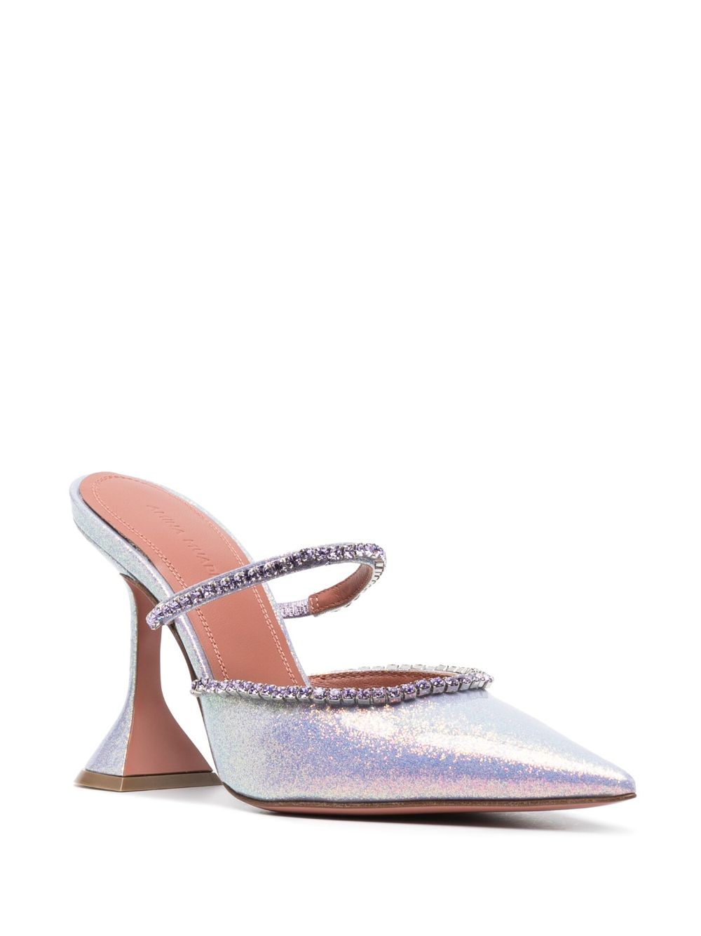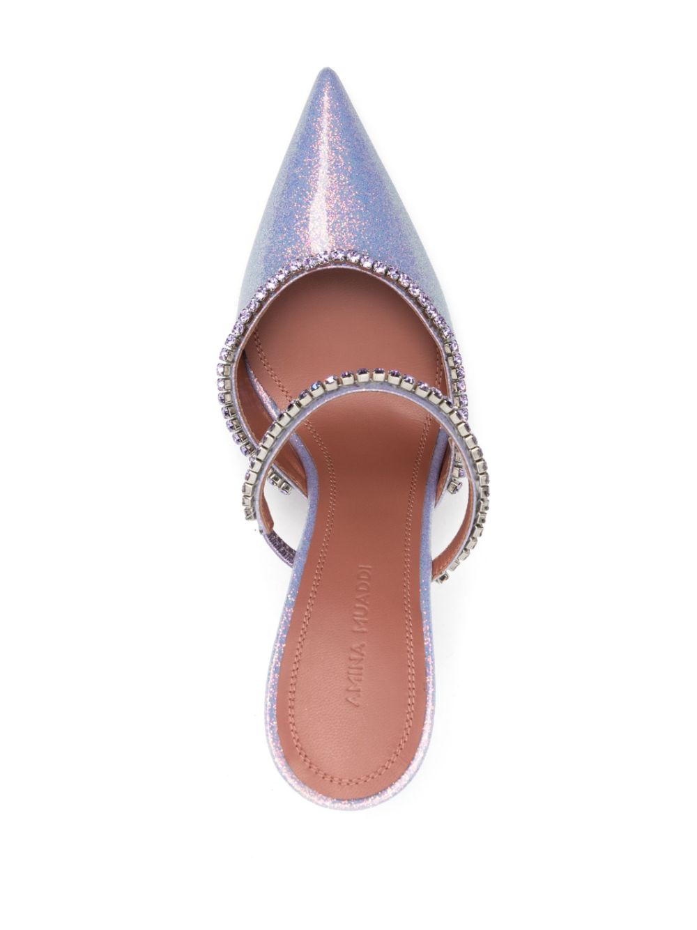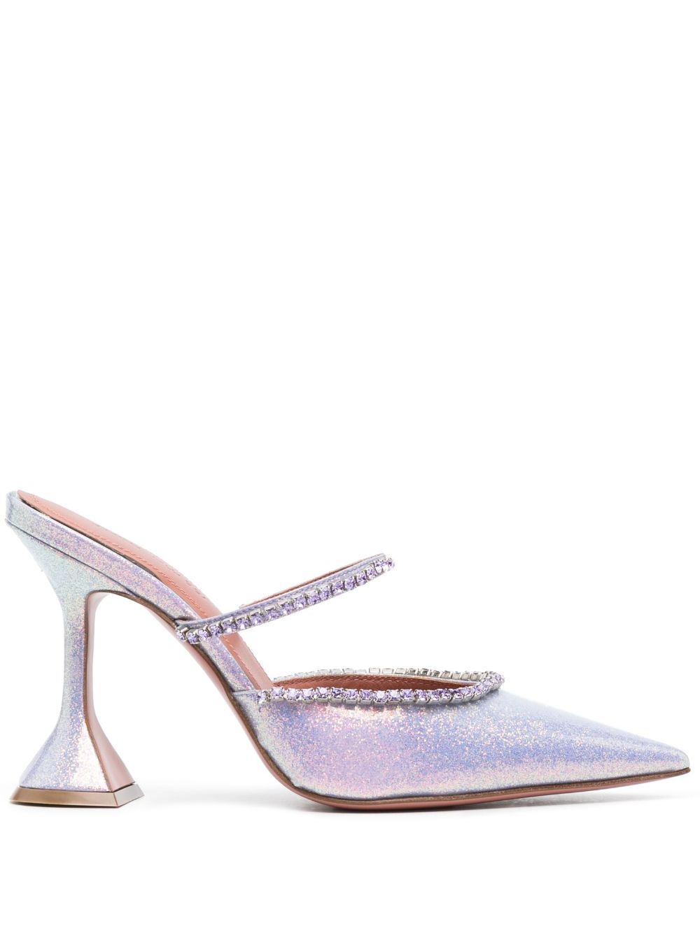Muli a punta a punta di Gilda da 100 mm di Amina Muaddi con lilla, pelle di vitello, dettagli glitter, abbellimenti di cristallo, punta puntata, stile slip-on, pista di marca, pista marca e tacco scolpito alto.