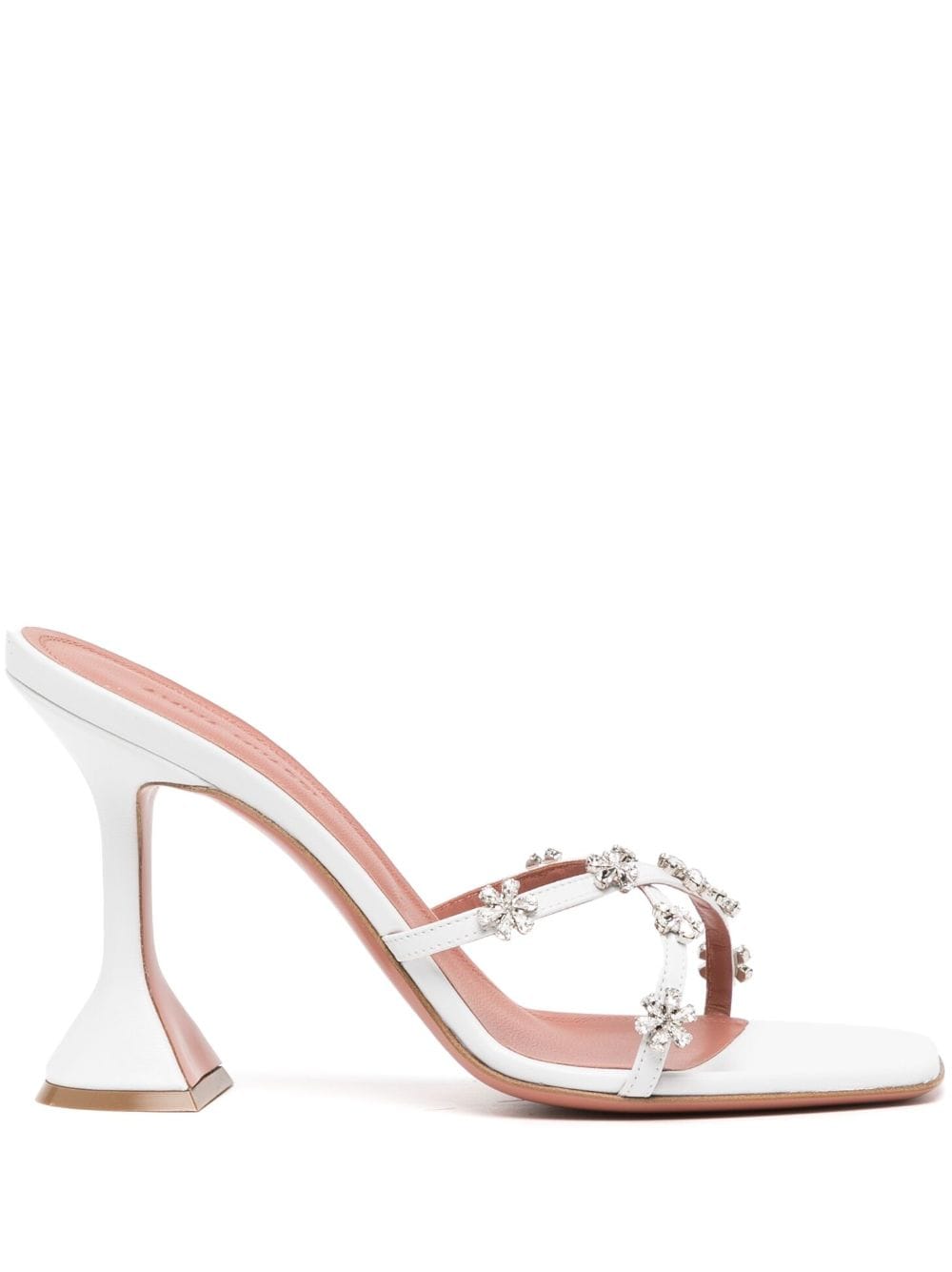 Muli in pelle Lily da 115 mm di Amina Muaddi con bianco, in pelle, abbellimento di cristallo, cinturino crossover sulla punta, punta aperta, sole in pelle di marca e tallone scolpito.