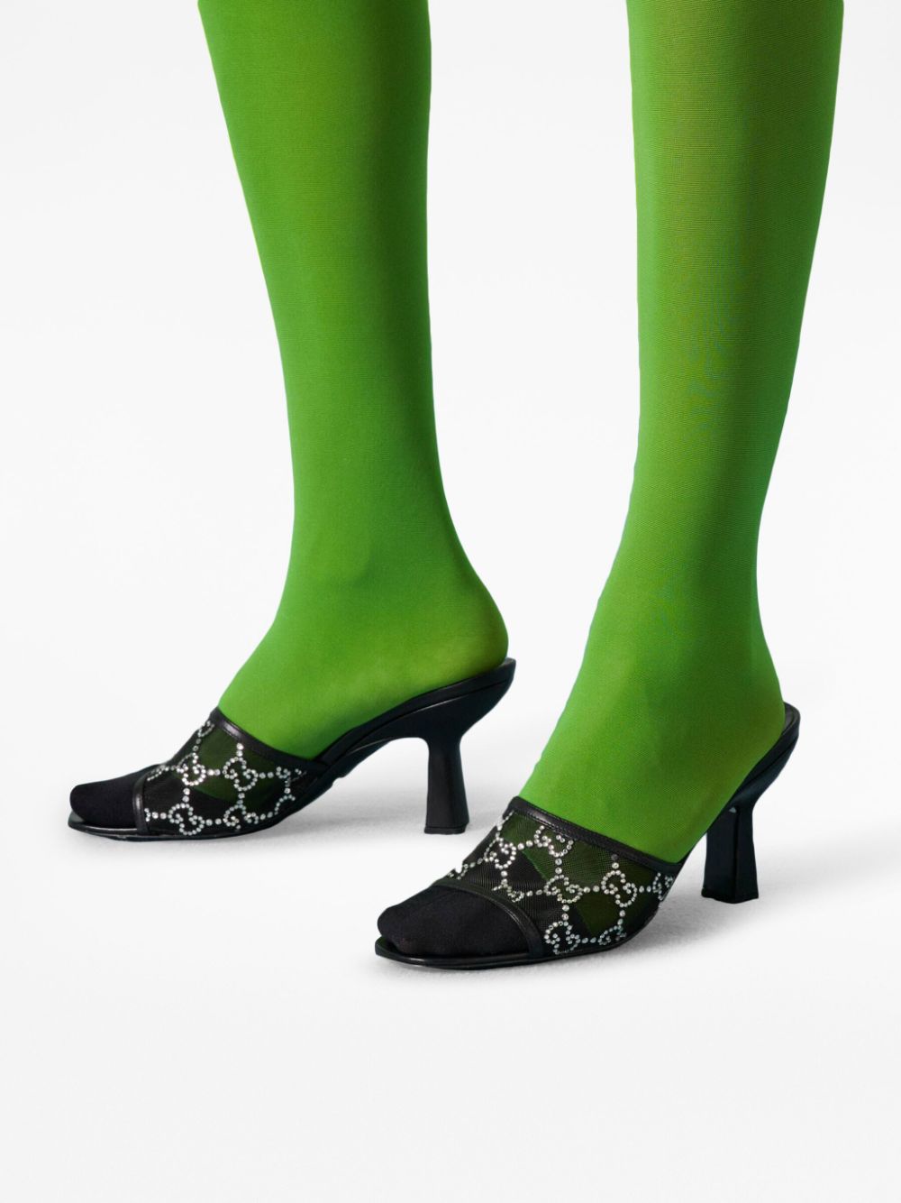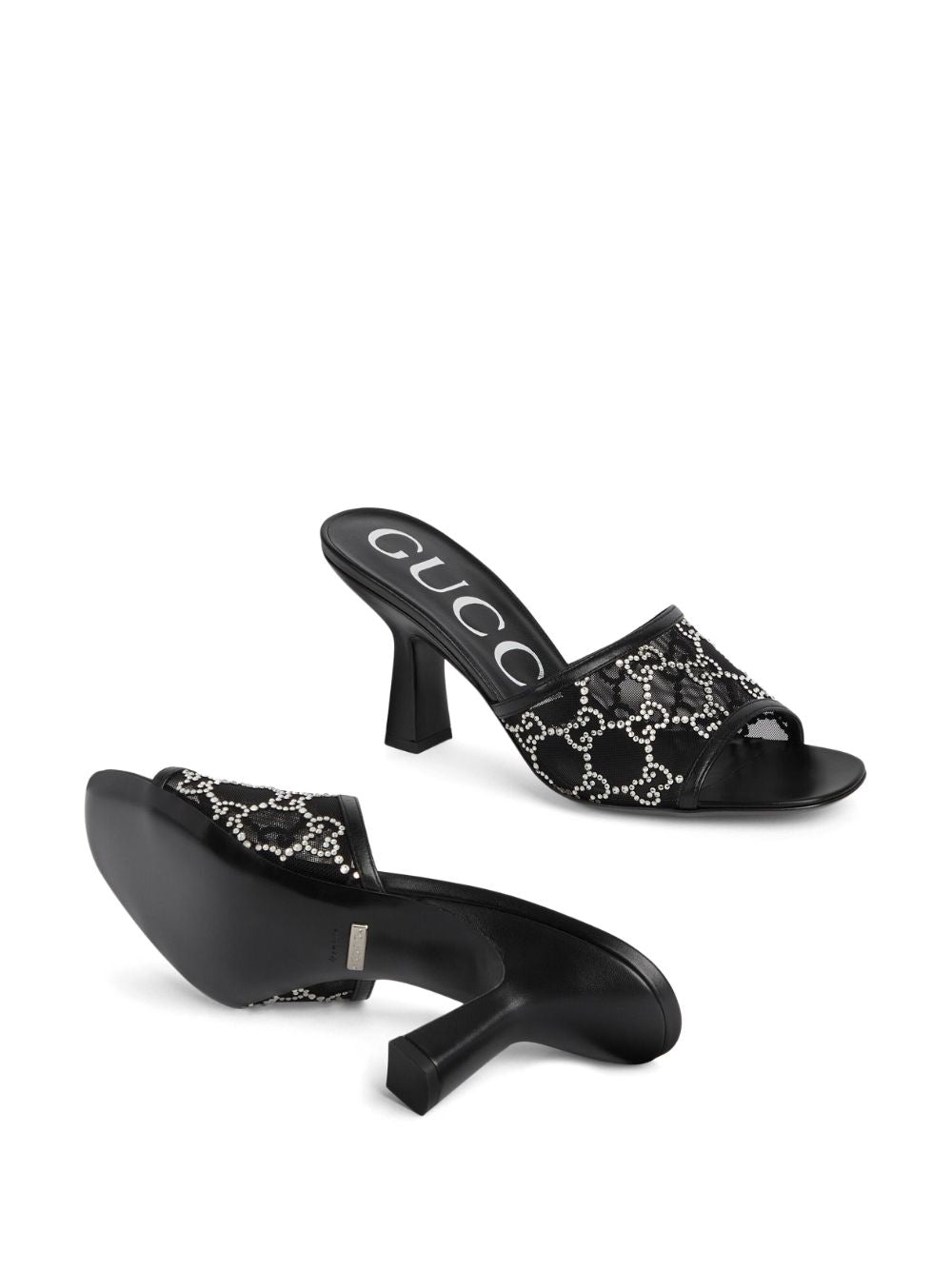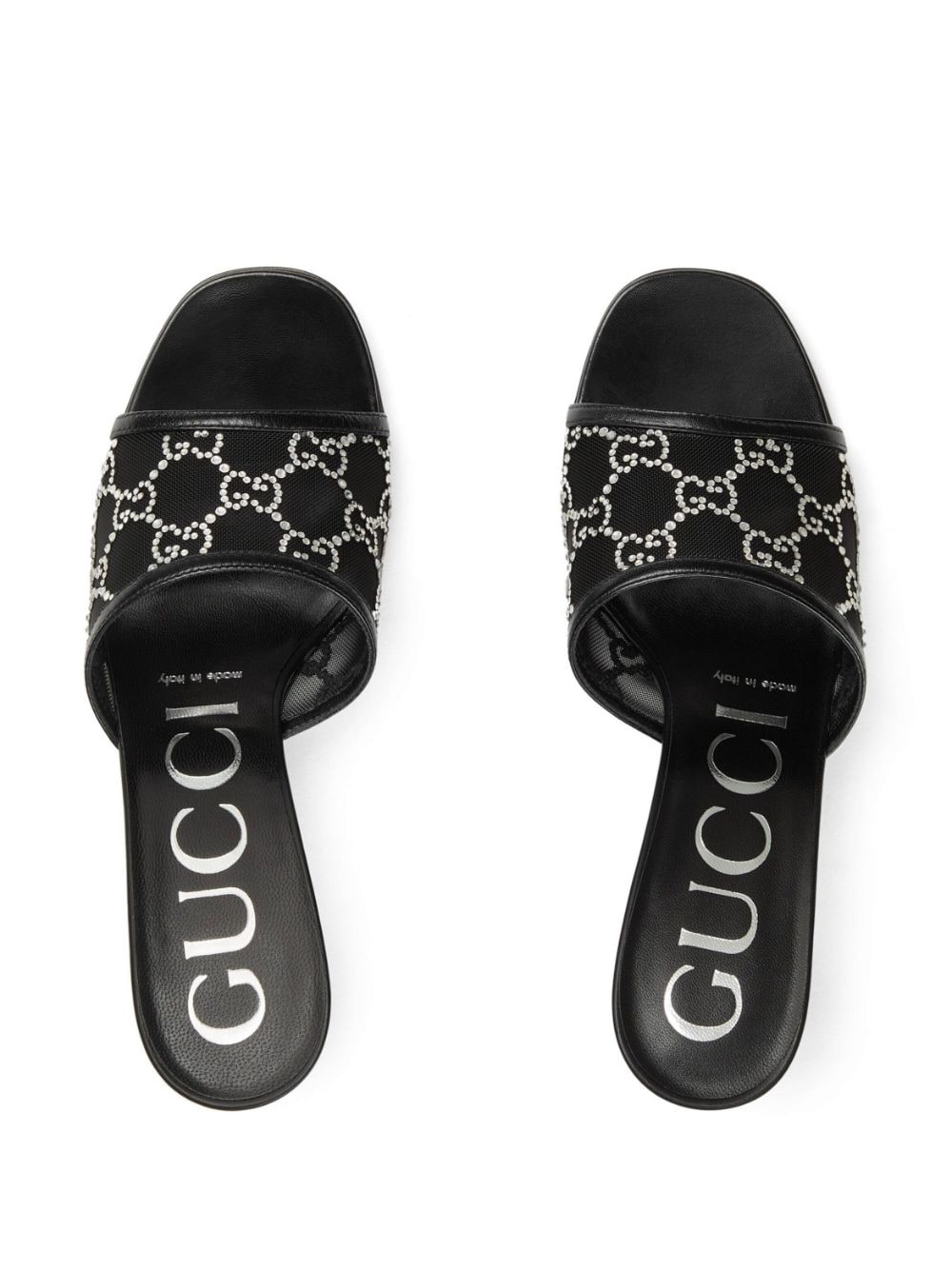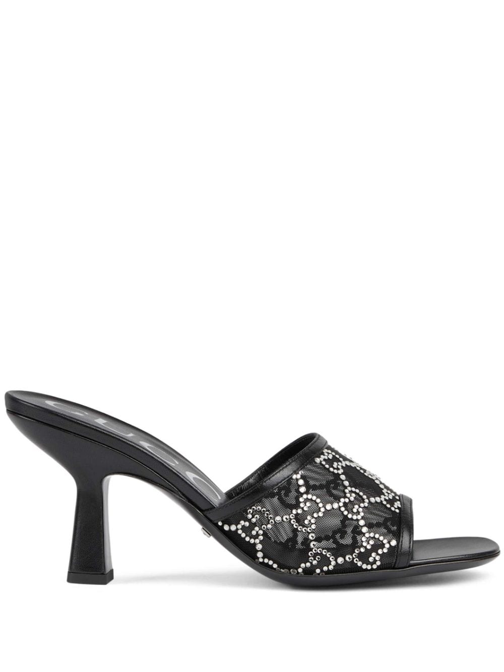 Sandali da 75 mm in cristallo GG con Gucci con nero, pelle, logo G doppio G, abbellimento di cristallo, punta aperta, tacco medio, sole in pelle di marca e stile slip-on.