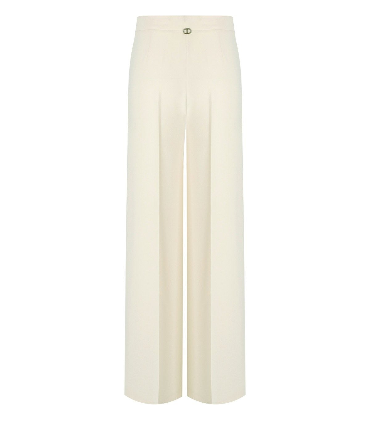 Pantaloni gemelli fatti di crêpe per allungamento fluido in toni bianchi della madreperla. Caratterizzato da una silhouette palazzo, è rifinita con una piega pressata sul davanti e sul retro. Presenta una chiusura invisibile con zip sul lato ed è adornata sul retro con una piastra di logo in metallo oro. Gamba larga. Adattamento regolare. Composizione: 100% poliestere.