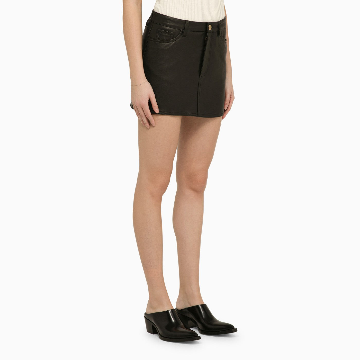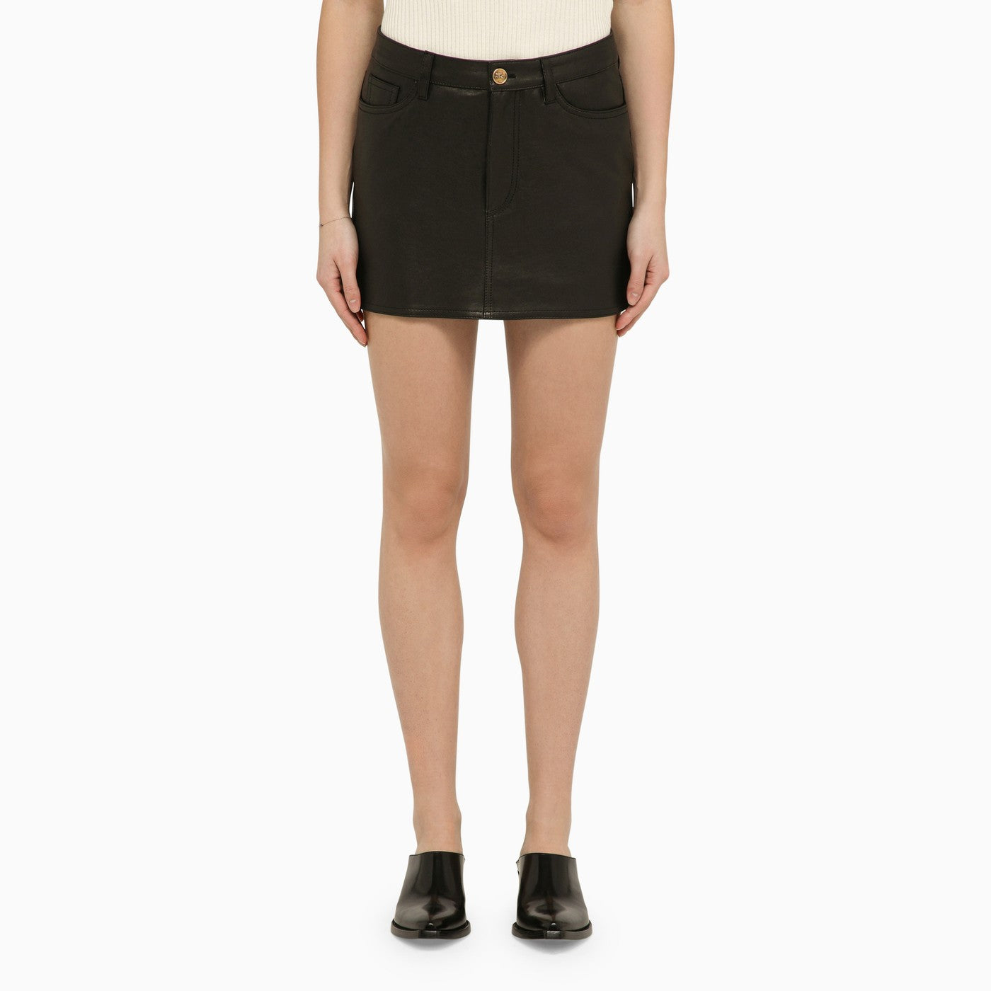 Mini gonna in pelle nera di Etro con zip anteriore e fissaggio a bottone in oro, cinque tasche classiche e anelli della cintura.