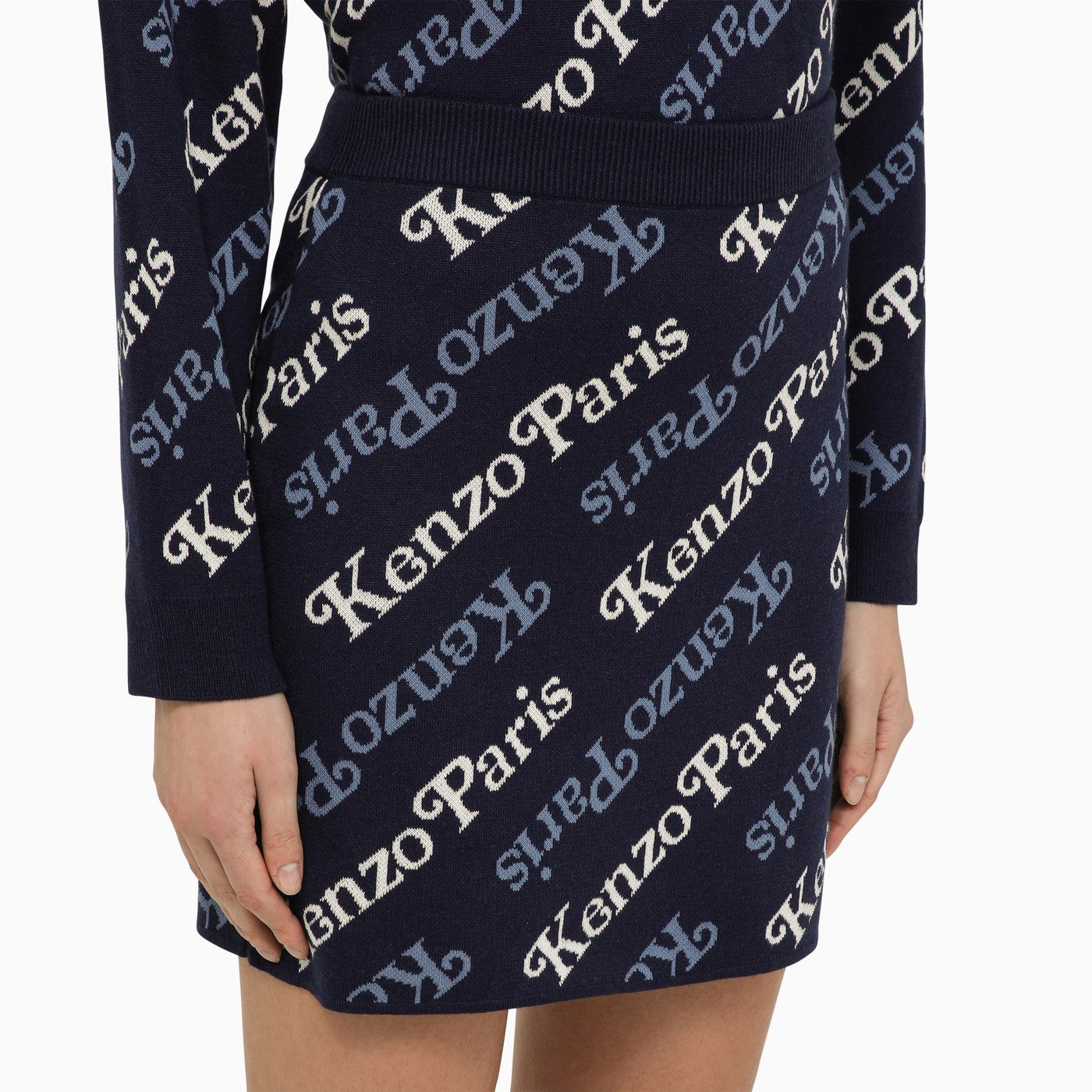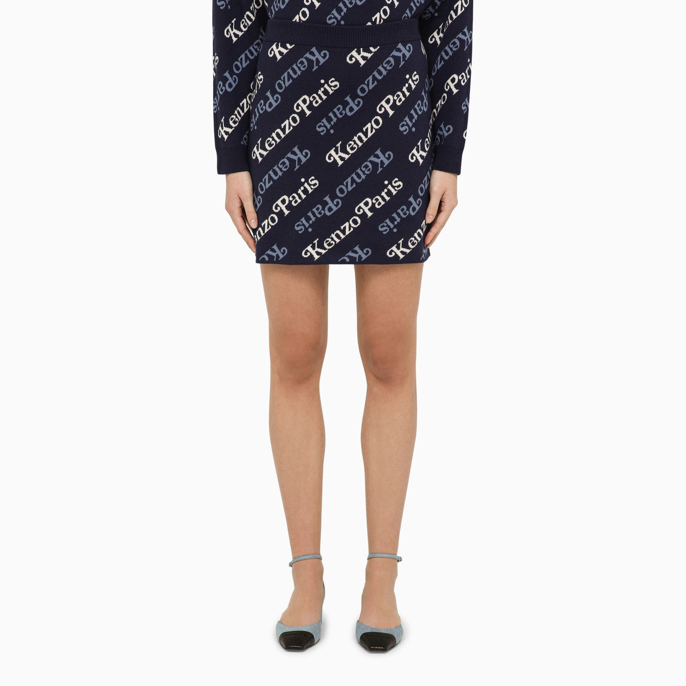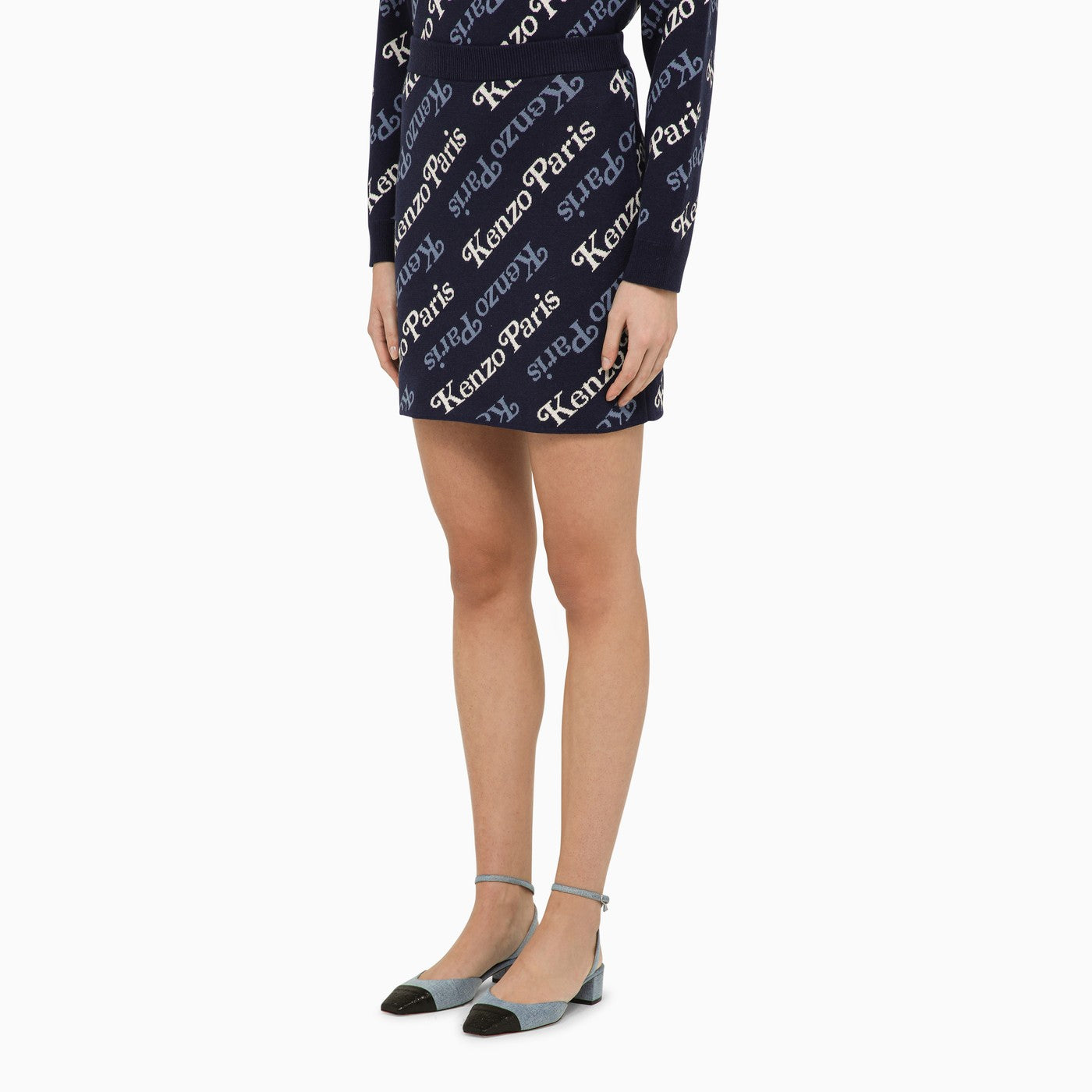Midnight Blue Wool and Cotton Mini Swirt di Kenzo presenta una cintura elasticizzata e un logo di lettere all-over contrastante.