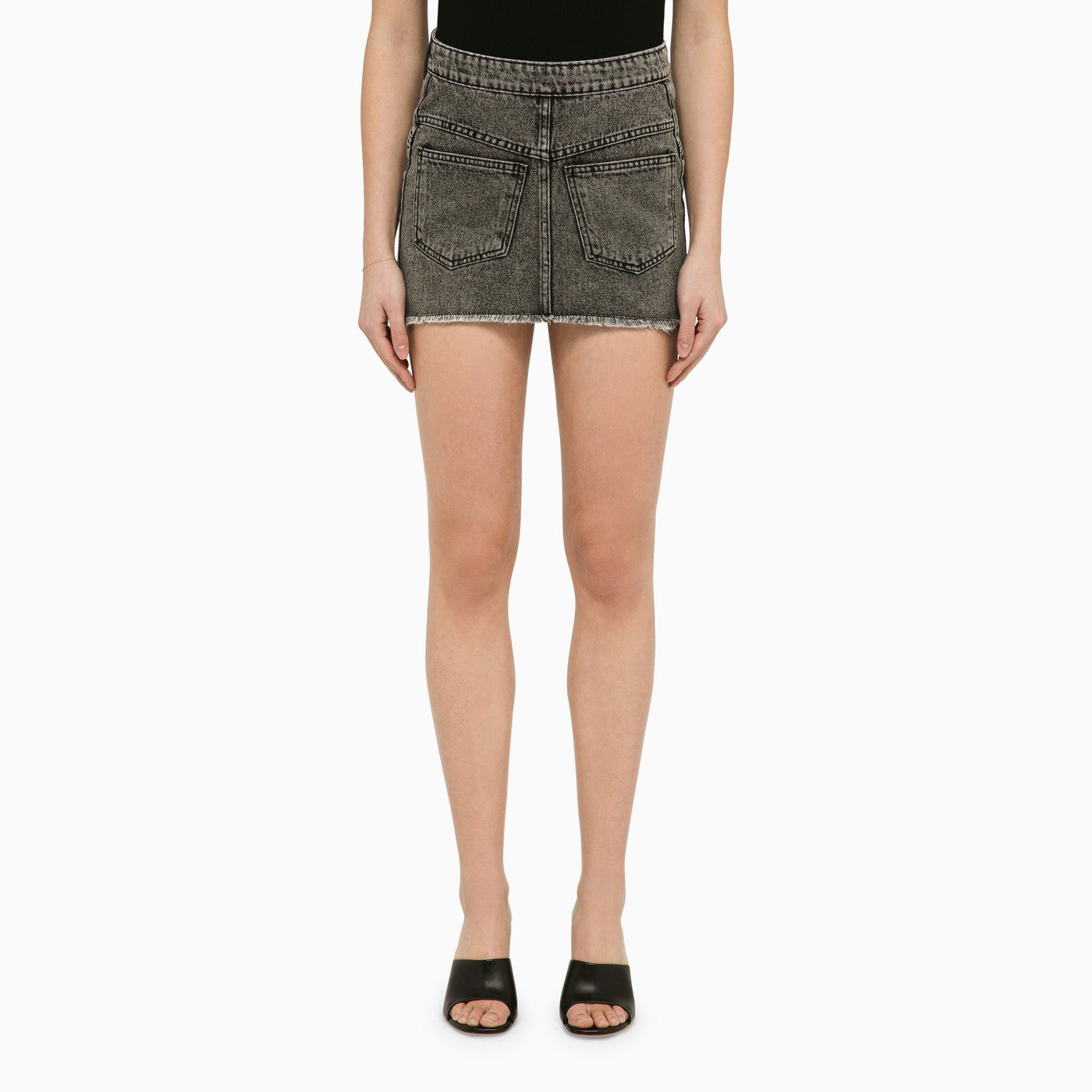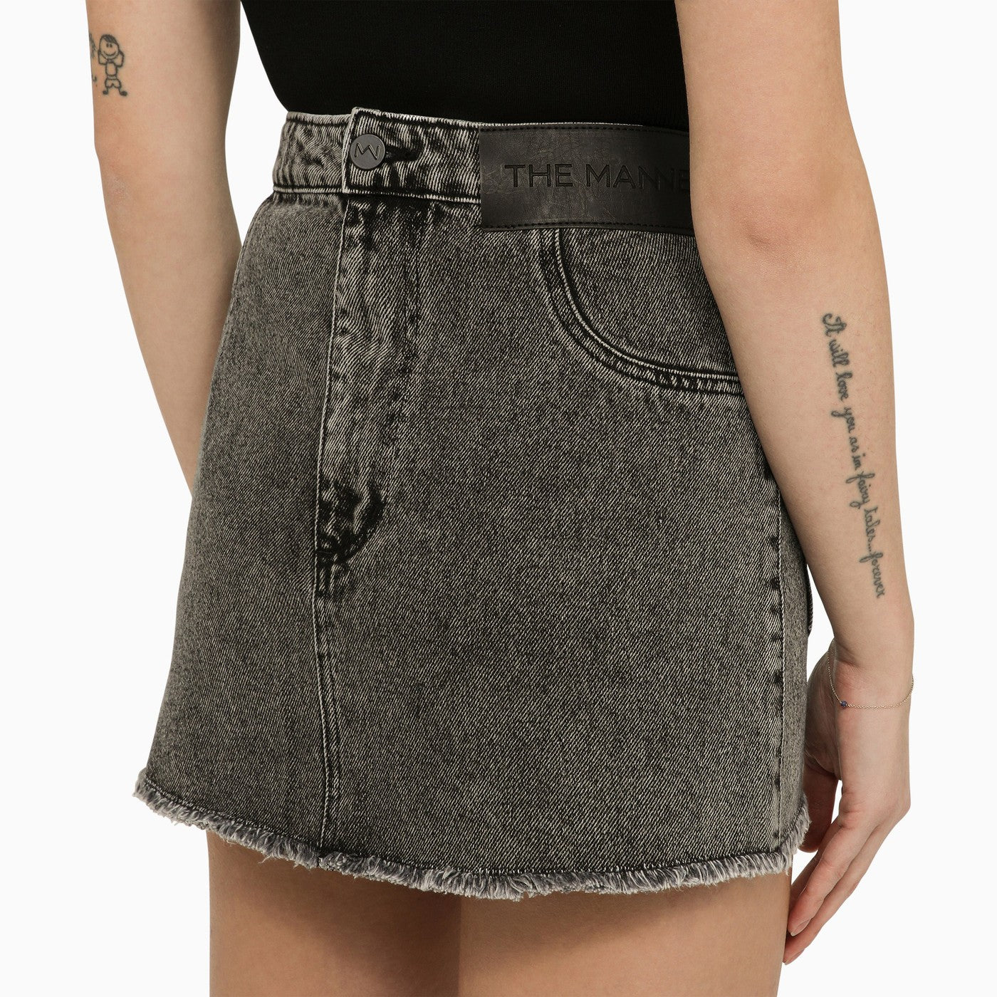 Mini gonna di denim in cotone grigio dei mannei, con un design interno, zip posteriore e fissaggio a pulsante logo, due tasche a marcia posteriore con patch logo, cicli a cinghia, fessura anteriore e due tasche per patch anteriori.