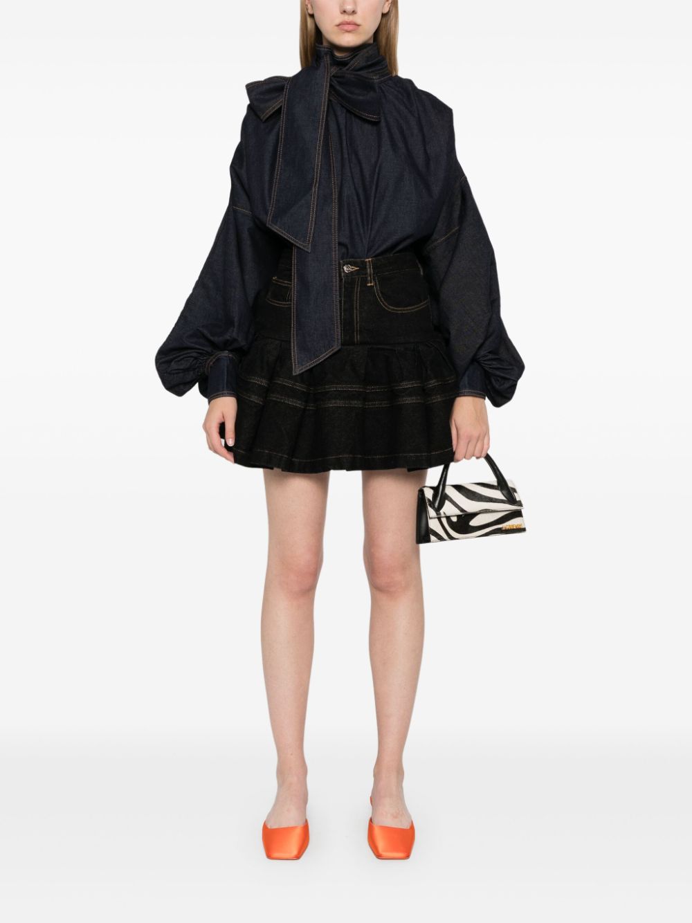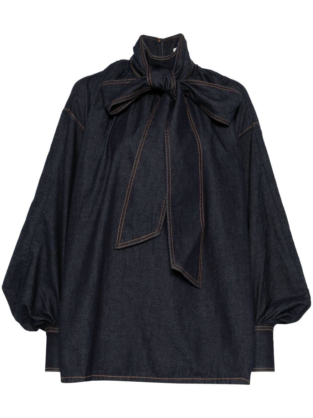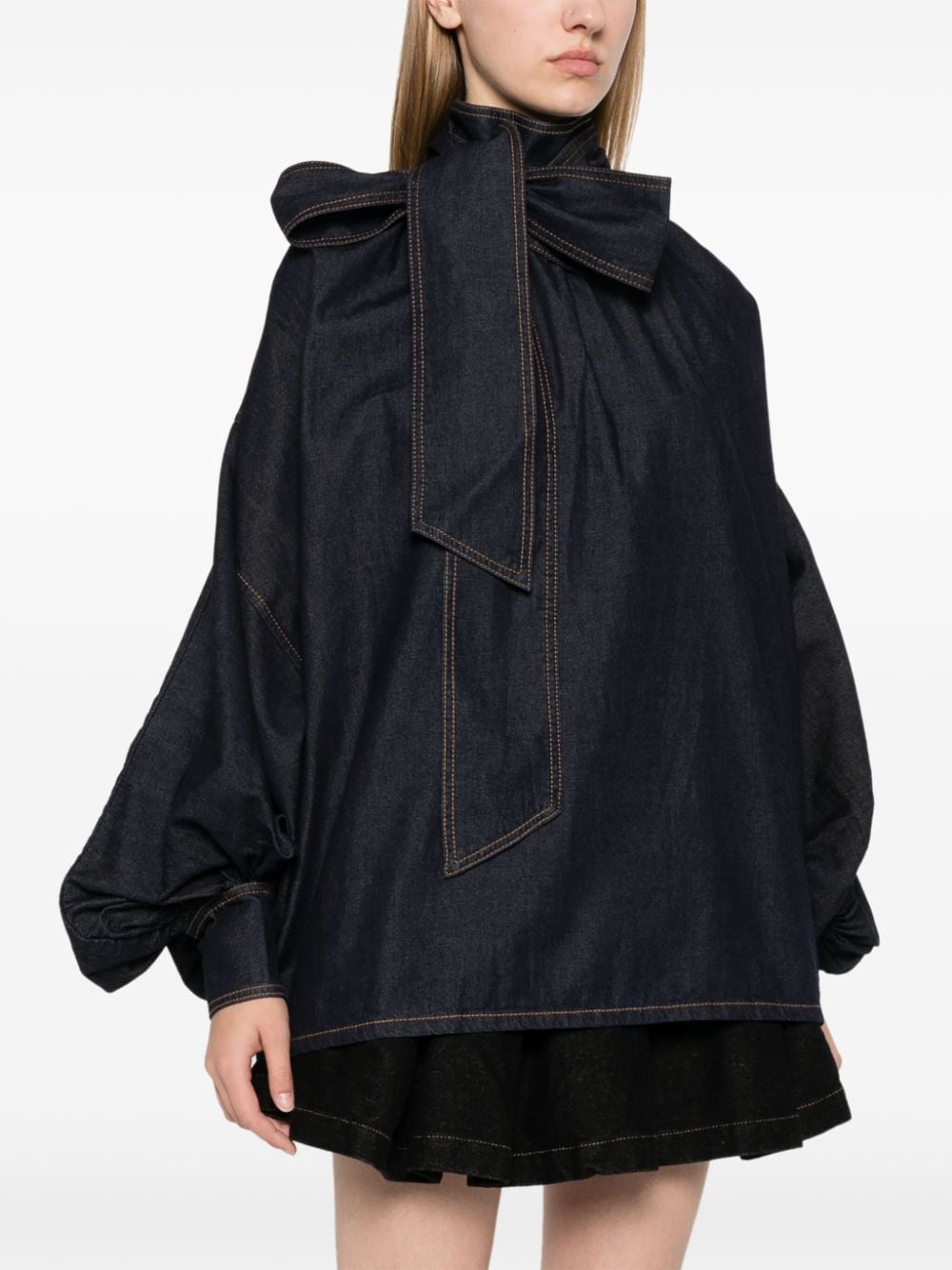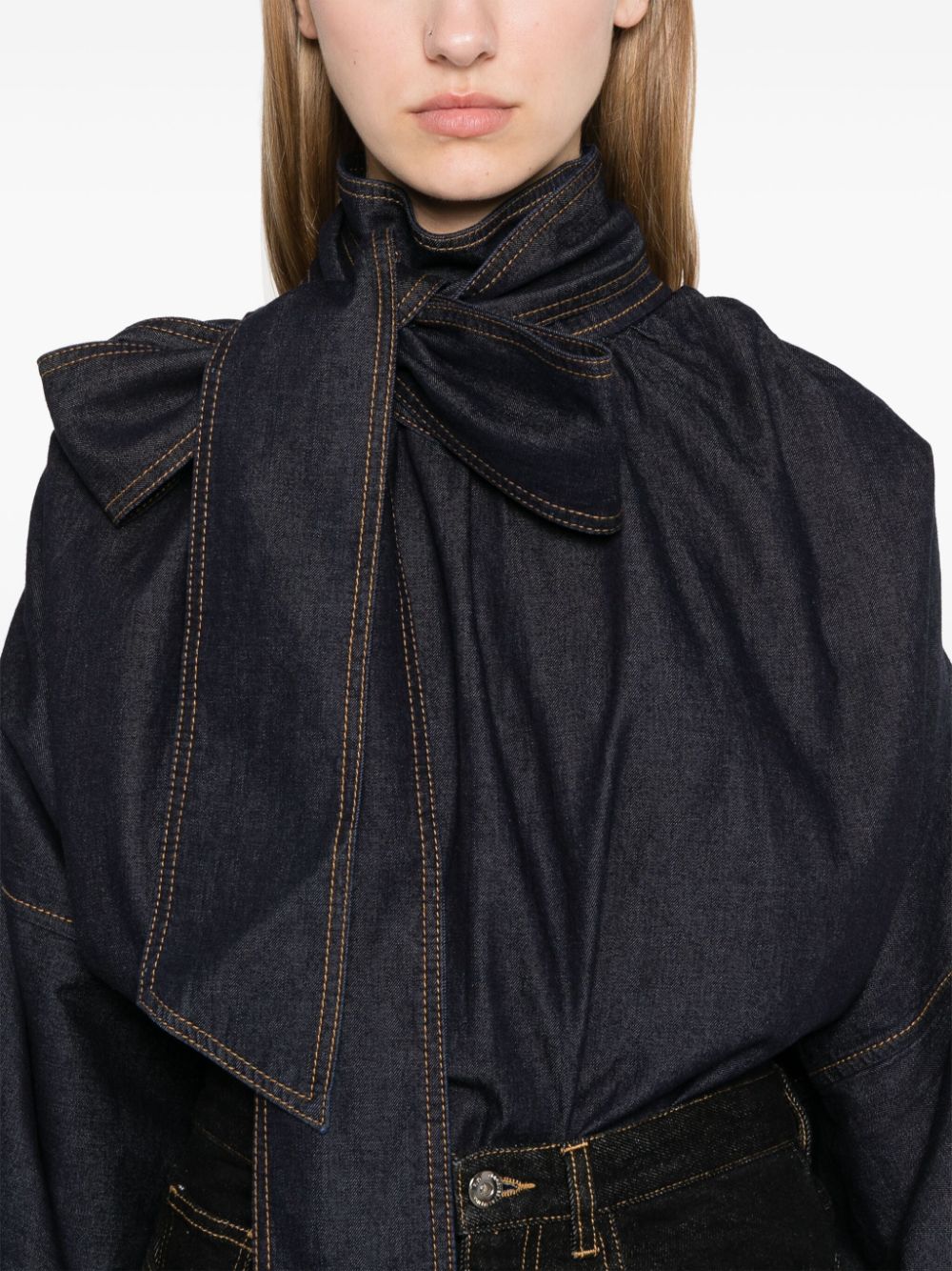Midnight Blue Cotton Denim Conclati di fissaggio posteriore Concesso di fissaggio a contrasto Halterneck Fissaggio a maniche lunghe con maniche abbottonate