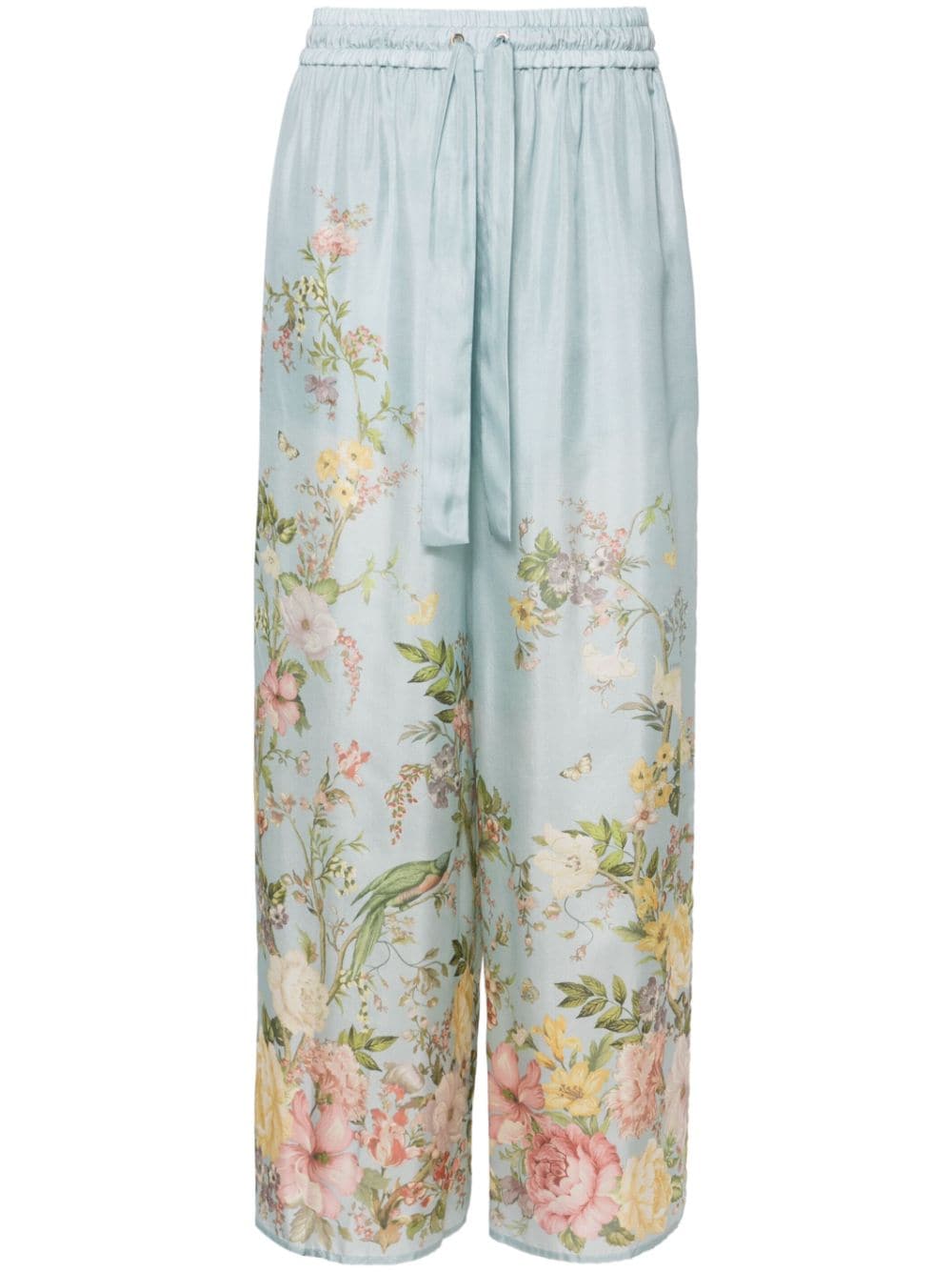 Finitura in raso in seta blu/multicolour Finitura floreale All-Over Flora pressata piega alta in vita elasticata elastica con due tasche a fessura laterale palazzo design largo gamba