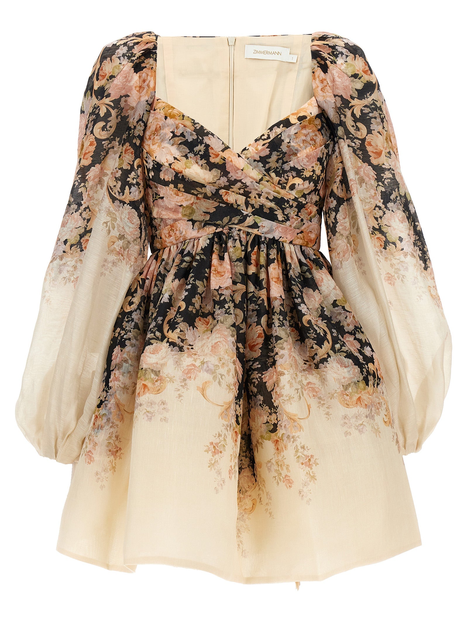 Abito da "Mini drappeggiato" in lino inameroso e miscela di seta, stampa floreale, scollatura a cuore, maniche lunghe e larghe con polsini elastici, tasche, chiusura a zip posteriore.