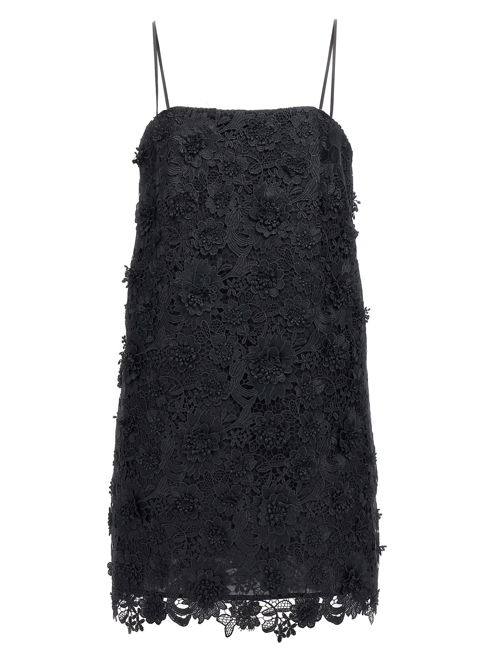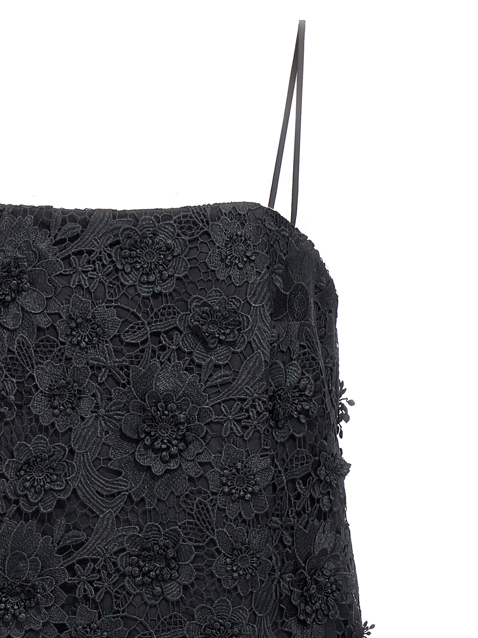 Abito in pizzo corto con sottili cinturini regolabili e chiusura della cerniera posteriore.