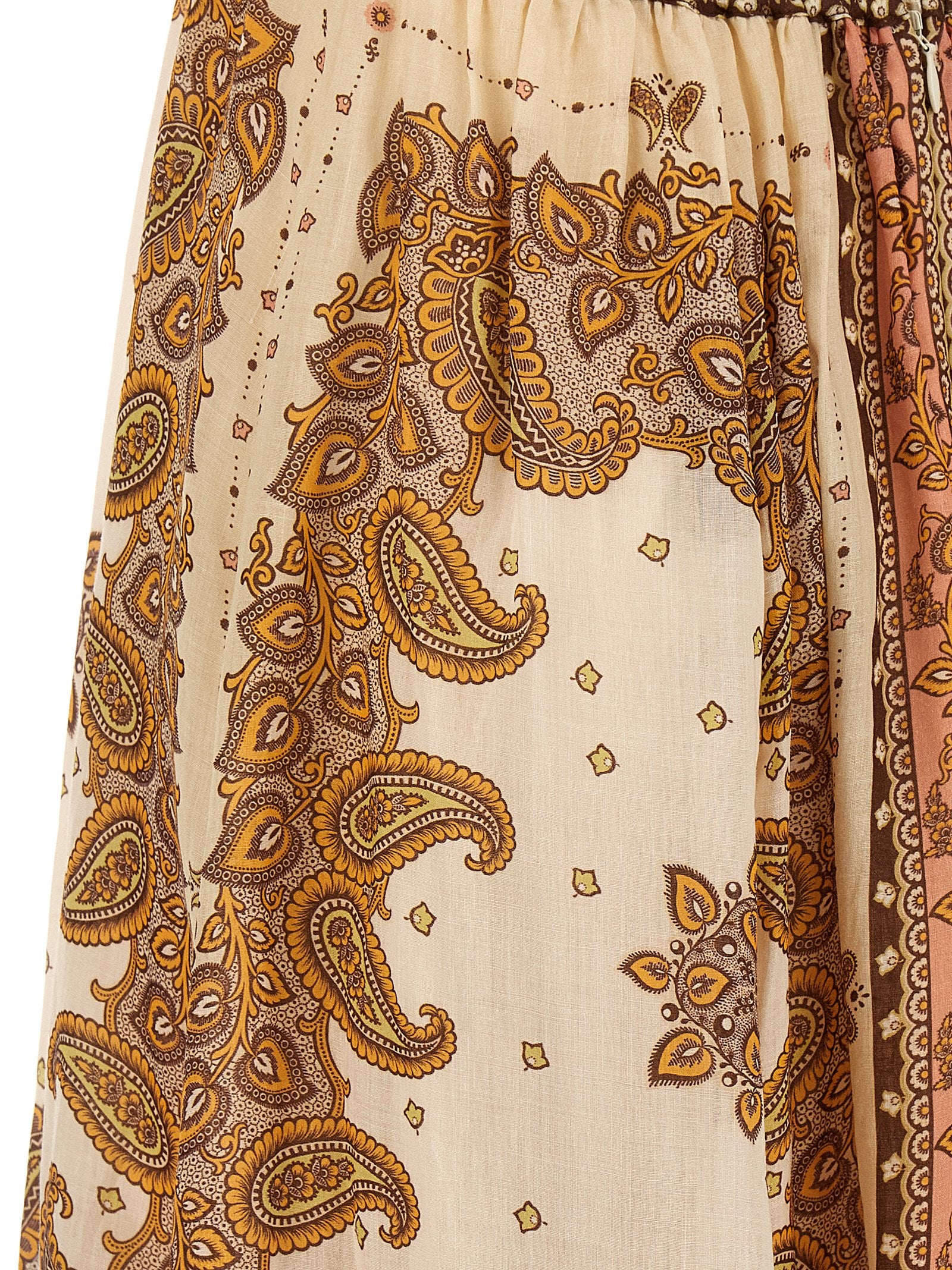 Abito ramie da stampato paisley arancione "Maxine Plunge Maxi con scollo a U profondo, stile senza maniche con sottili cinghie regolabili, dettagli ritagliati in vita, balza sull'orlo, gonna con chiusura zip posteriore, chiusura del gancio superiore sul retro.