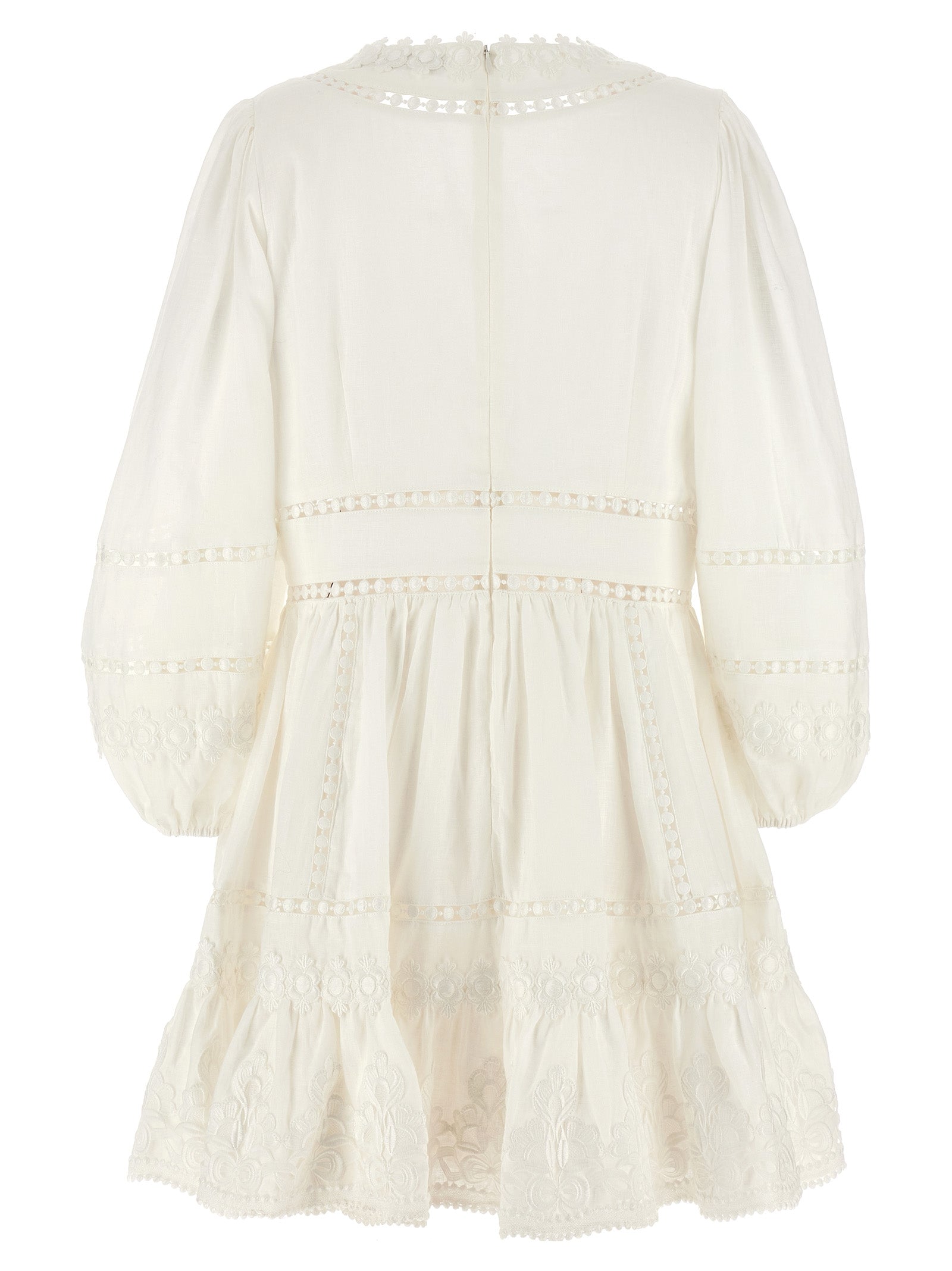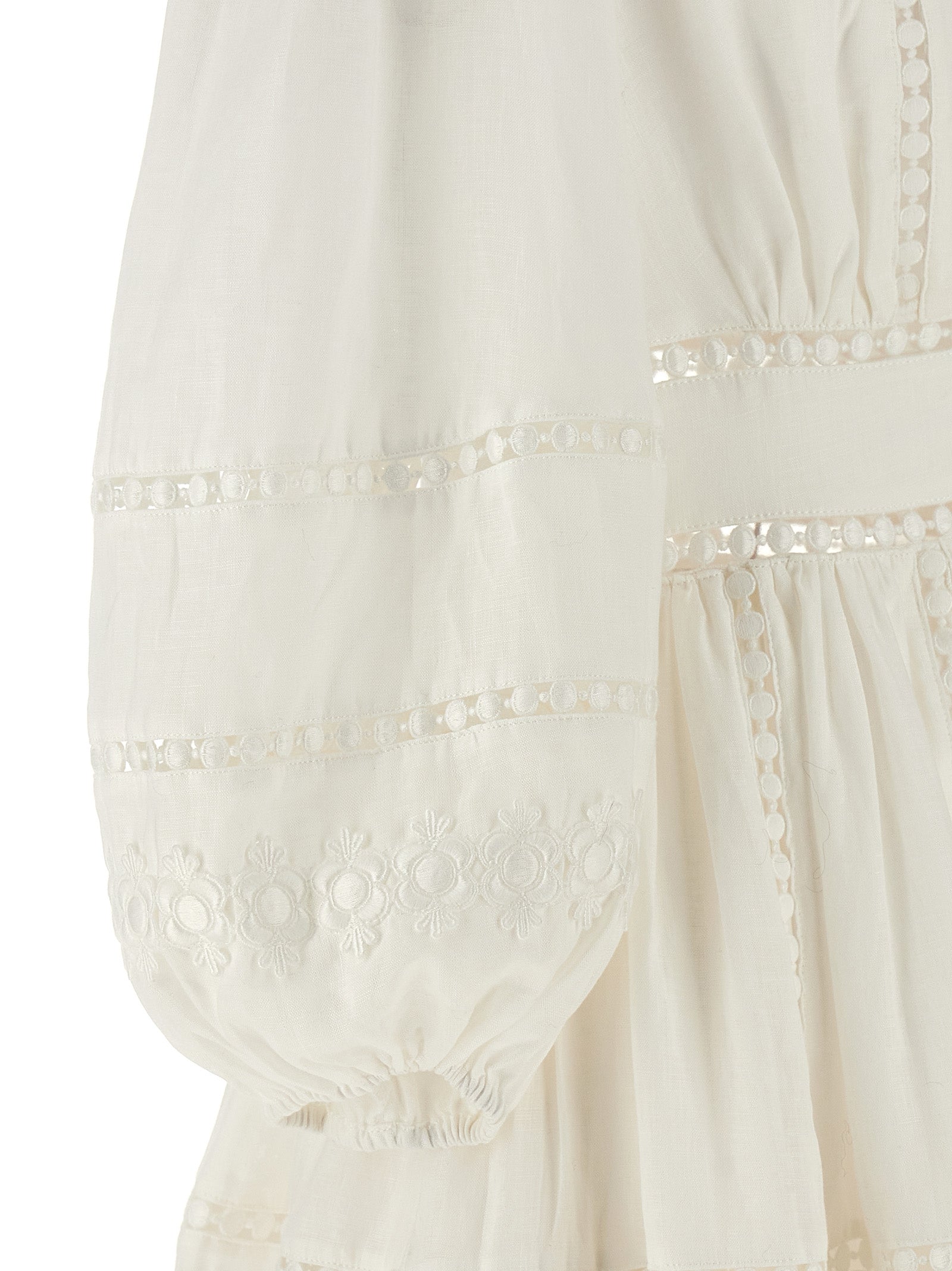 Abito di lino mini "tagliato a pop con ricamo, scollo a V, chiusura a zip posteriore, maniche lunghe con polsini elastici.
