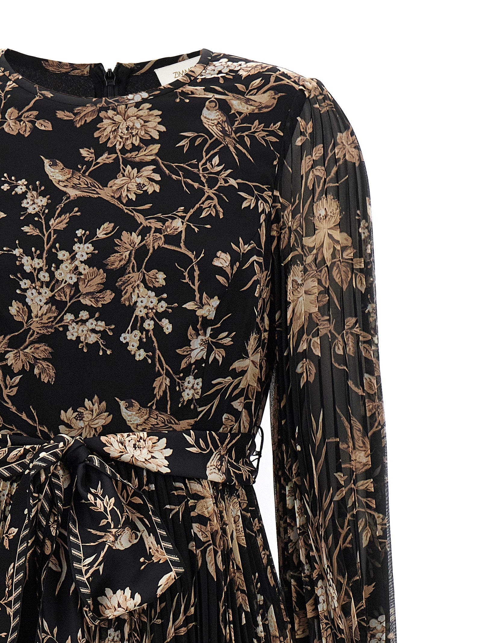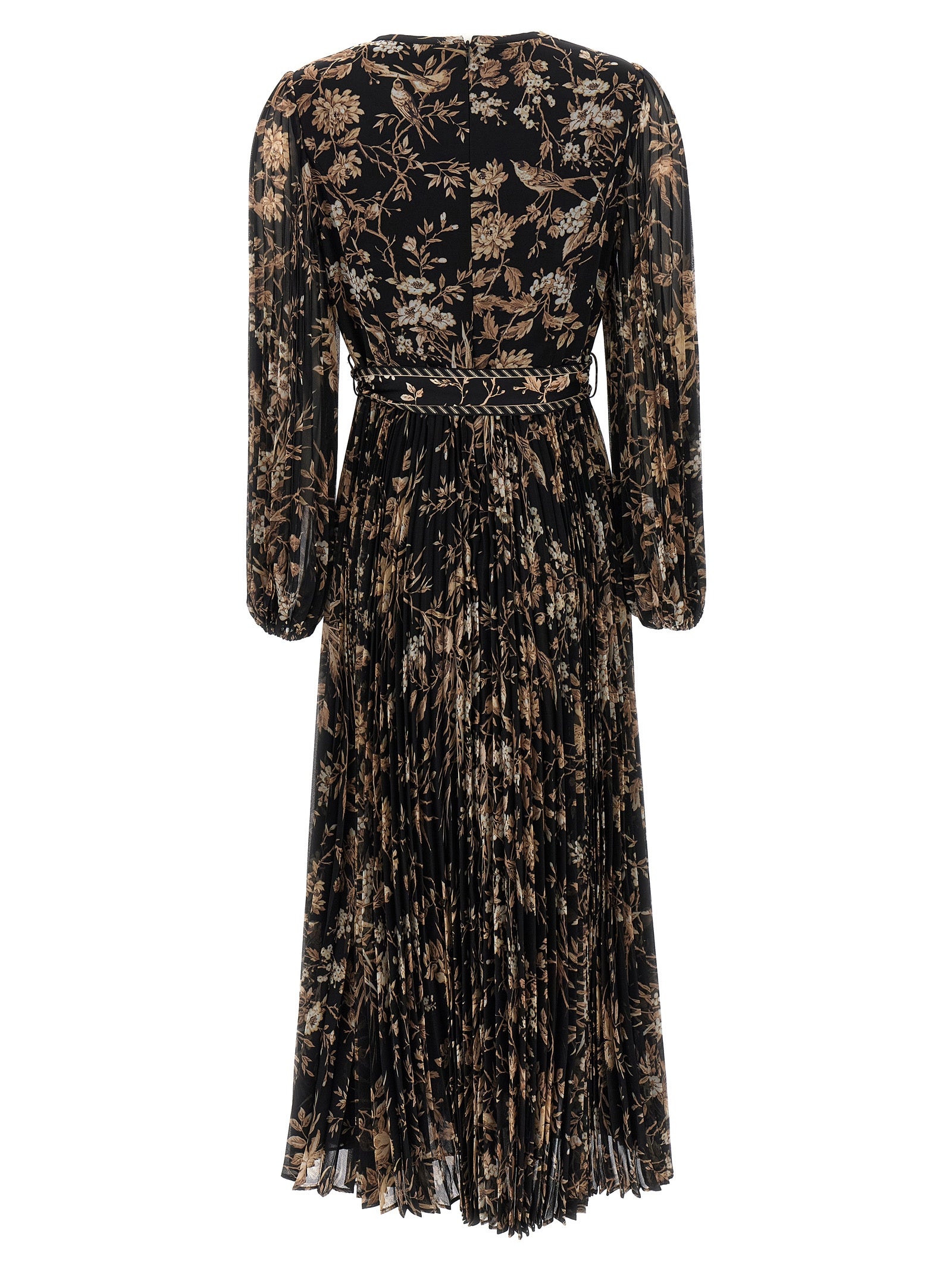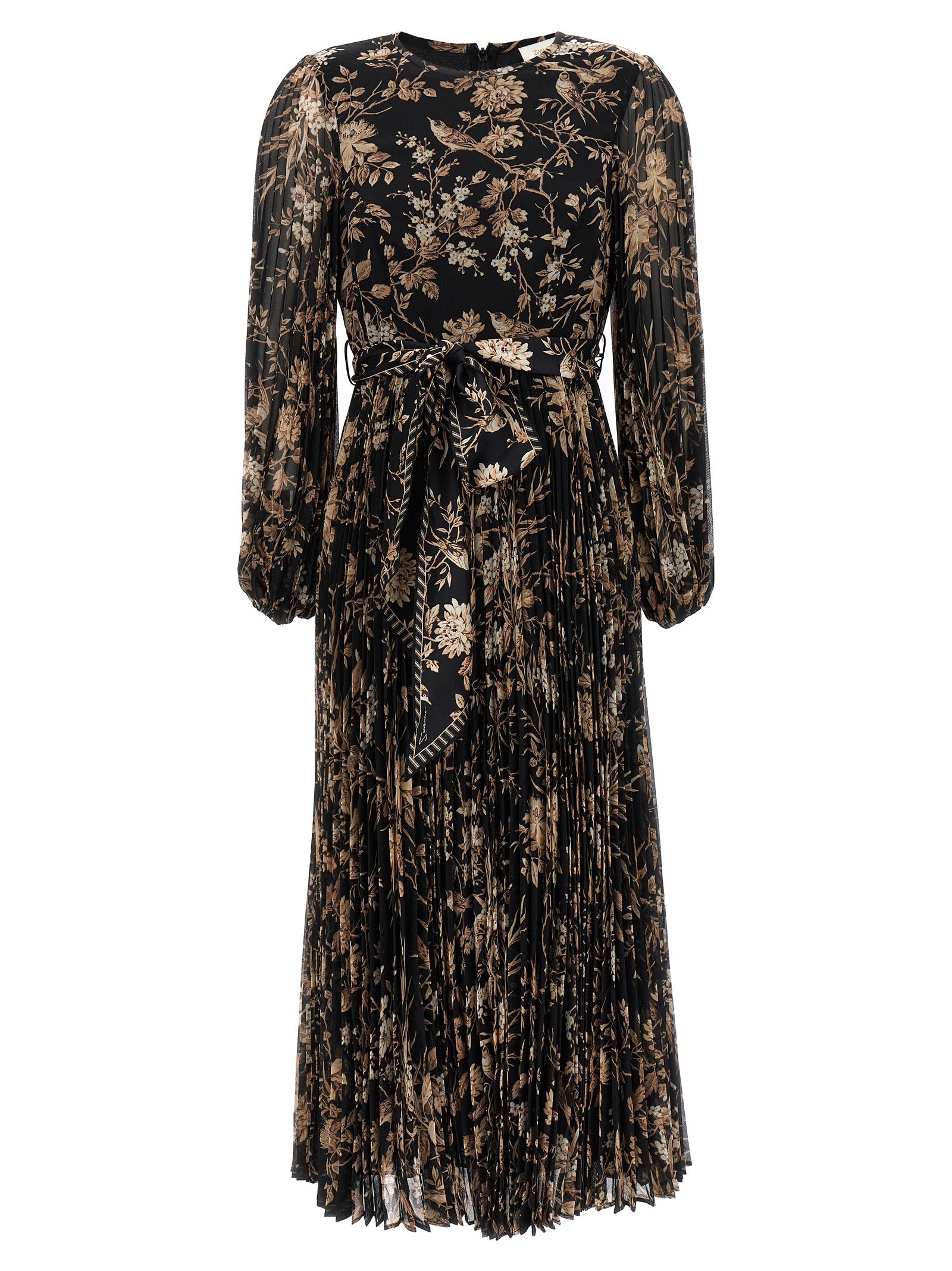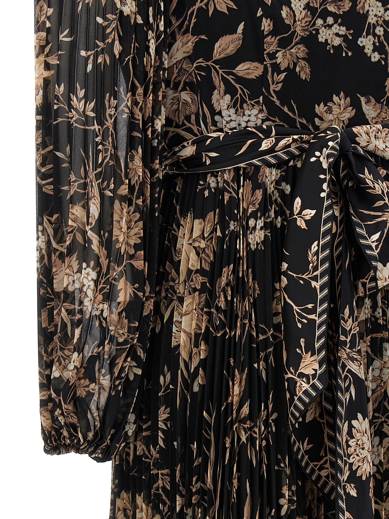 Abito "Sunray Midi" in tessuto a pieghe con stampa floreale, collo dell'equipaggio, maniche lunghe con polsini elastici, cintura abbinata in vita, chiusura a zip posteriore.