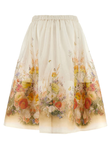 Gonna midi "tranquillità" in miscela di cotone e seta, sottogruppo, stampa floreale, cintura elastica.
